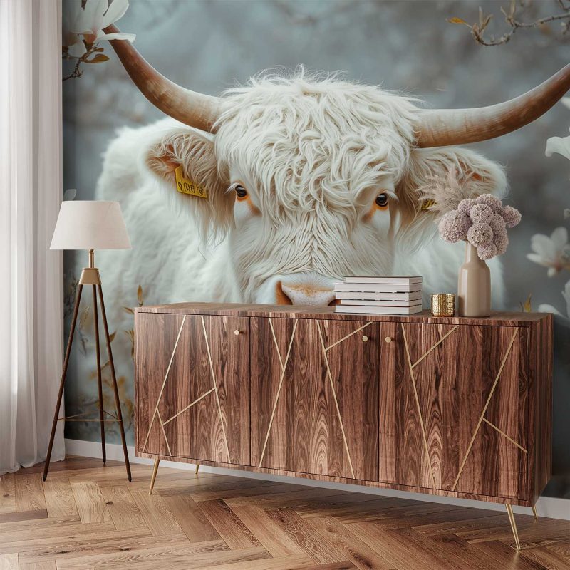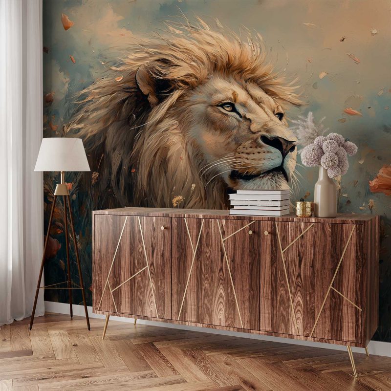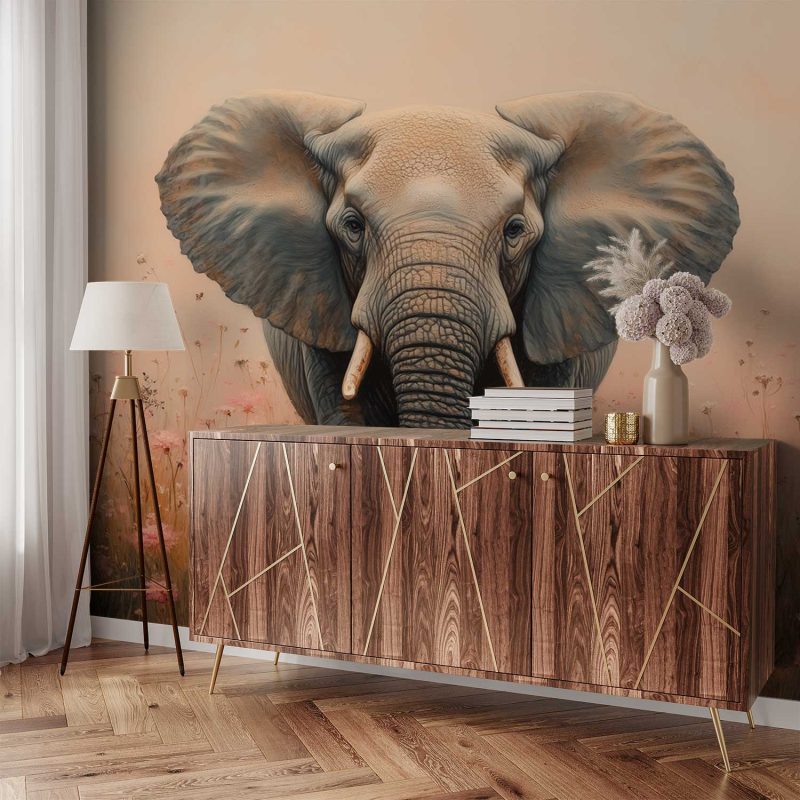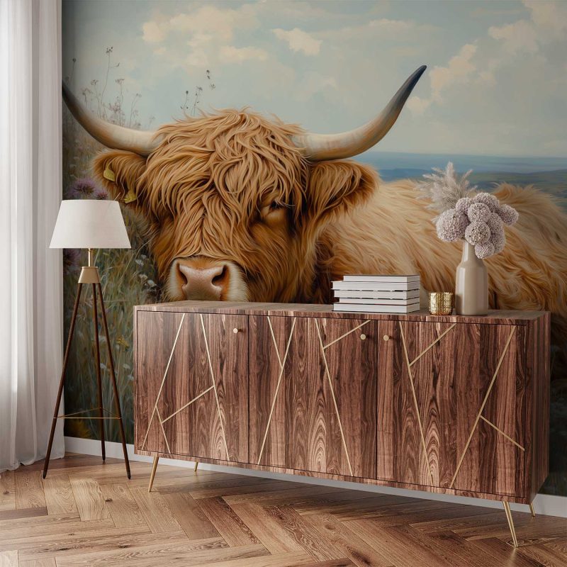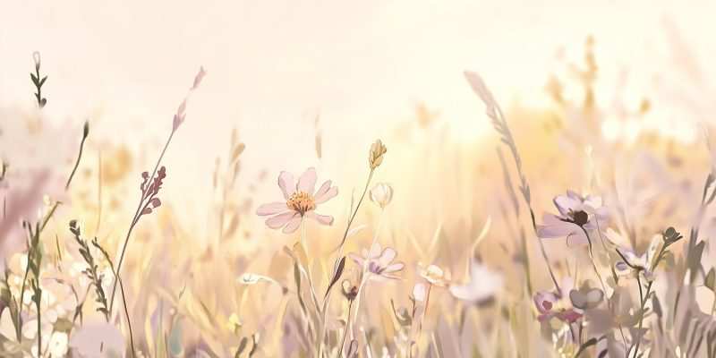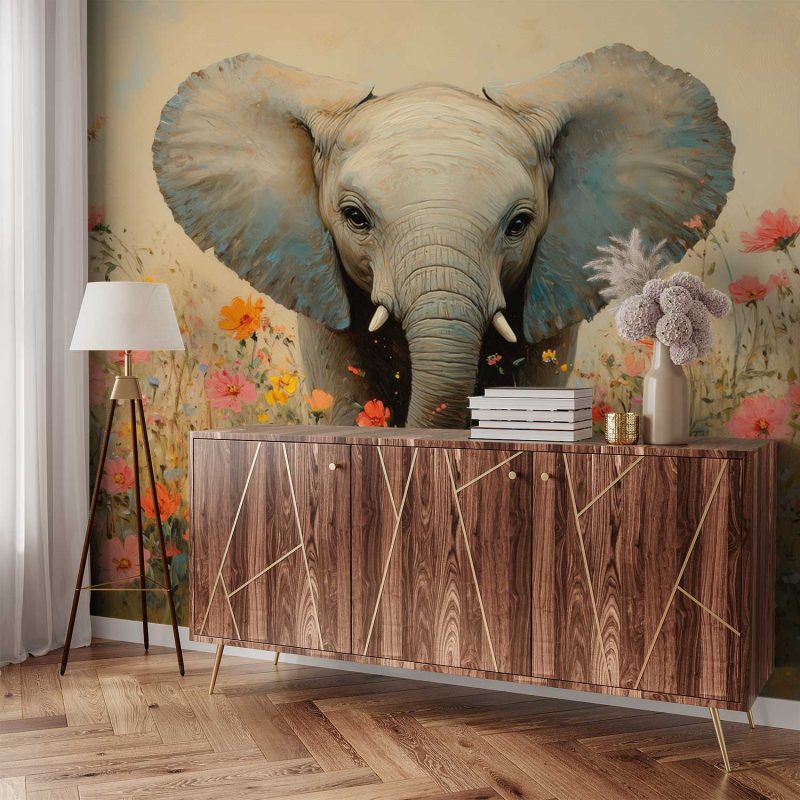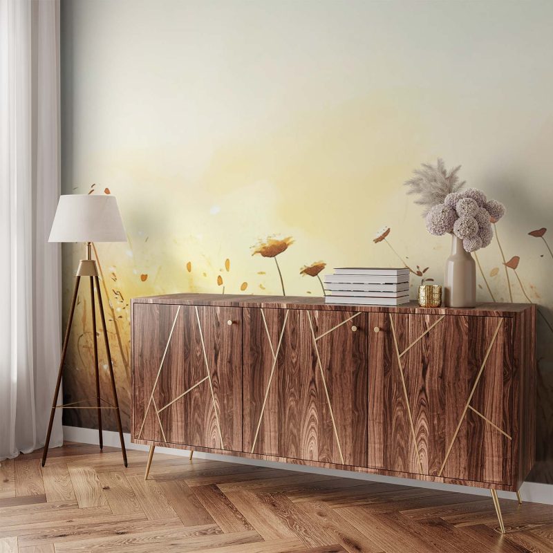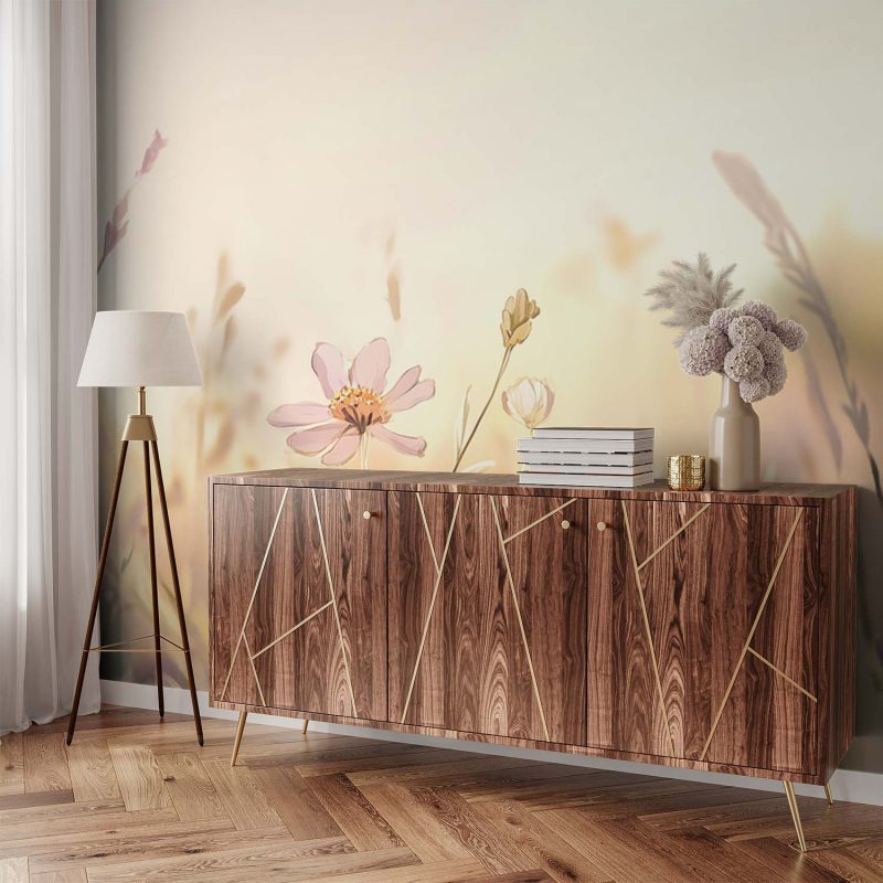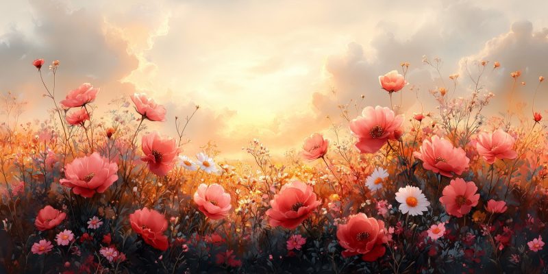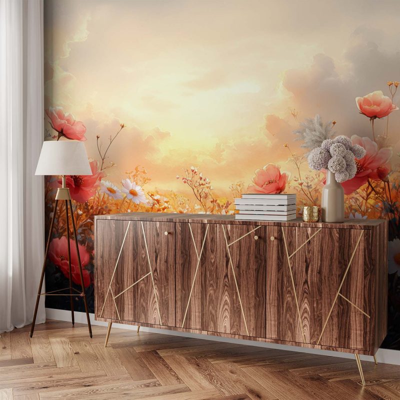 Kleurrijk bloemenveld onder wolkenlucht behang