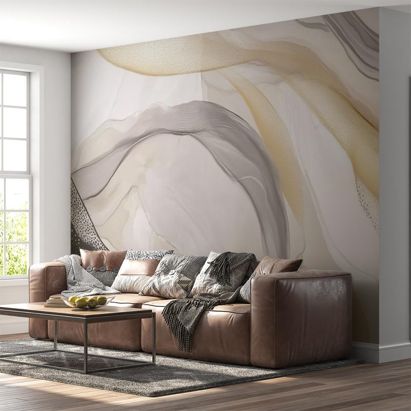 Vloeiende bewegingen in grijstinten dansen over het behang, verlicht door subtiele gouden accenten. Deze abstracte compositie ademt rust en sereniteit, perfect om een ruimte te voorzien van moderne elegantie en diepte. Zijn kalme energie nodigt uit tot bezinning en creëert een harmonieuze achtergrond die zowel verfijnd als tijdloos aanvoelt in elk interieur.