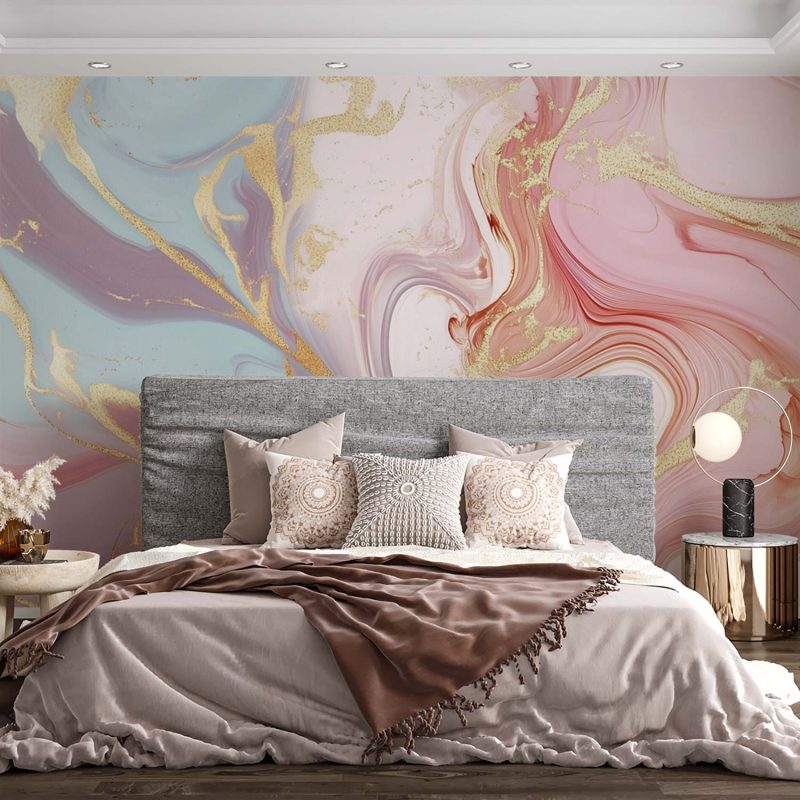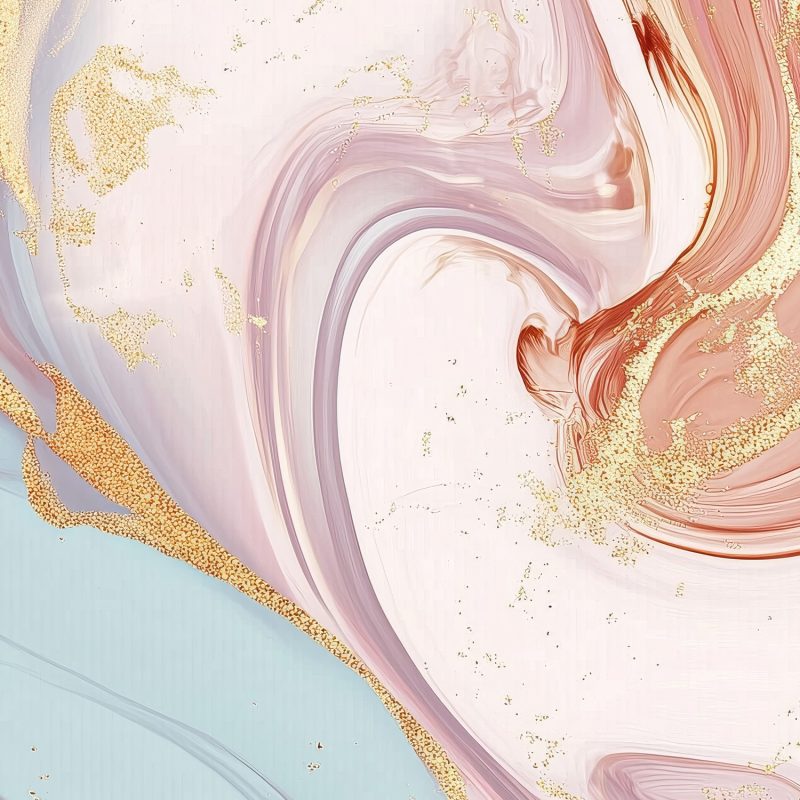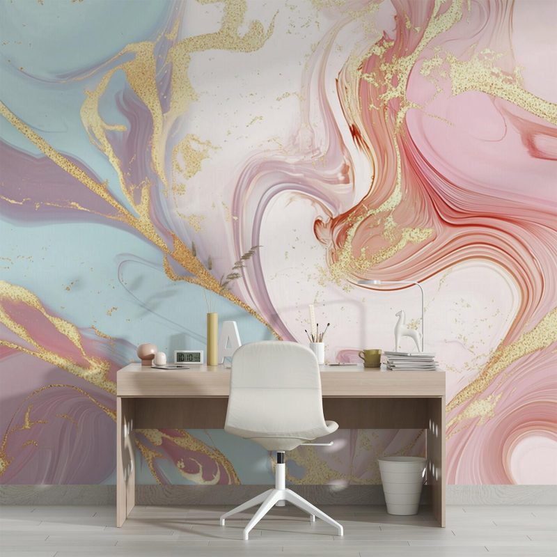 Vloeibaar marmer danst in een speelse werveling van roze, blauw en wit. Deze abstracte stroom van kleur brengt levendige beweging en harmonie in je ruimte. De speelse patronen wekken nieuwsgierigheid en verwondering op, terwijl het kleurenpalet een gevoel van balans creëert. Perfect voor wie verfijnde dynamiek zoekt zonder herkenbare vormen.