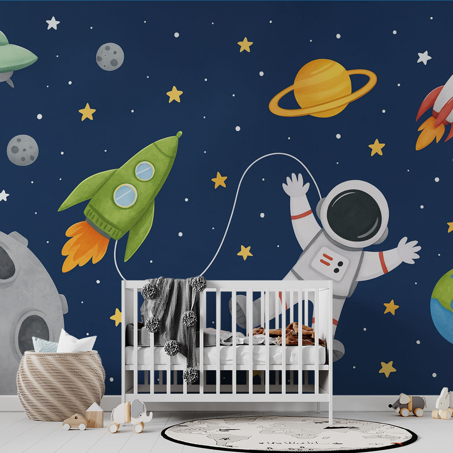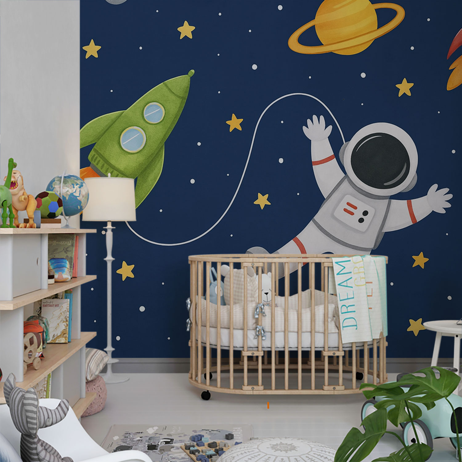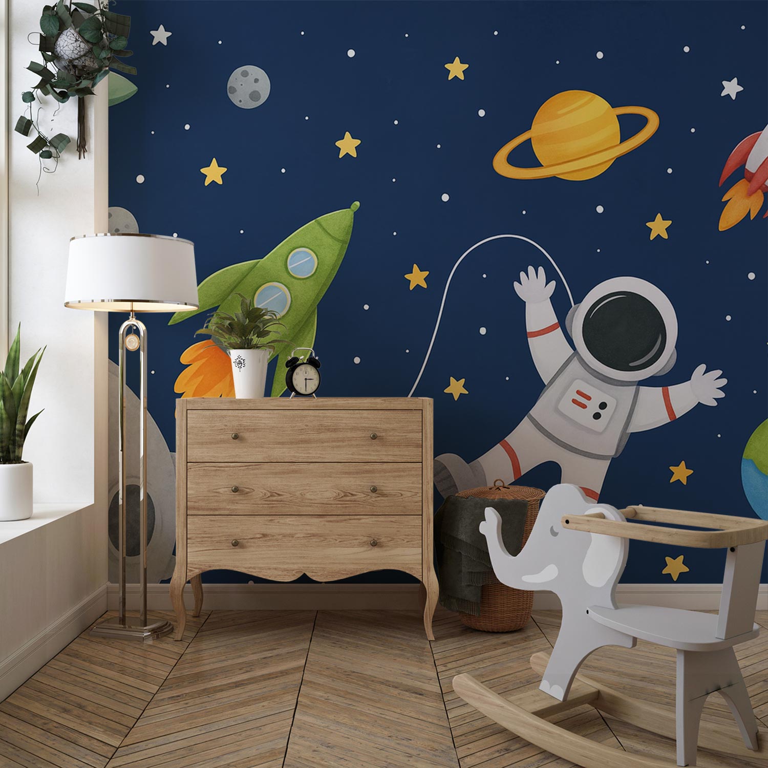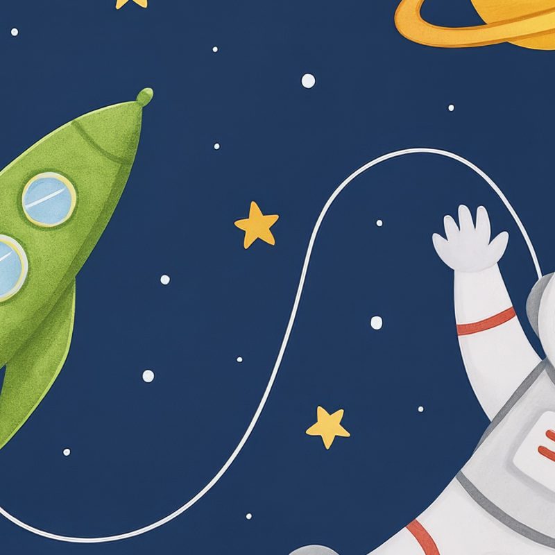 Astronaut met groene raket behang
