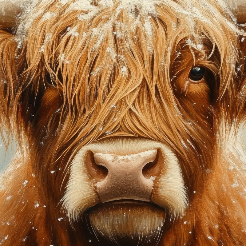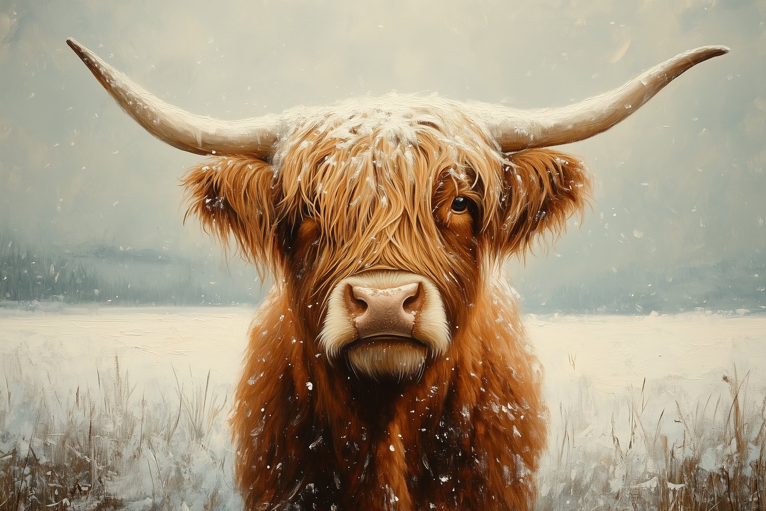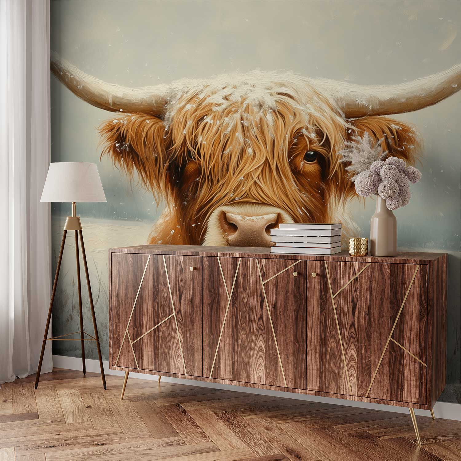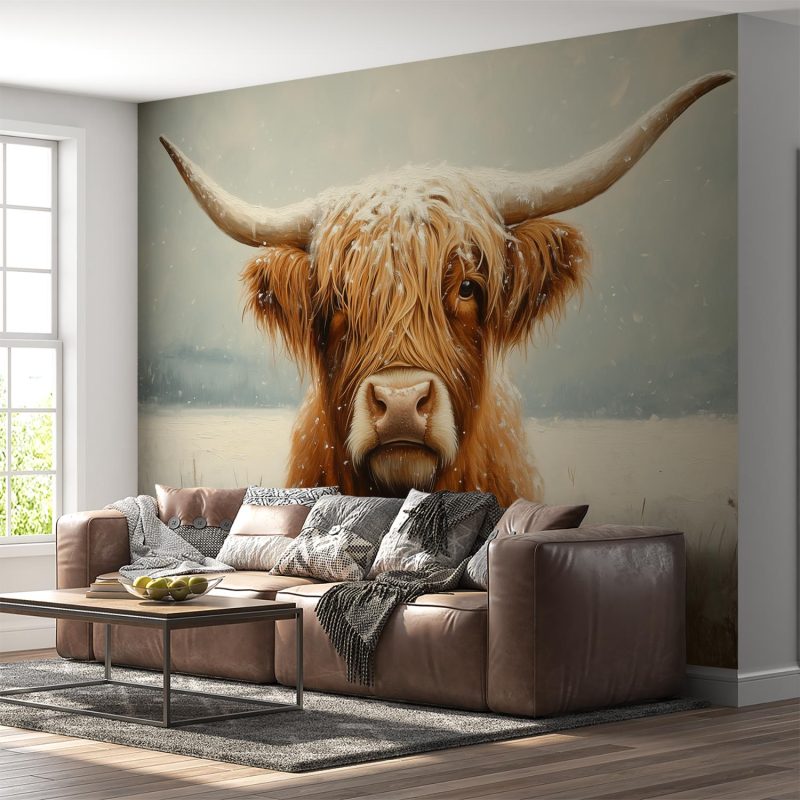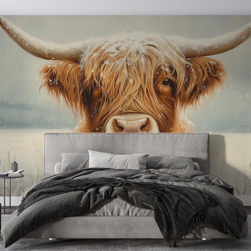 Sneeuwvlokken dwarrelen zachtjes op de vacht van deze imposante Schotse hooglander. Zijn doordringende blik en met sneeuw bedekte horens roepen een serene wintersfeer op. De warme bruine tinten contrasteren prachtig met het witte landschap, waardoor dit behang een rustgevend en natuurlijk accent vormt in elk interieur. Breng de stille majesteit van de Highlands naar je woonkamer.
