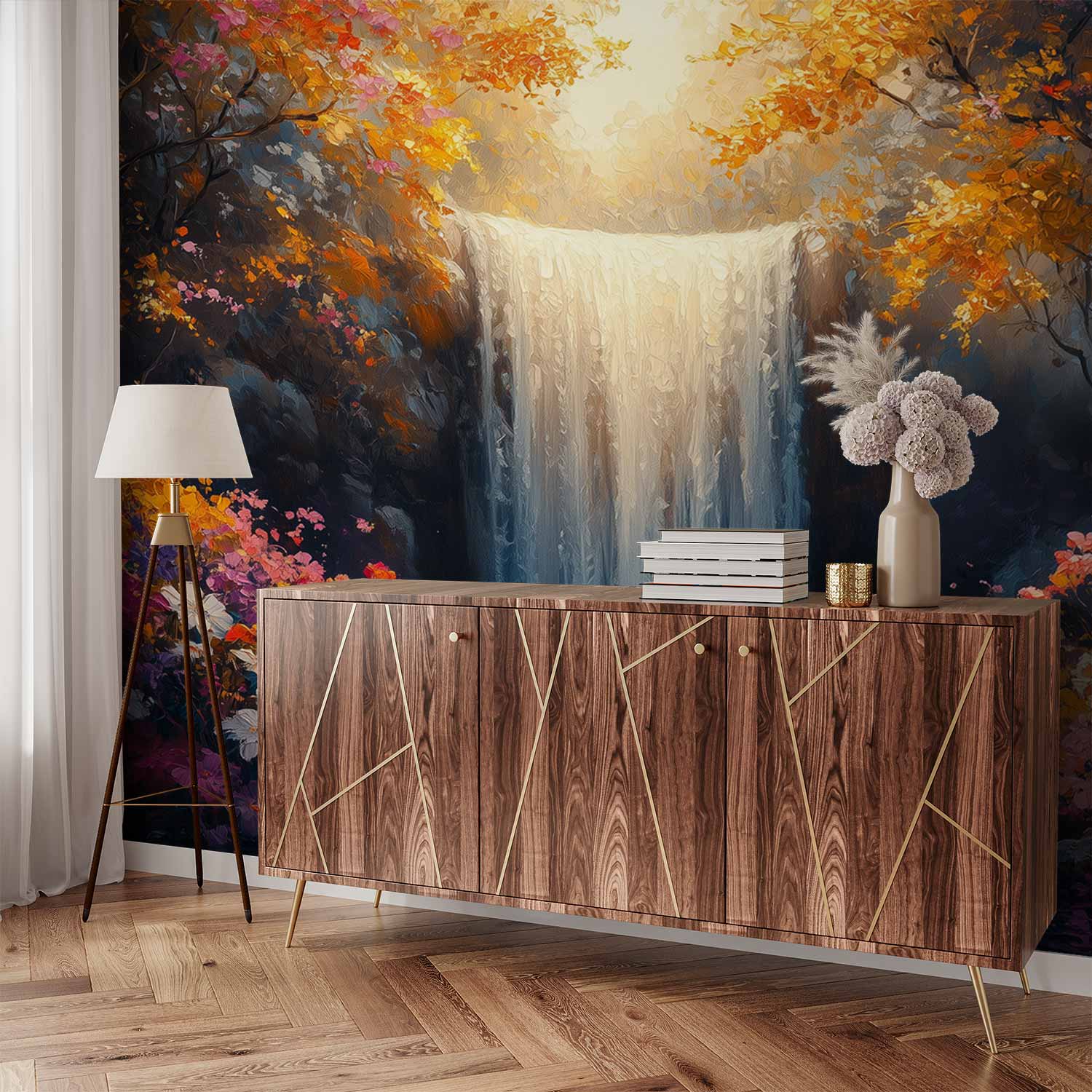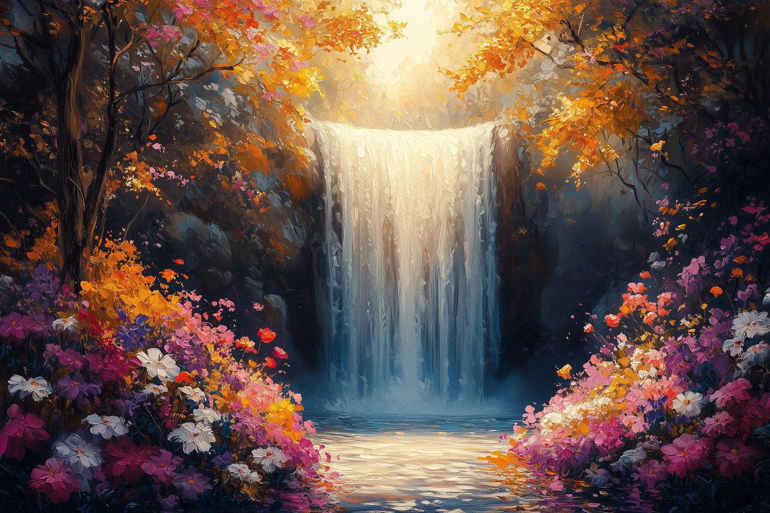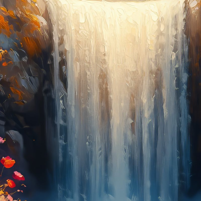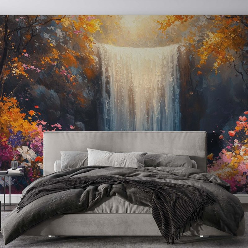 Stralend licht schijnt op de waterval die levendig naar beneden stort, omringd door weelderig groen. Warme tinten oranje en geel dansen tussen de diepe blauwen en creëren een betoverende harmonie. Dit levendige tafereel brengt de rustgevende kracht van de natuur in huis, perfect voor een serene sfeer in elke ruimte.