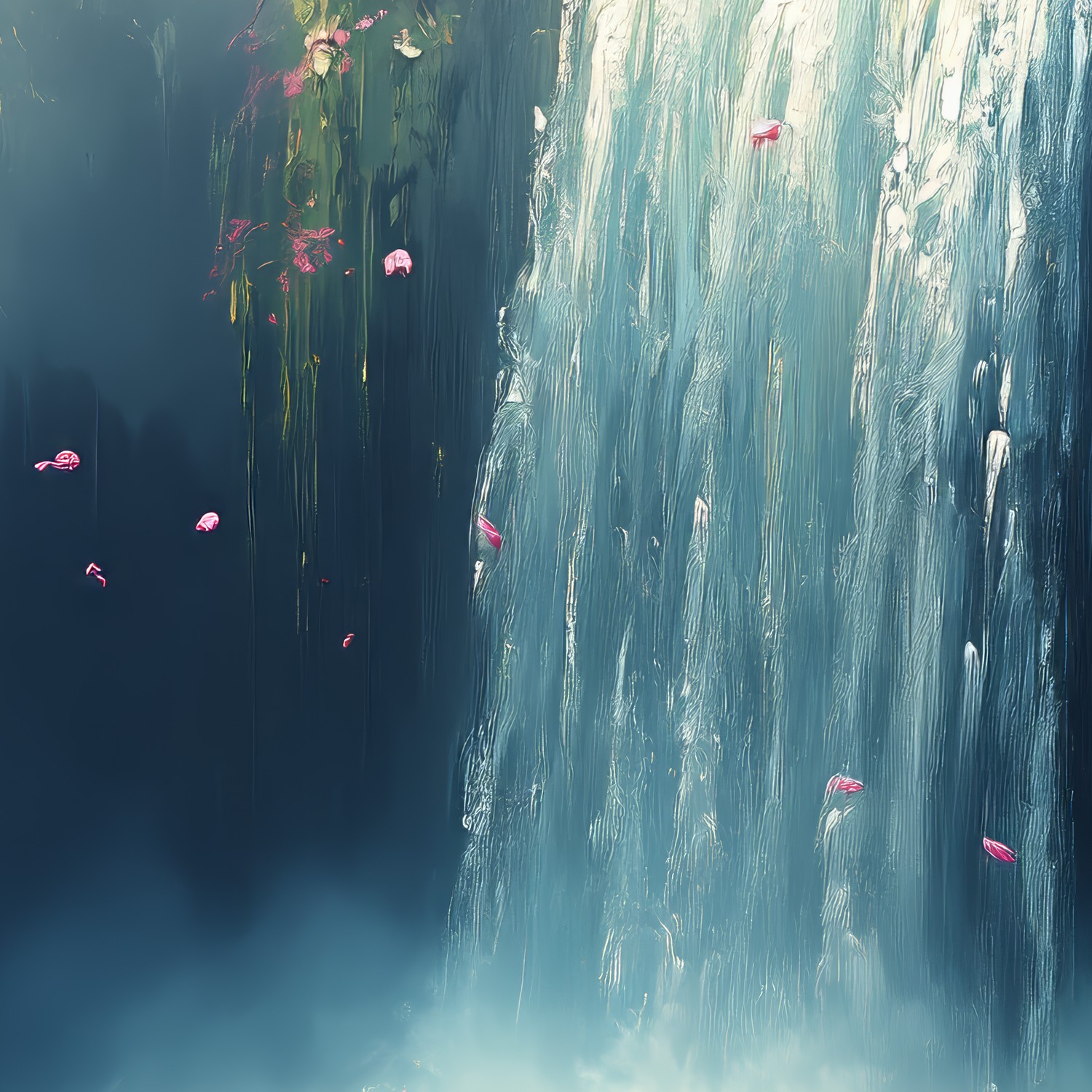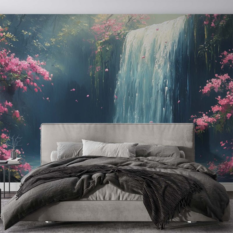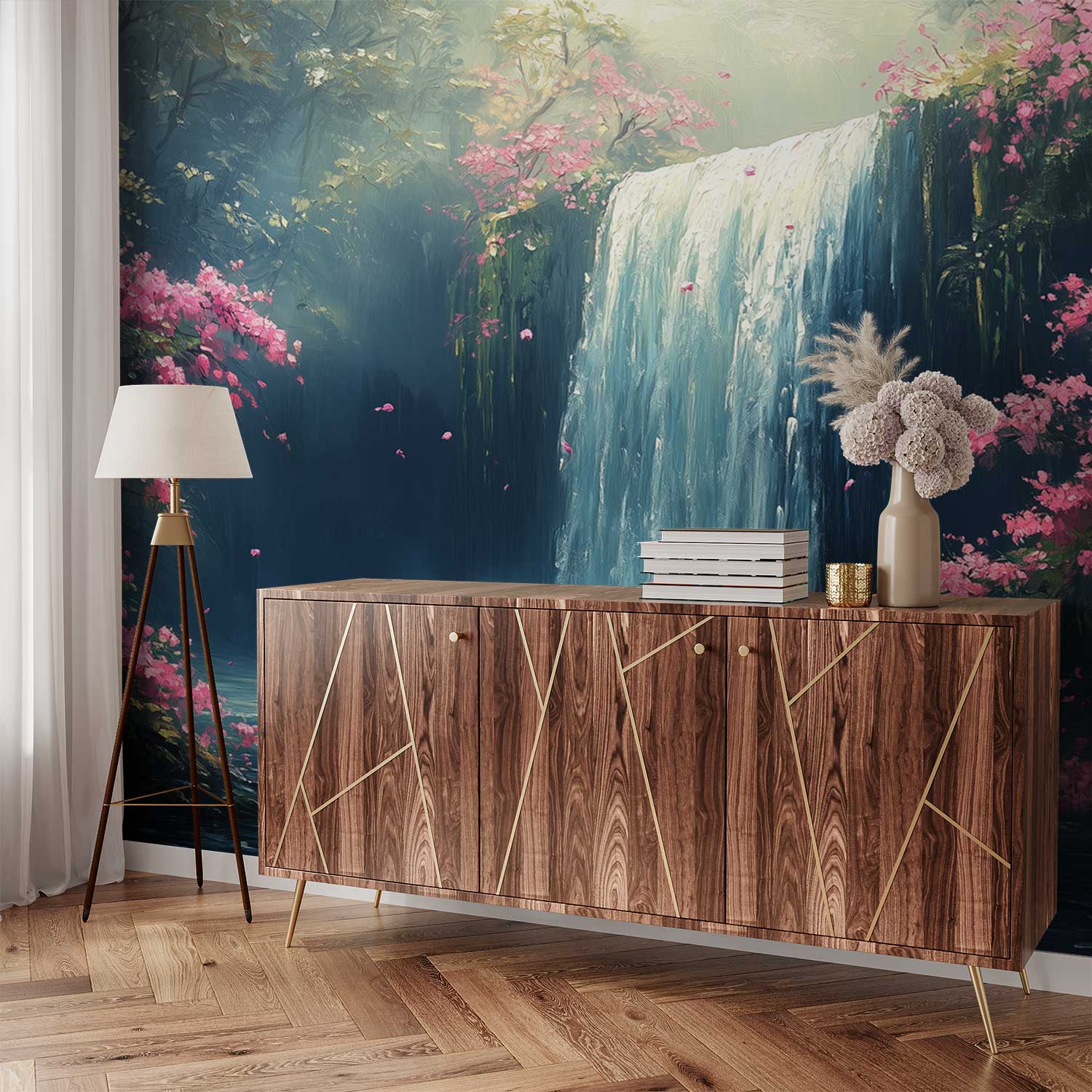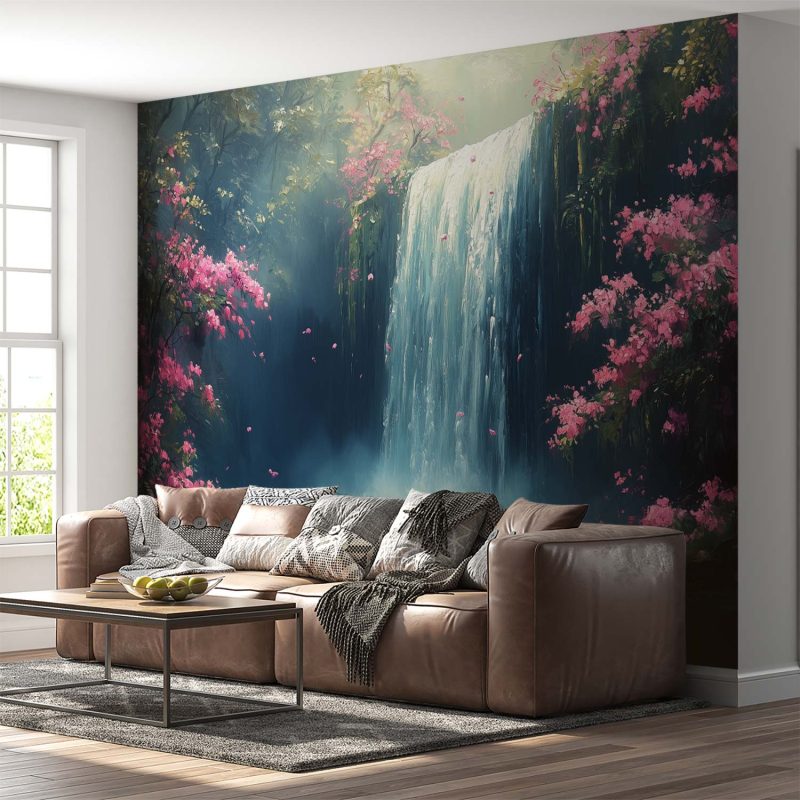 Verfrissende watervalstromen dansen tussen weelderig groen en zachte roze tinten. Dit levendige kunstwerk ademt rust en harmonie, alsof je zelf in de serene natuur staat. De kalmerende kleurenpalet brengt een gevoel van oneindige ontspanning in je ruimte. Perfect om elke muur te transformeren tot een oase van natuurlijke schoonheid en visuele rust.
