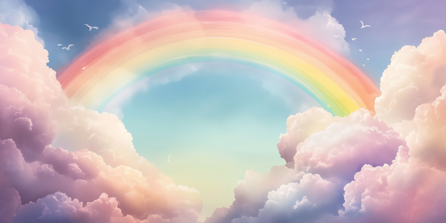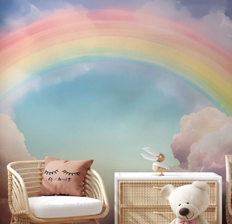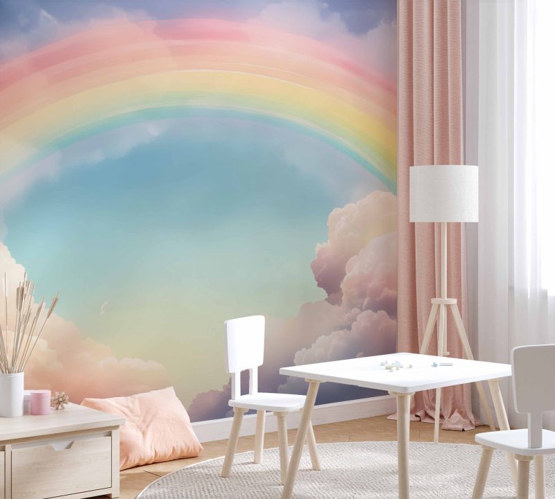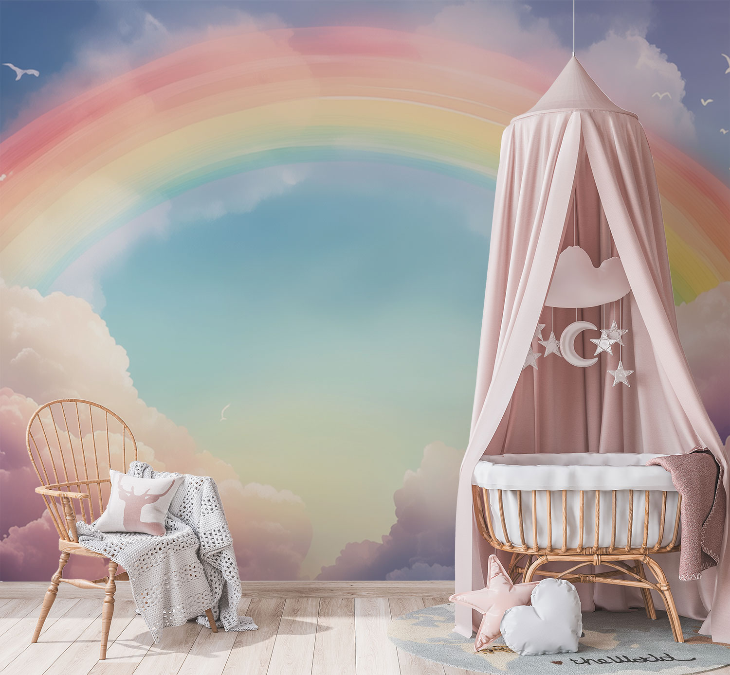 Vlieg mee op een kleurensymfonie! Een levendige regenboog danst door een zee van pluizige wolken, vol diepte en magie. Deze dromerige scène wekt verwondering en vreugde, perfect om de fantasie van je kind te prikkelen en de kamer te vullen met stralende, kalmerende energie.