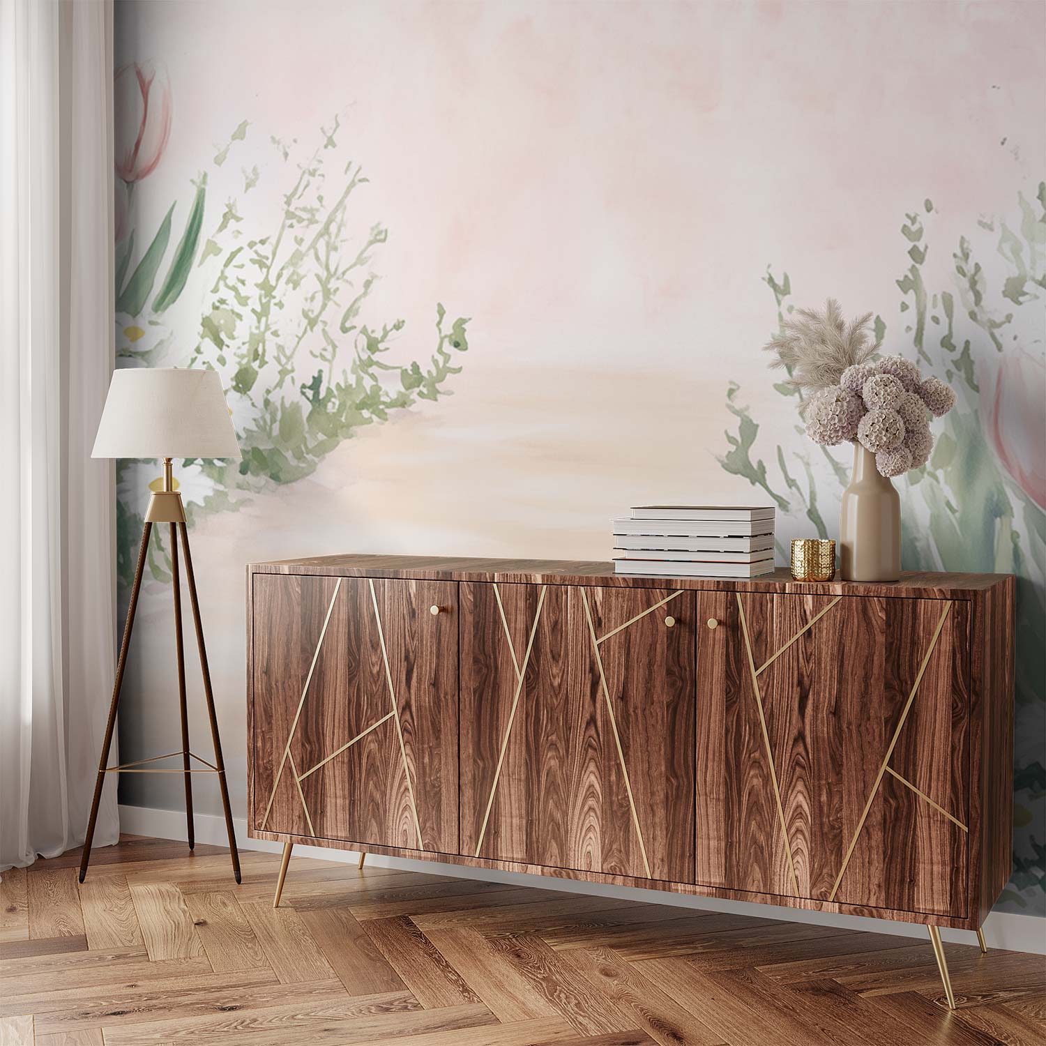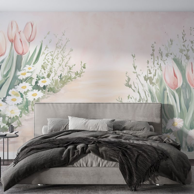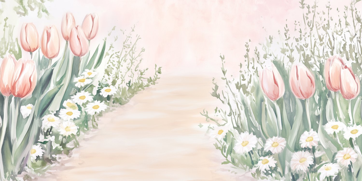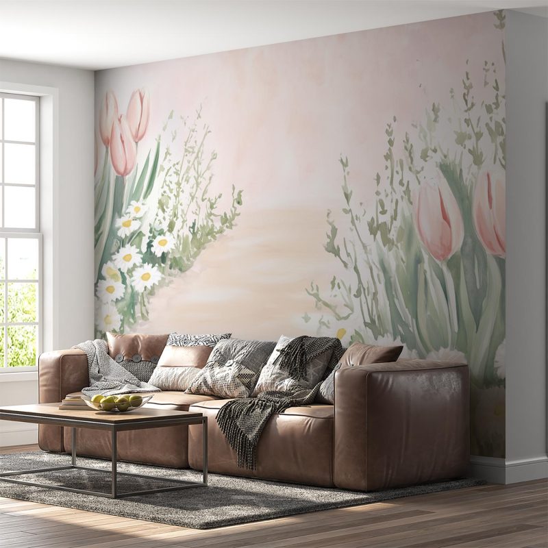 Verfrissend roze en wit dansen in deze levendige tuinscène. Slanke tulpen buigen zachtjes langs het pad, terwijl madeliefjes speels tussen hen door gluren. Je ogen volgen natuurlijk de weg die diepte creëert naar de horizon. Deze muur brengt de rustige sereniteit van een lentetuin naar binnen, perfect om elke kamer een gevoel van vrede en natuurlijke schoonheid te geven.