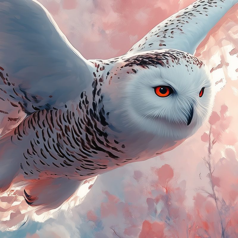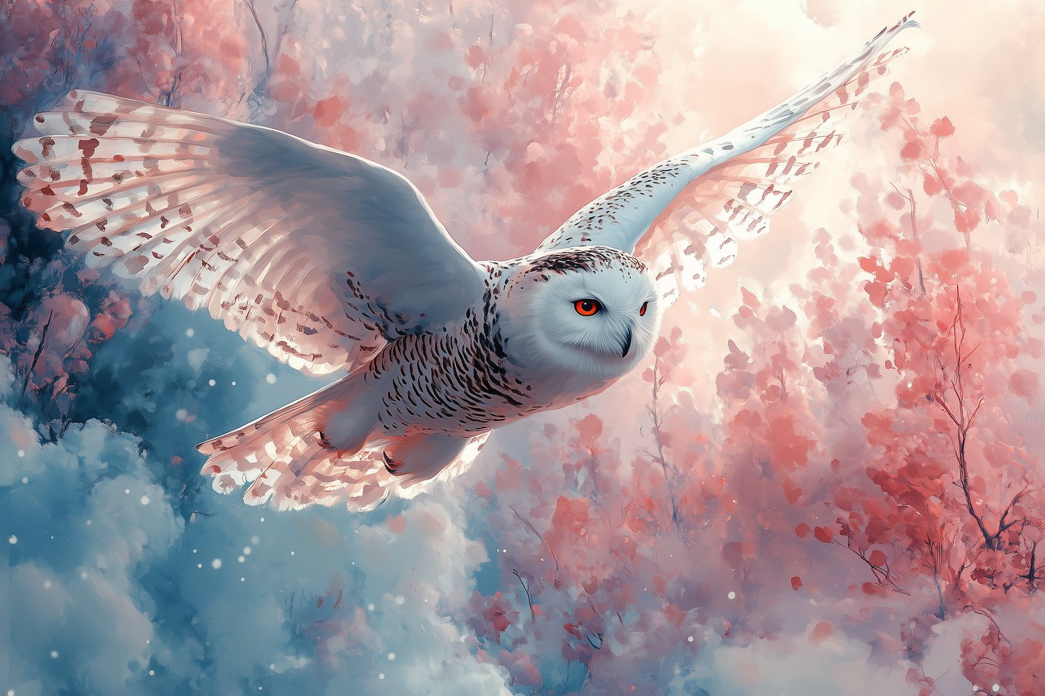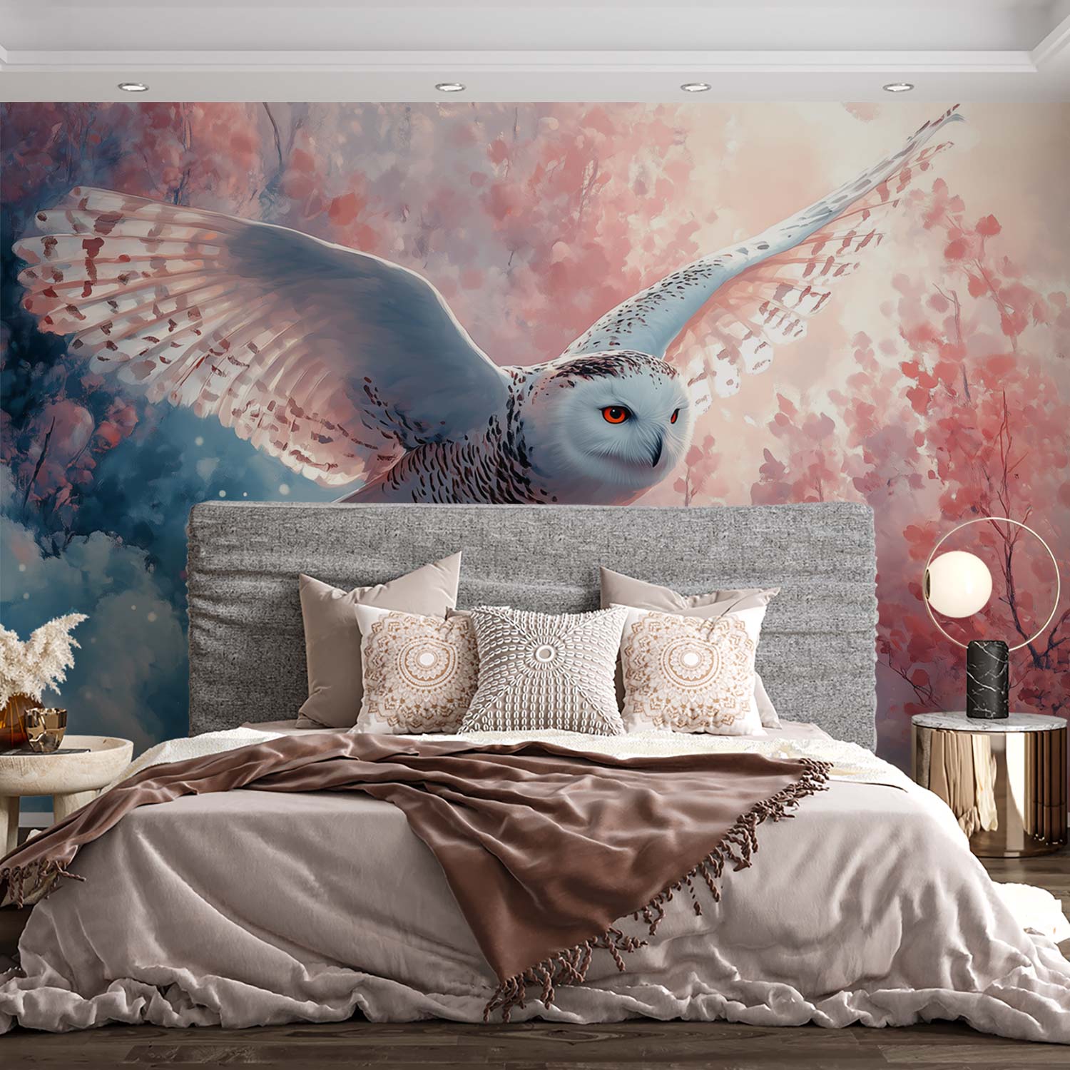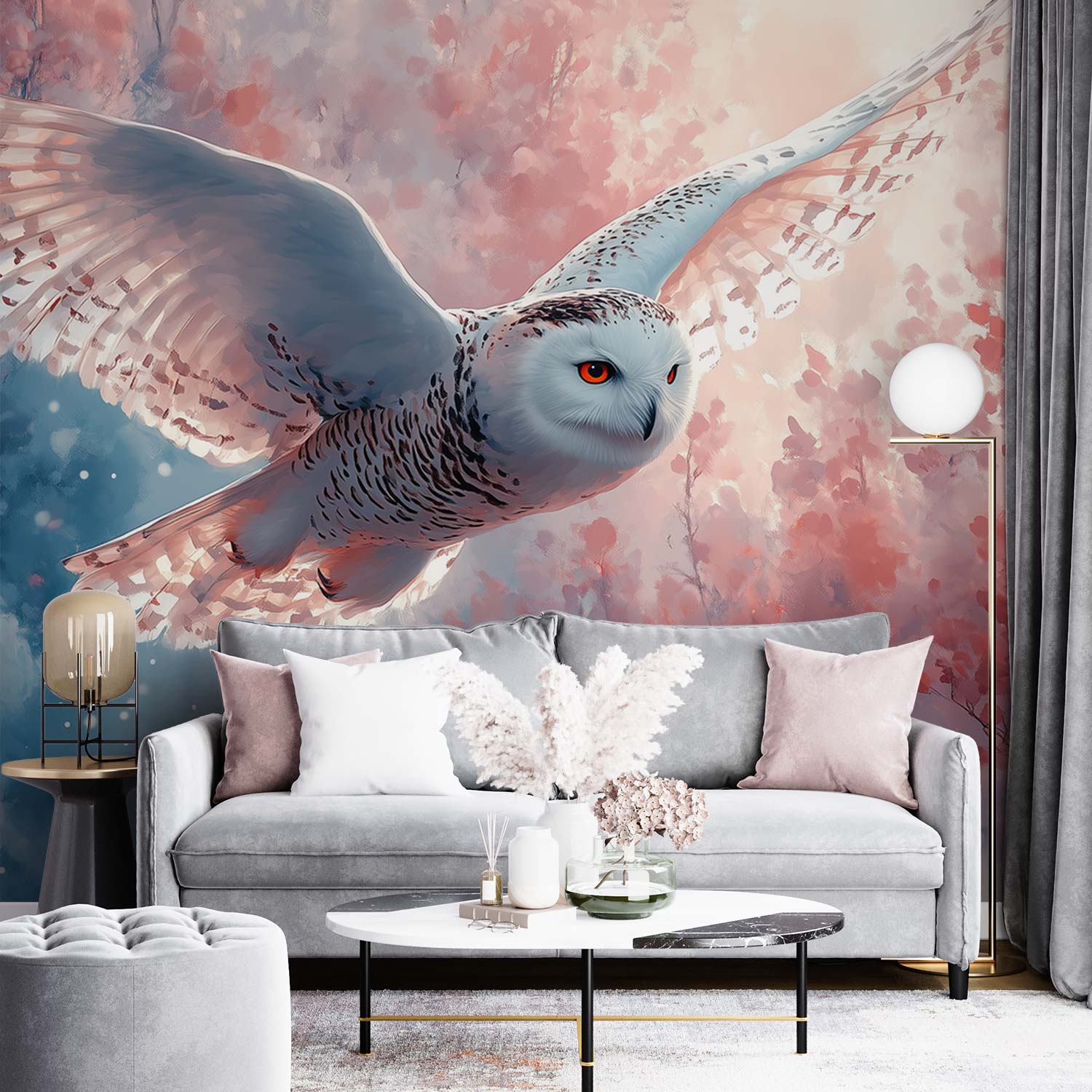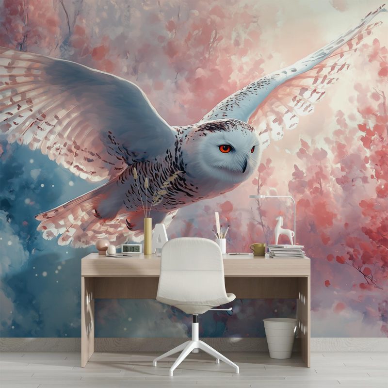 Betoverend zweeft de sneeuwwitte uil door een zacht roze en blauw luchtruim, zijn oranje ogen fonkelend als edelstenen. Zwarte vlekken accentueren zijn verenkleed terwijl hij elegant door de dromerige sfeer glijdt. Dit kunstzinnige behang brengt magie en beweging in je ruimte, perfect voor wie verfijnde natuurbeleving zoekt. De harmonieuze compositie en kalme kleuren creëren een serene uitstraling in elk interieur.