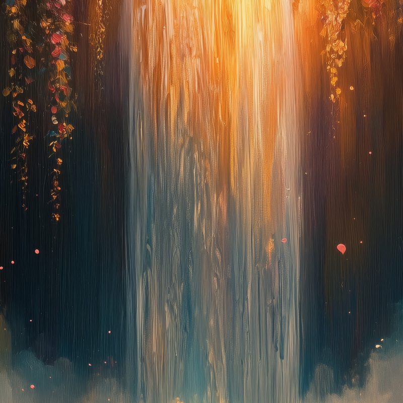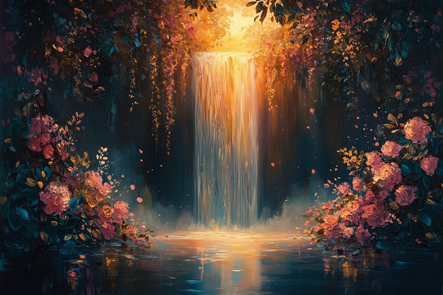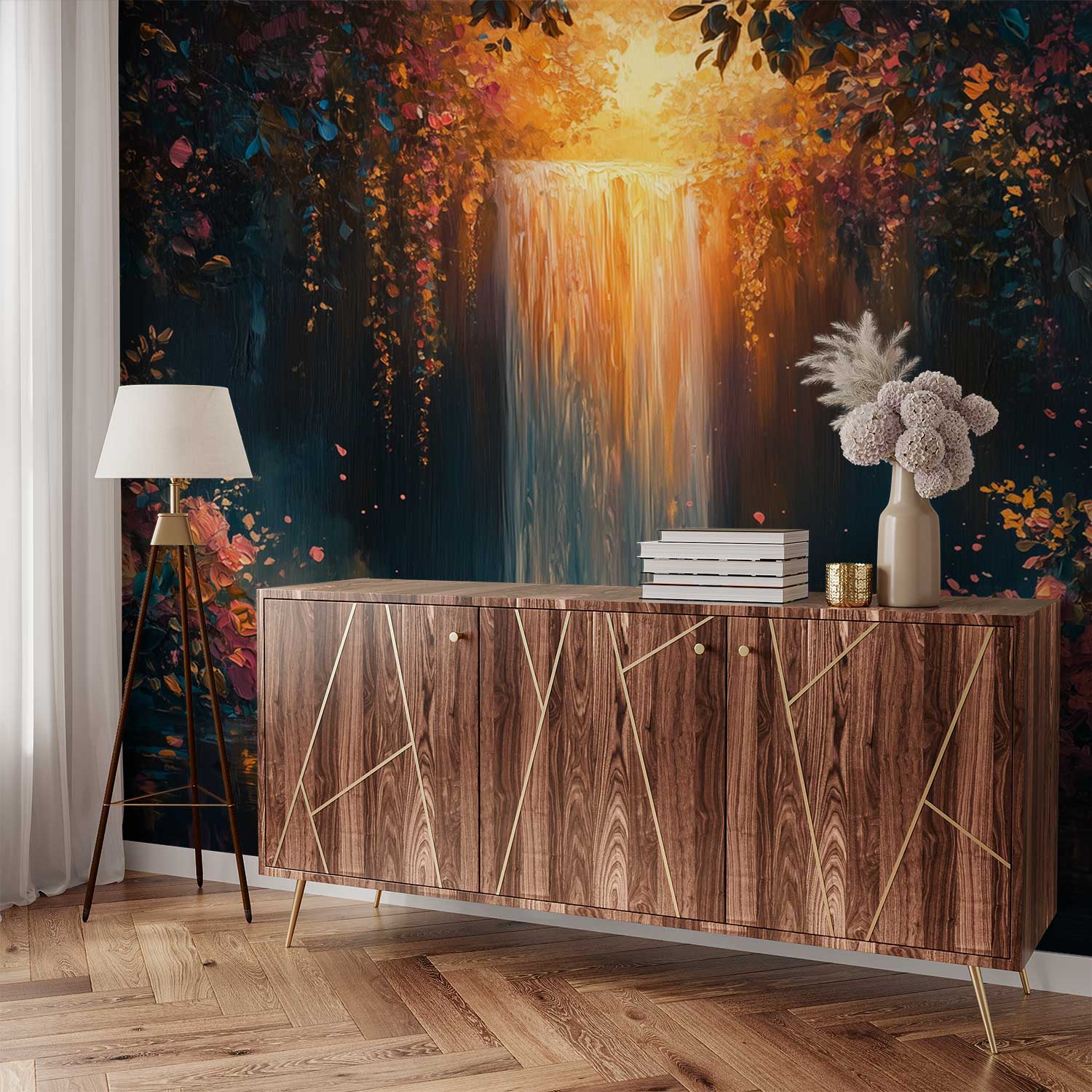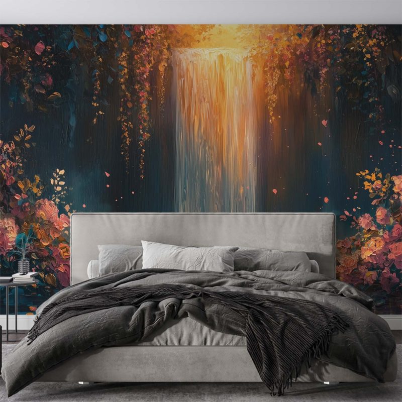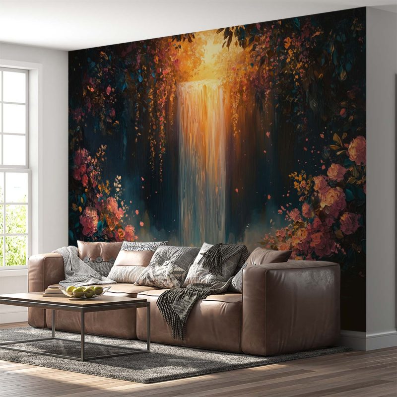 Stromend water danst tussen rotsen omgeven door een weelderige bloemenzee. Levendige tinten oranje en roze bloemen contrasteren met het frisse groen en het sprankelende blauw van het water. Deze impressionistische waterval brengt een gevoel van rustige beweging in je ruimte, waardoor elke muur transformeert tot een serene natuurlijke ontsnapping vol harmonie en kleurrijke energie.