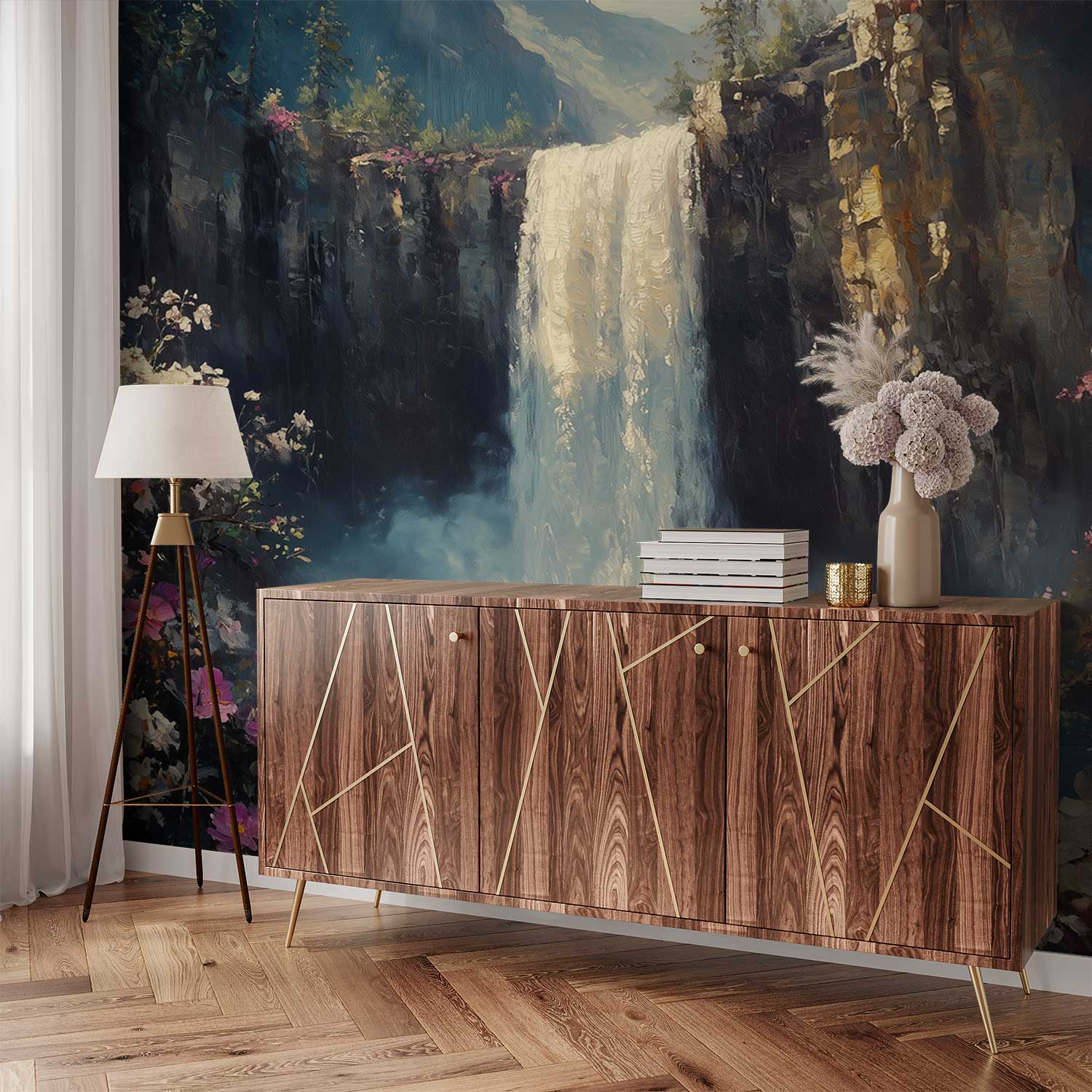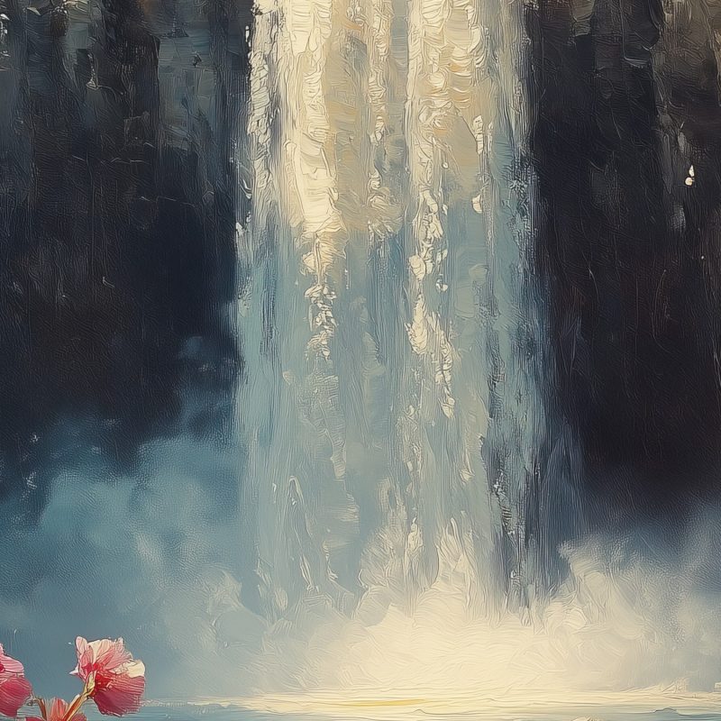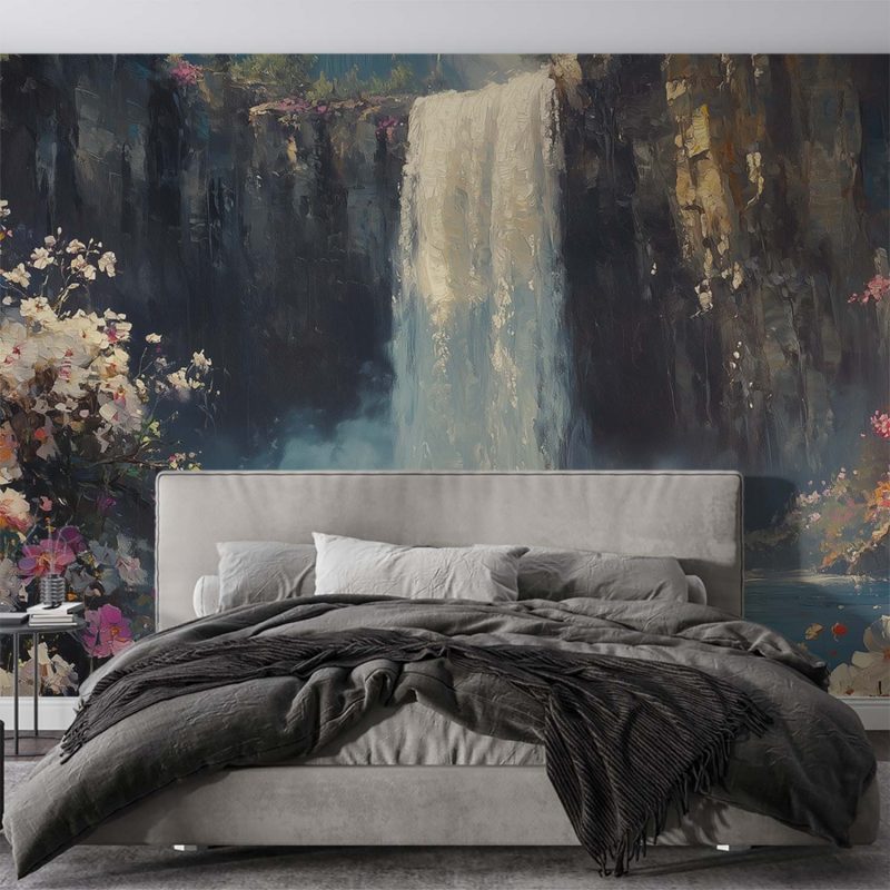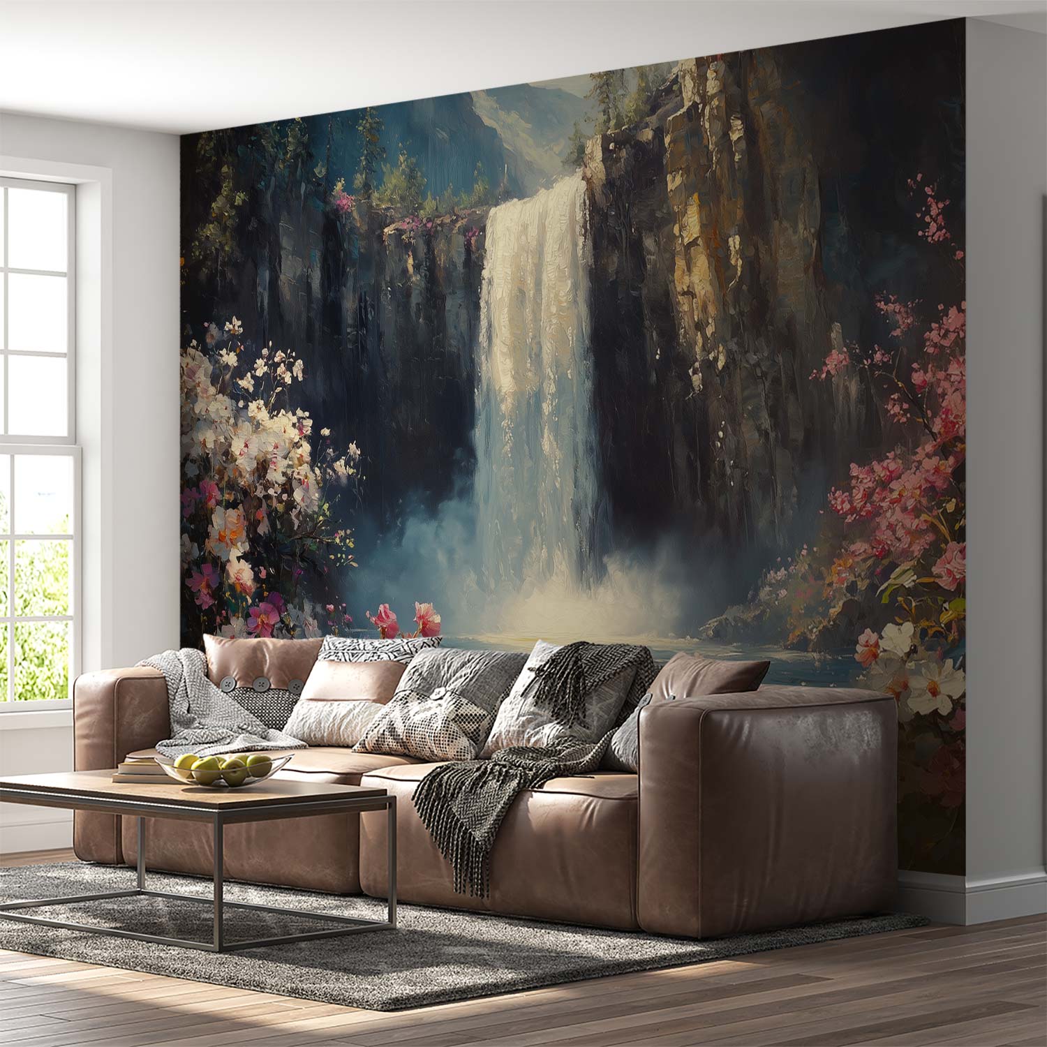 Verfrissende waterval stort zich majestueus tussen rotsen, omringd door een weelderige bloemenzee in zachtroze en wit. Levendige kleuren dansen over het doek en brengen pure natuurharmonie in je ruimte. Dit kunstwerk ademt sereniteit en transformeert elke muur tot een oase van rust, waar je eindeloos kunt wegdromen bij het kabbelende water en fladderende bloesems.