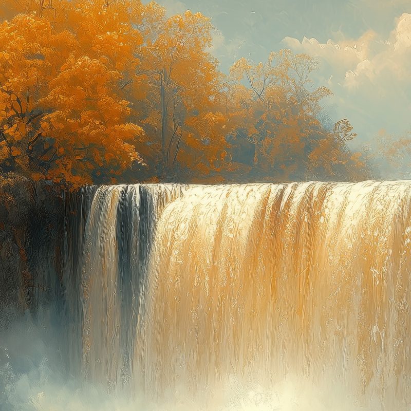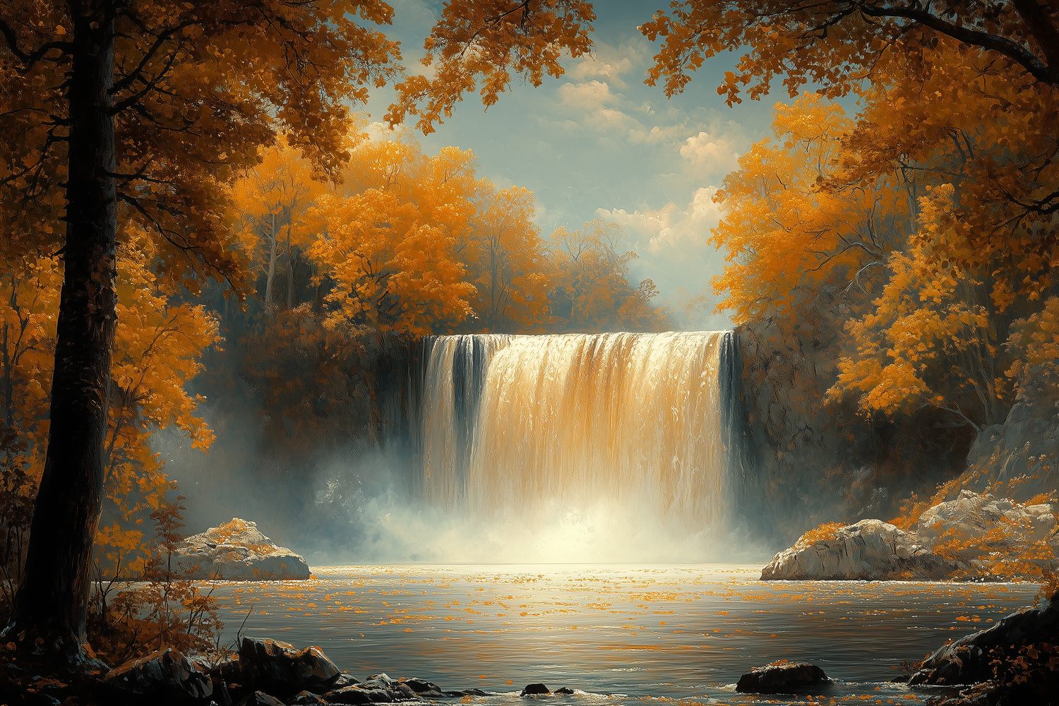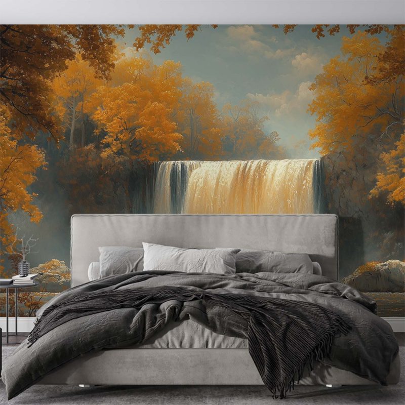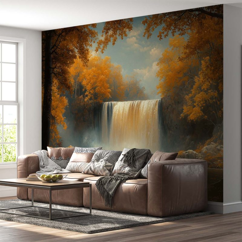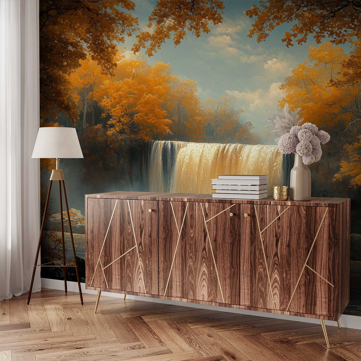 Ontwaak in een oase van rust waar een waterval krachtig neerstort tussen oranje herfstbladeren. De levendige kleuren dansen tegen een helderblauwe lucht, en brengen de harmonie van de natuur naar binnen. Dit behang transformeert je muur in een serene eyecatcher, perfect voor een ruimte waar ontspanning en natuurlijke schoonheid samenkomen.