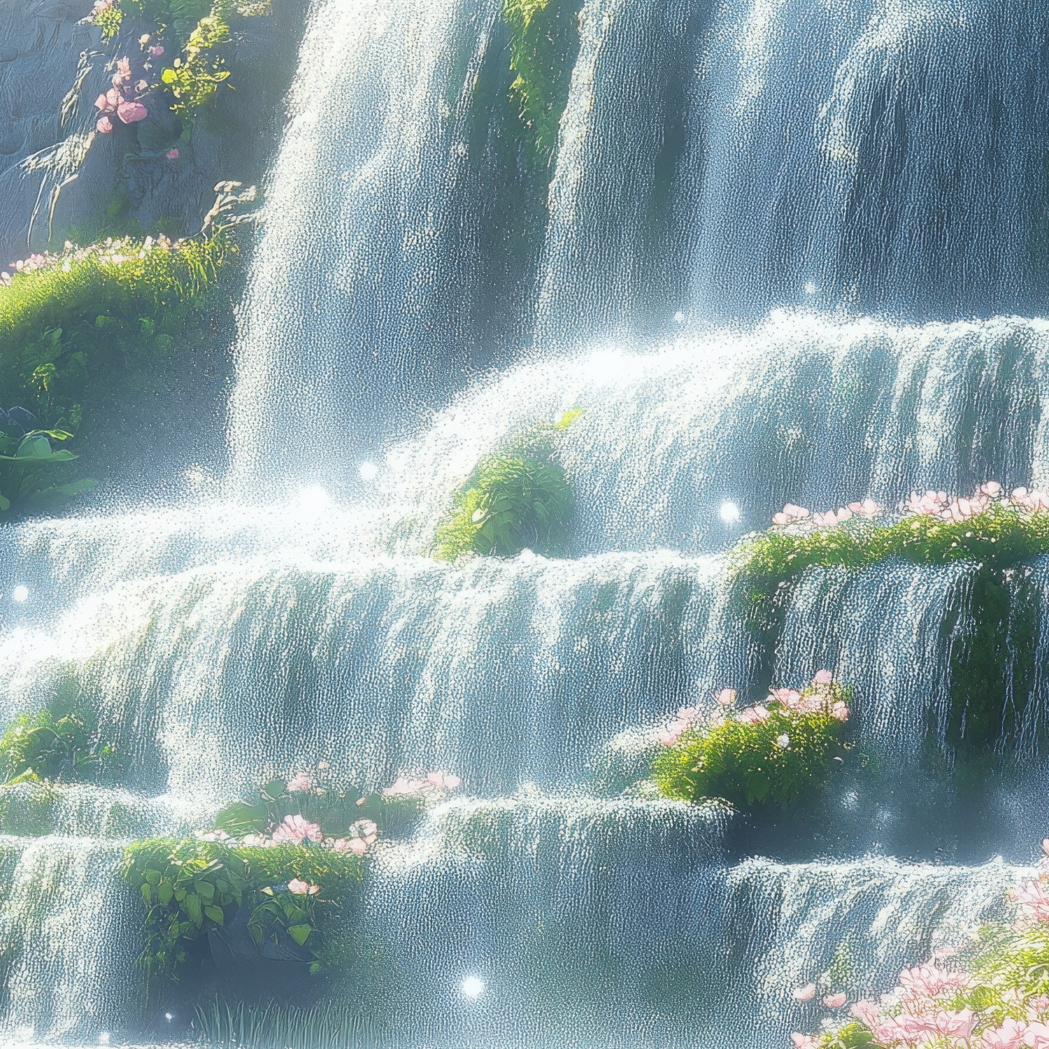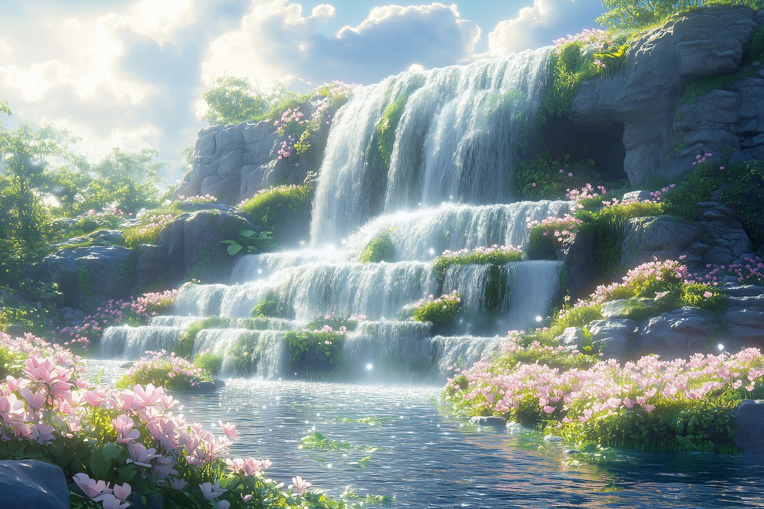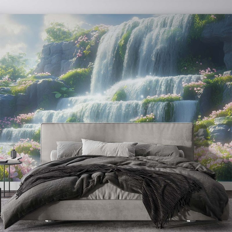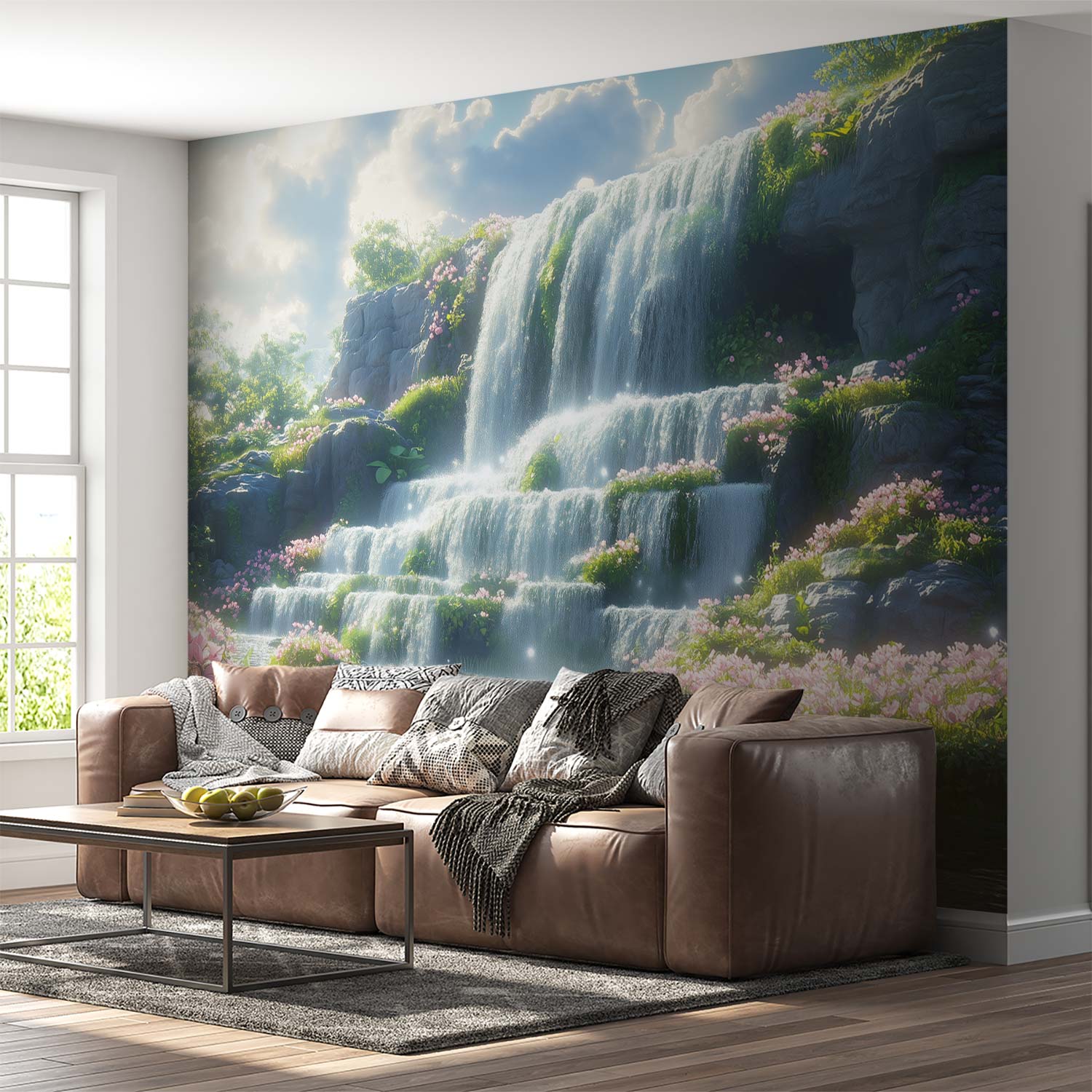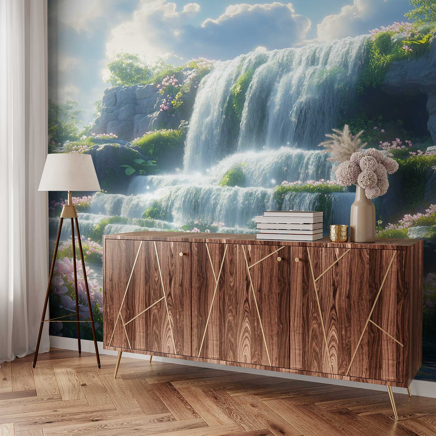 Verfrissende waterval stort zich uit tussen rotsen en bloeiende bloemen. Levendig groen en zachtroze accentueren dit vredige landschap onder een helderblauwe hemel. Brengt de rustgevende energie van de natuur naar binnen, perfect voor een serene sfeer in elke leefruimte.