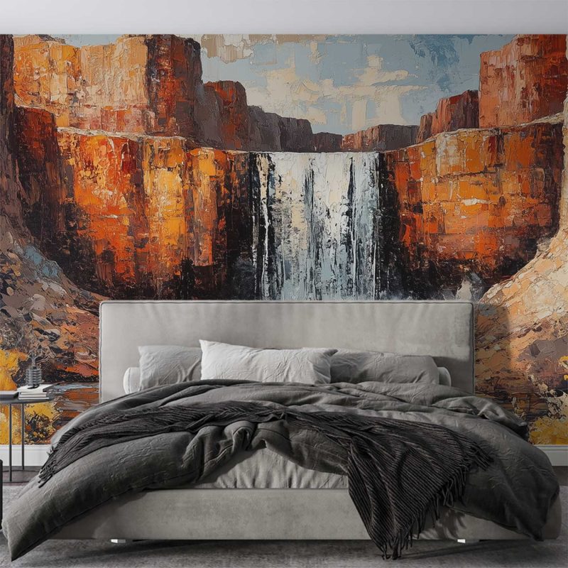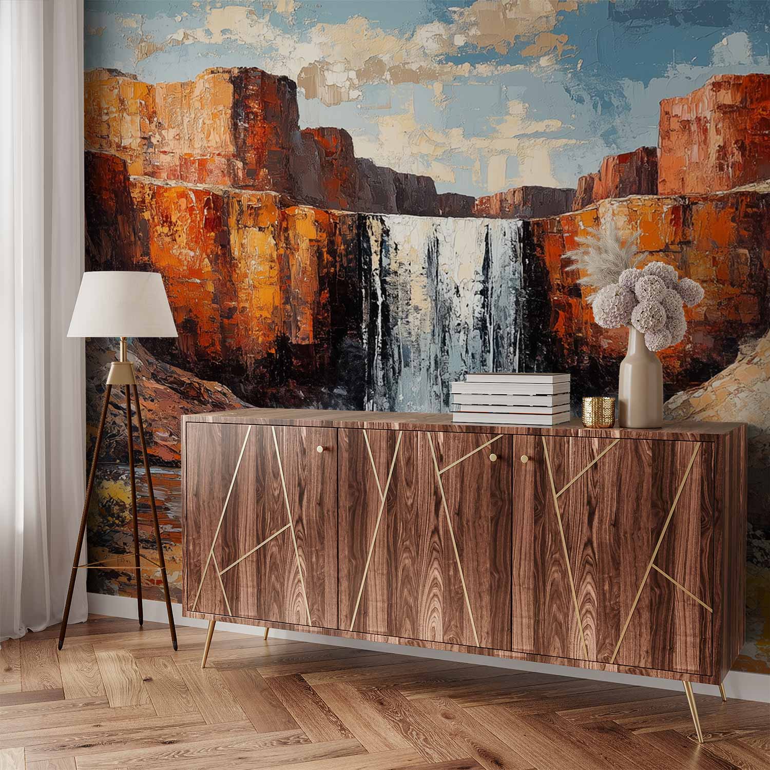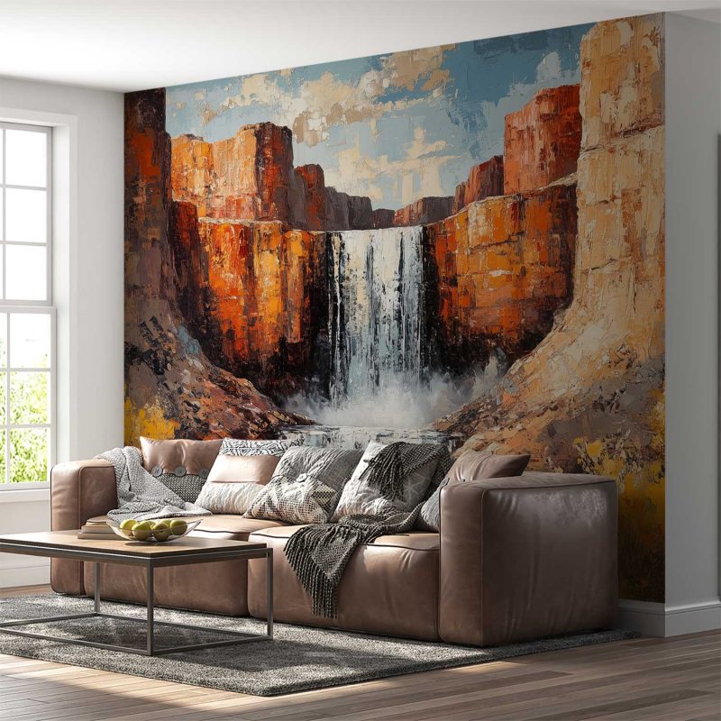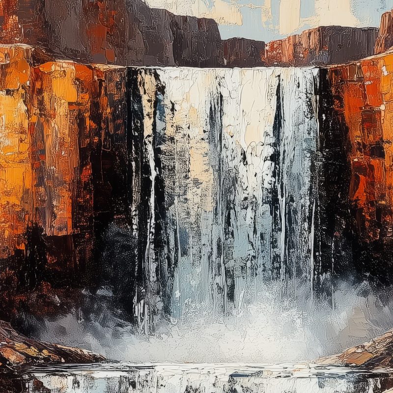 Stralende oranje rotsen ontmoeten kolkend blauw water in een levendige dans. Dit impressionistische waterval tafereel brengt pure beweging en serene energie in je ruimte. De meeslepende compositie trekt direct de aandacht en creëert een harmonieuze sfeer van natuurlijke schoonheid. Perfect voor wie verlangt naar een rustgevend middelpunt vol dynamiek en kleur.