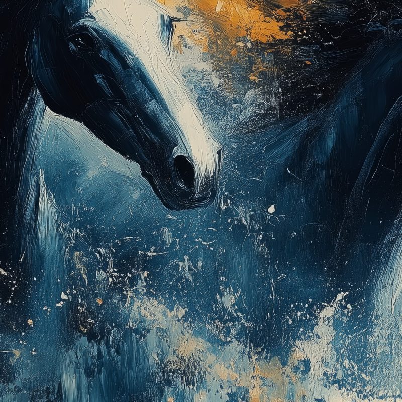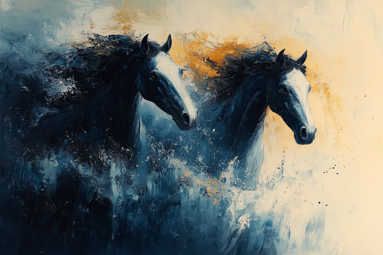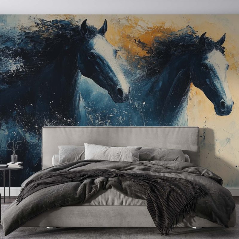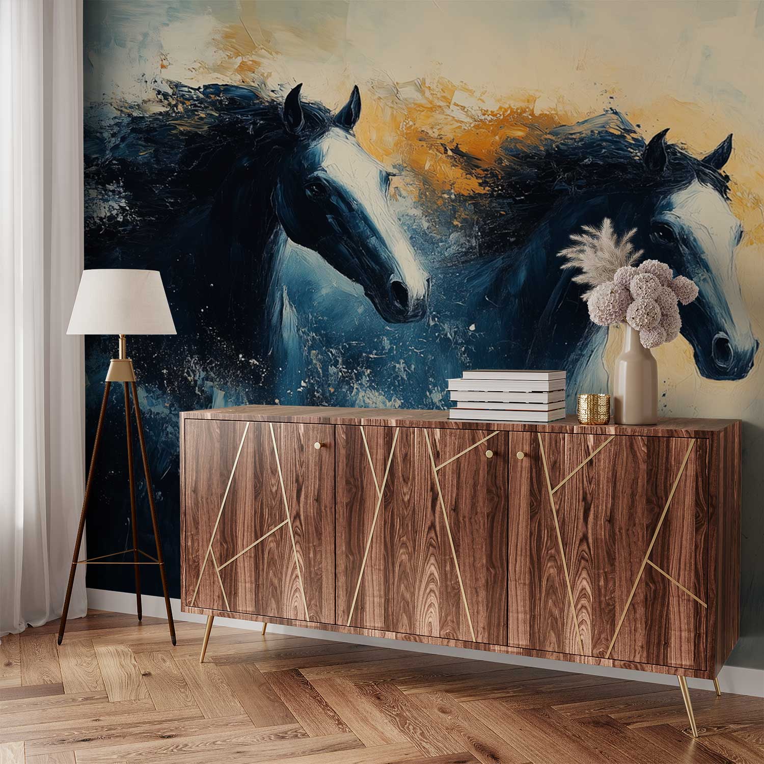Vurige oranje en diepblauwe tinten dansen over de muur. Twee paarden stormen voorbij, manen wapperend in een onzichtbare wind. Elk penseelstreek ademt energie en vrijheid. Dit levendige tafereel brengt dynamiek en wild elegance in je ruimte. De krachtige beweging en contrastrijke kleuren maken van elke muur een meeslepend middelpunt. Perfect voor wie verlangt naar een interieur vol passie en ongedwongen schoonheid.