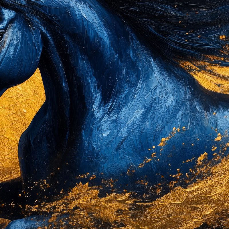 Vurige goudtinten wervelen rond een krachtige blauwe paardenfiguur in volle galop. Levendige penseelstreken vangen pure beweging en energie, terwijl het contrasterende kleurenspel diepte en drama toevoegt. Dit dynamische kunstwerk brengt een gevoel van vrijheid en passie in je ruimte, perfect als statementwand die elk interieur transformeert met zijn meeslepende, adrenalinevolle sfeer.