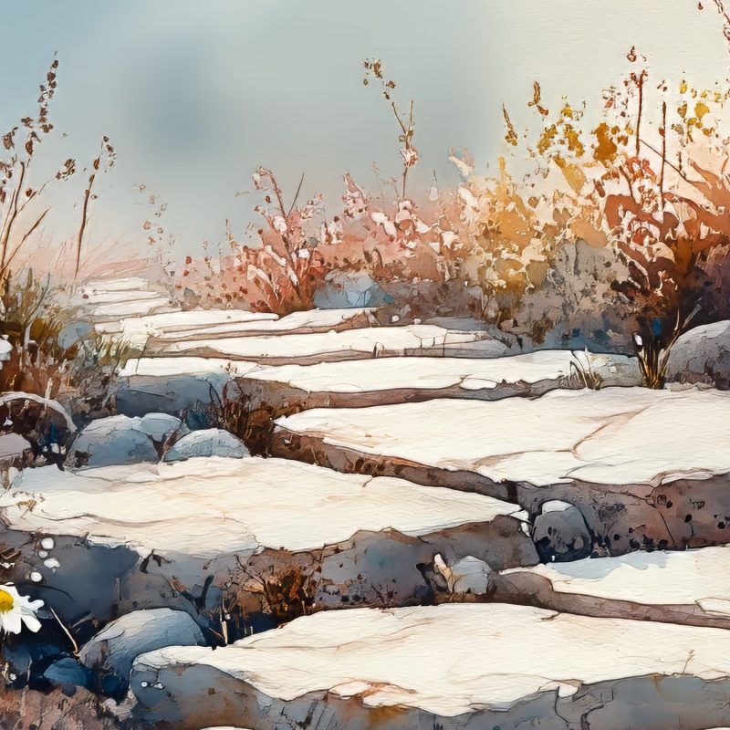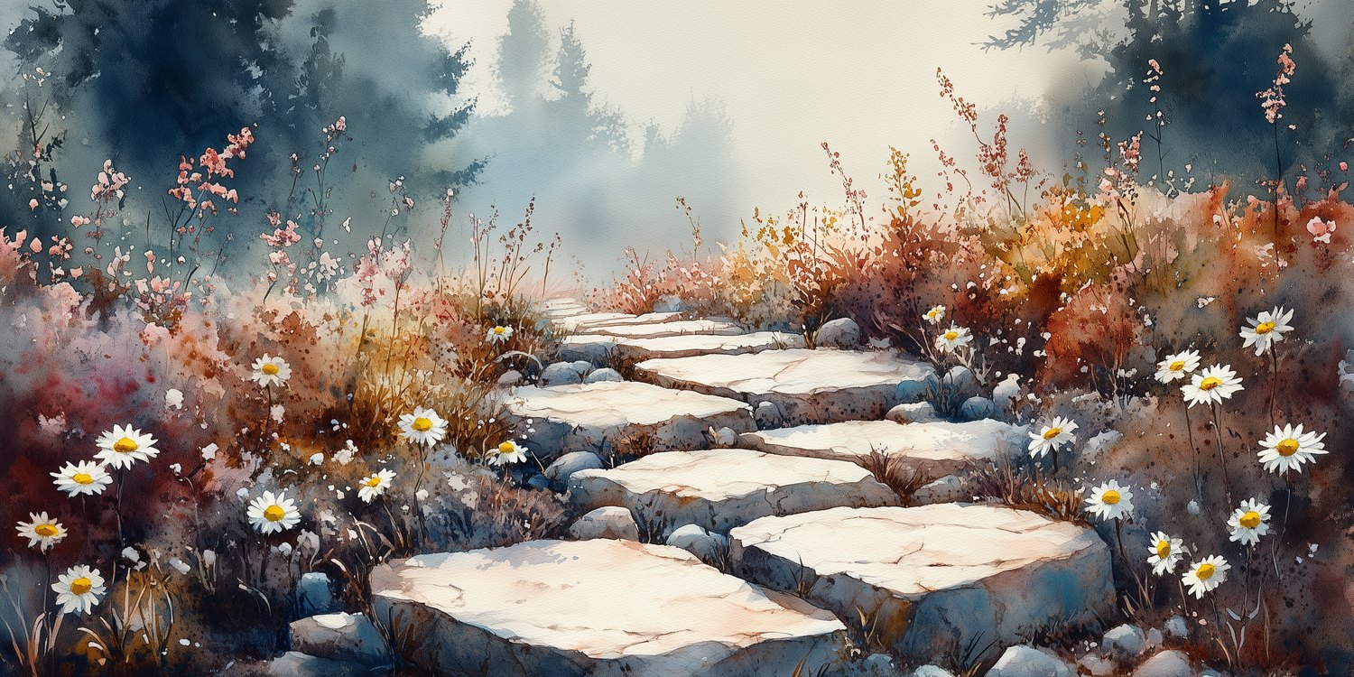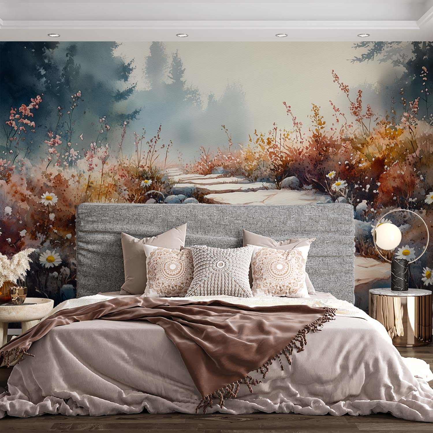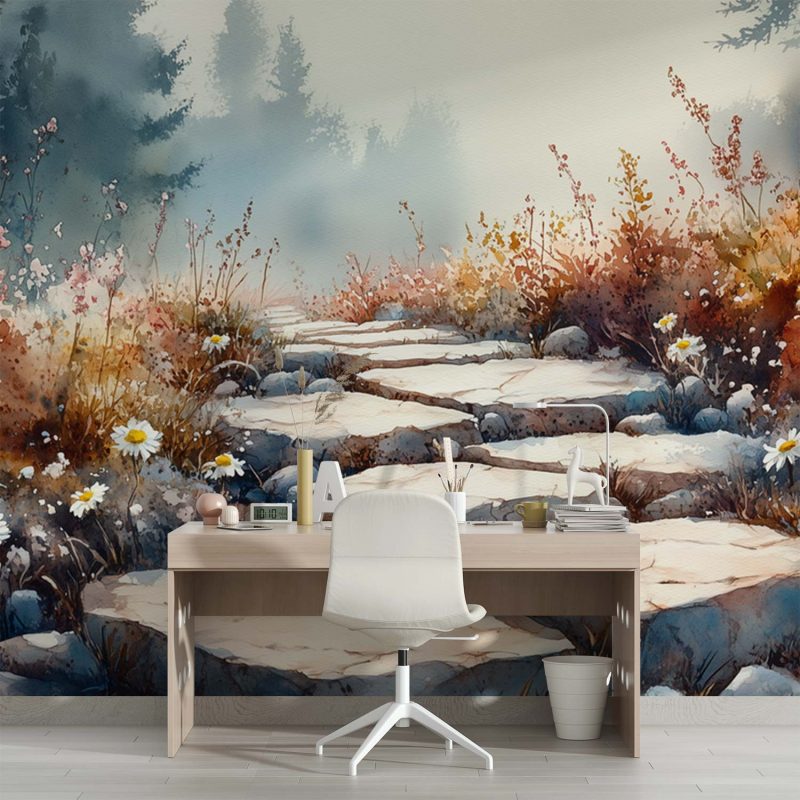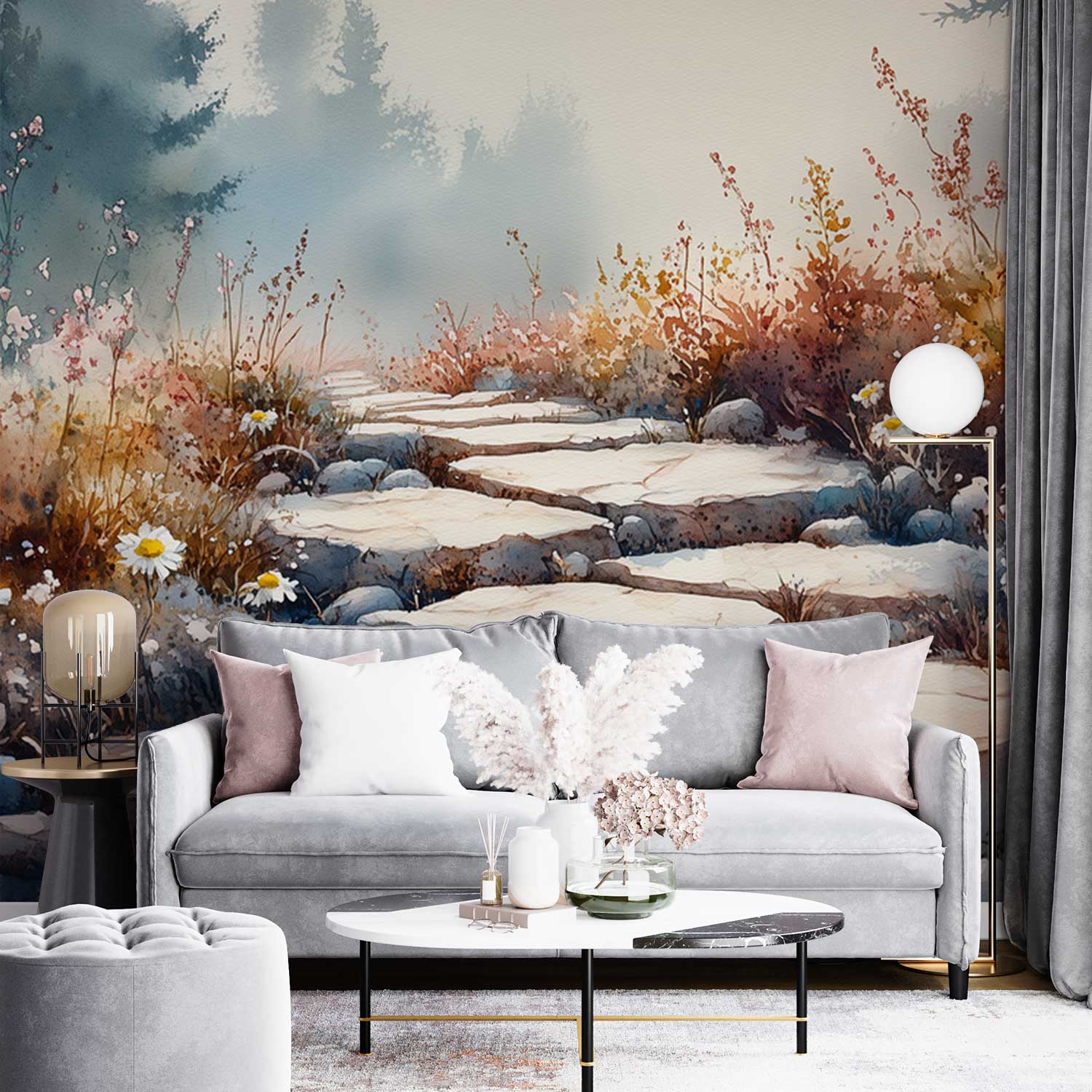 Zachte waterverfblauwen en roze tinten dansen over dit bloemenveld, waar een stenen pad je uitnodigt voor een rustgevende wandeling. De dromerige sfeer brengt onmiddellijke sereniteit in je ruimte, terwijl de gebalanceerde compositie harmonie toevoegt aan elke muur. Perfect voor het creëren van een kalme, natuurlijke retreat in je huis.