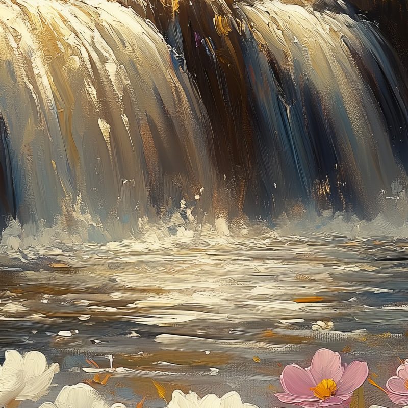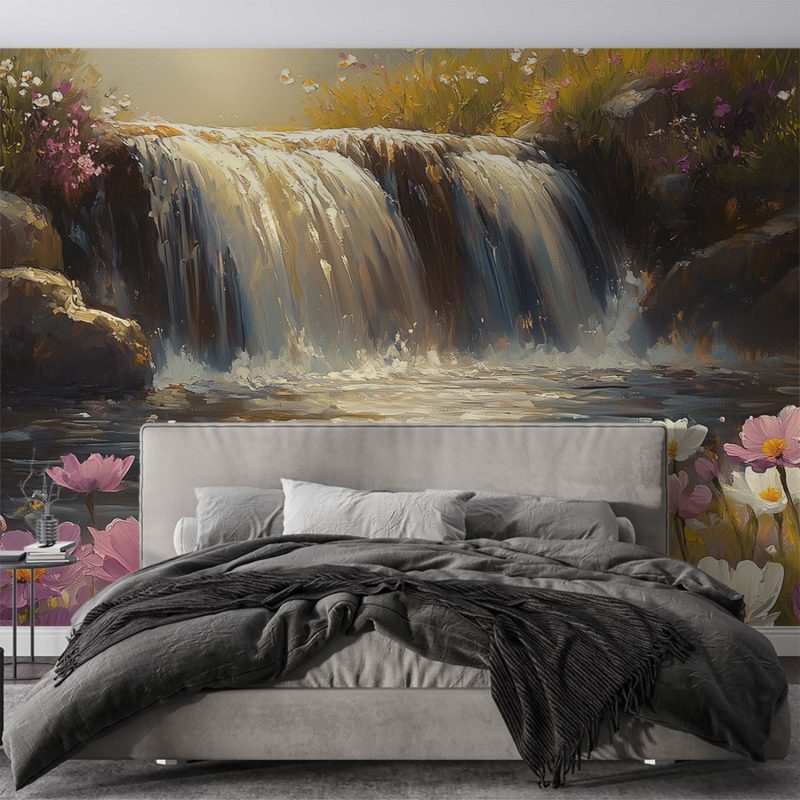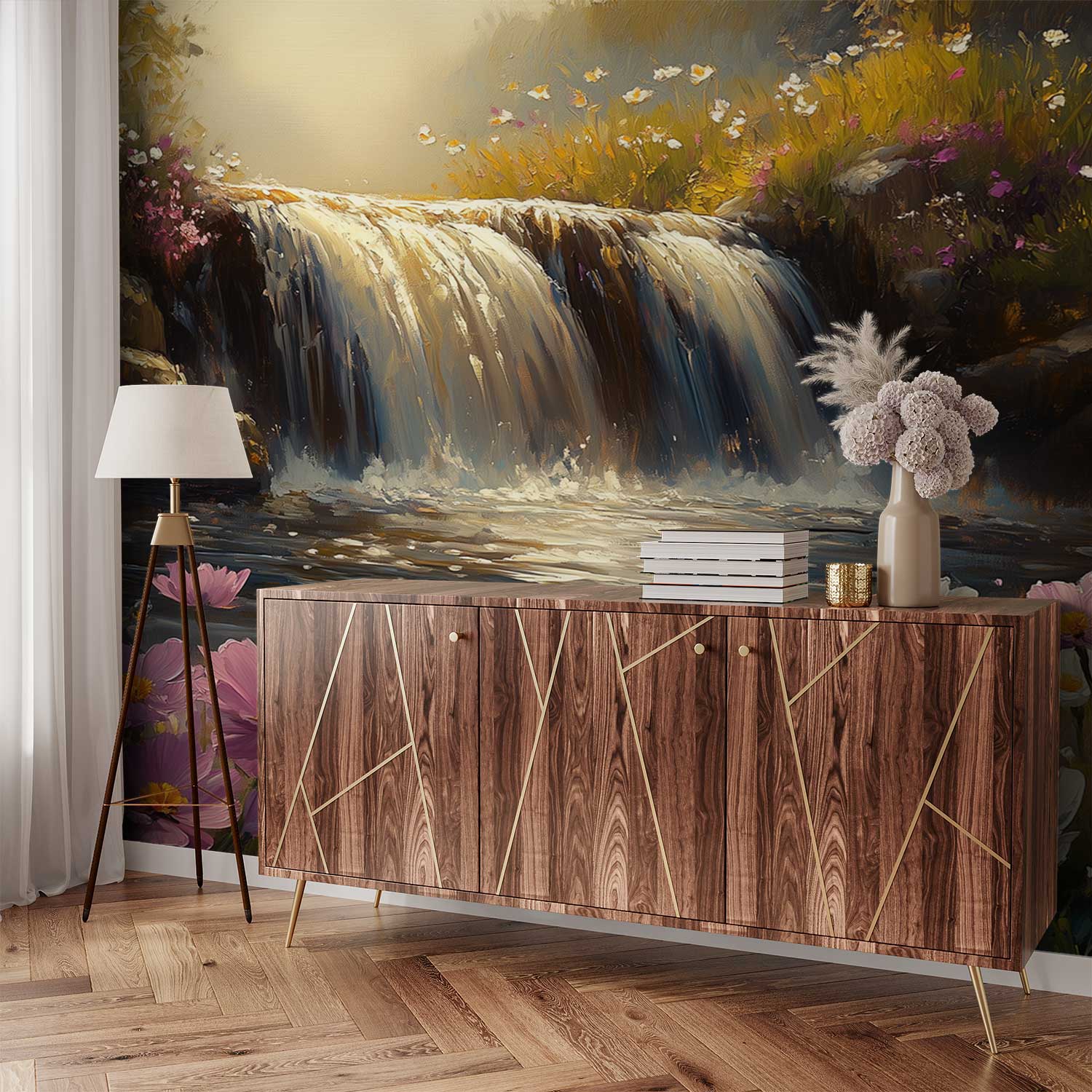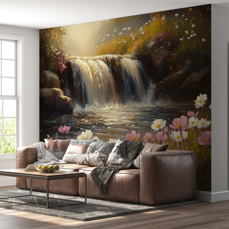Stralend groen en levendige bloemen omringen een waterval die dynamisch naar beneden stroomt. Dit behang brengt de serene energie van de natuur in huis en creëert een rustgevende sfeer in elke ruimte.