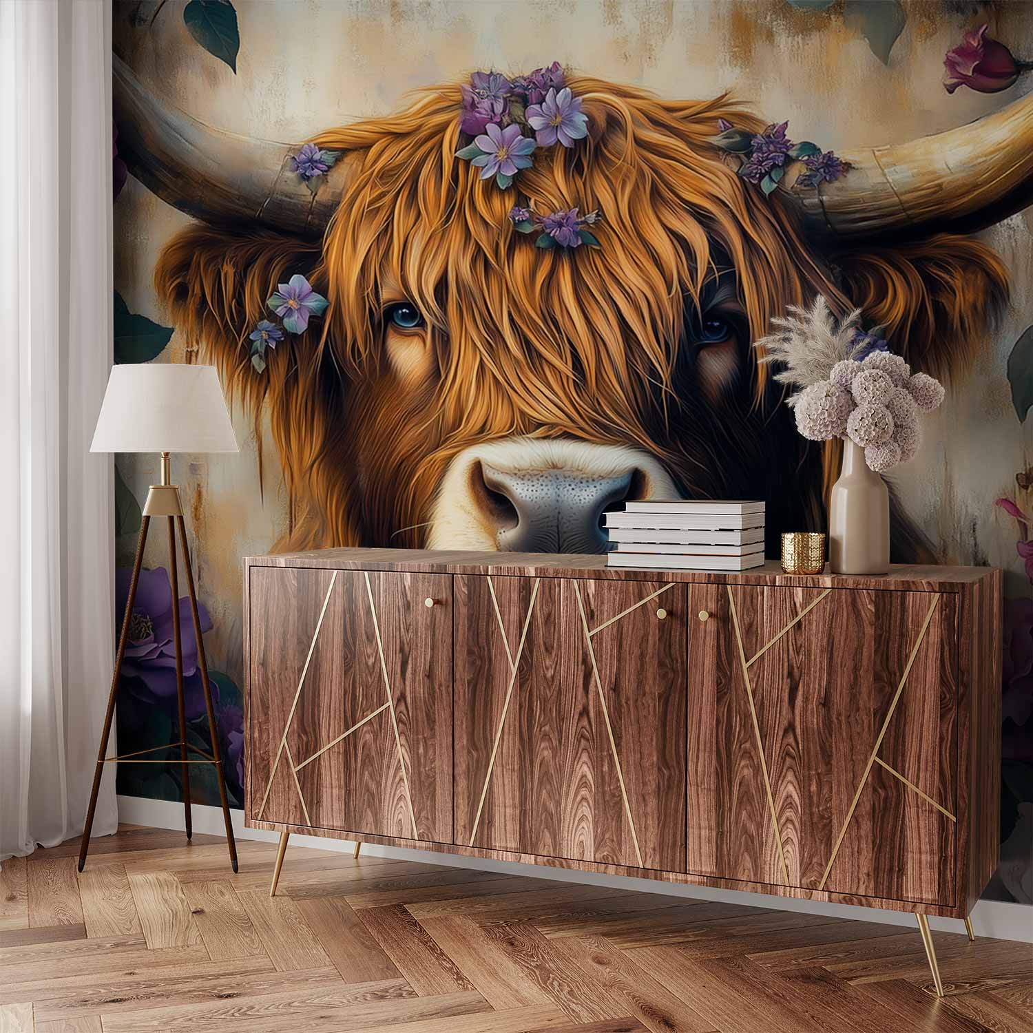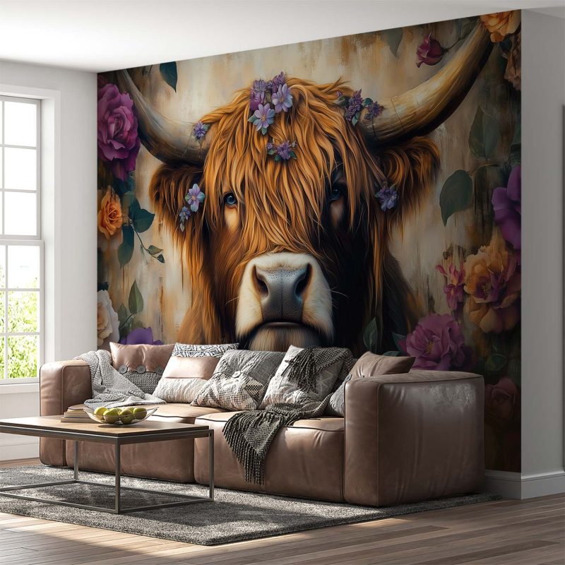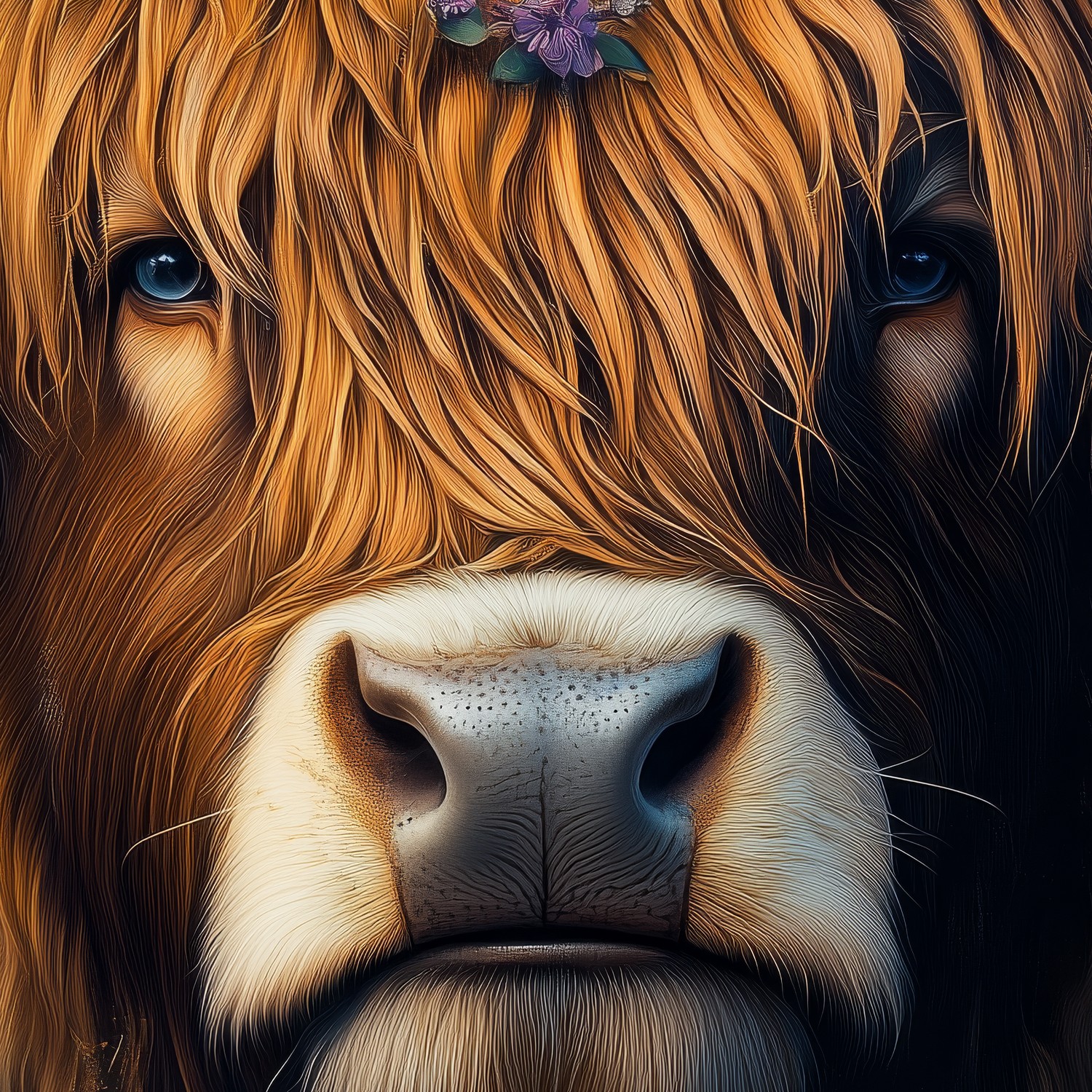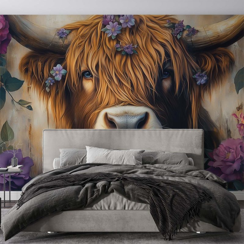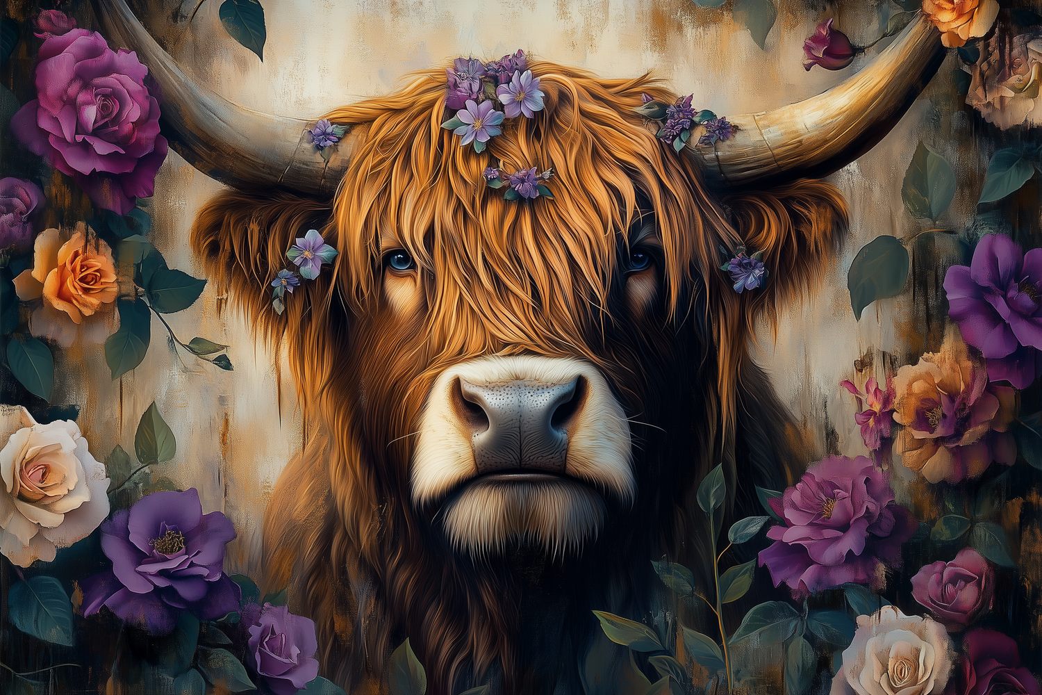 Warme tinten bruin en oranje omarmen een rustige koe, omringd door een weelderige bloemenzee van paarse lavendel en rozen. De sierlijke hoorns vormen een natuurlijk evenwicht met de bloemenpracht, terwijl het dier vredig tussen de bloesems rust. Deze levendige maar serene scène brengt een harmonieuze natuurbeleving naar uw muur, perfect voor een rustgevende woon- of slaapkamer.
