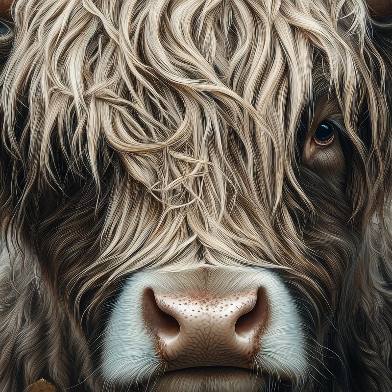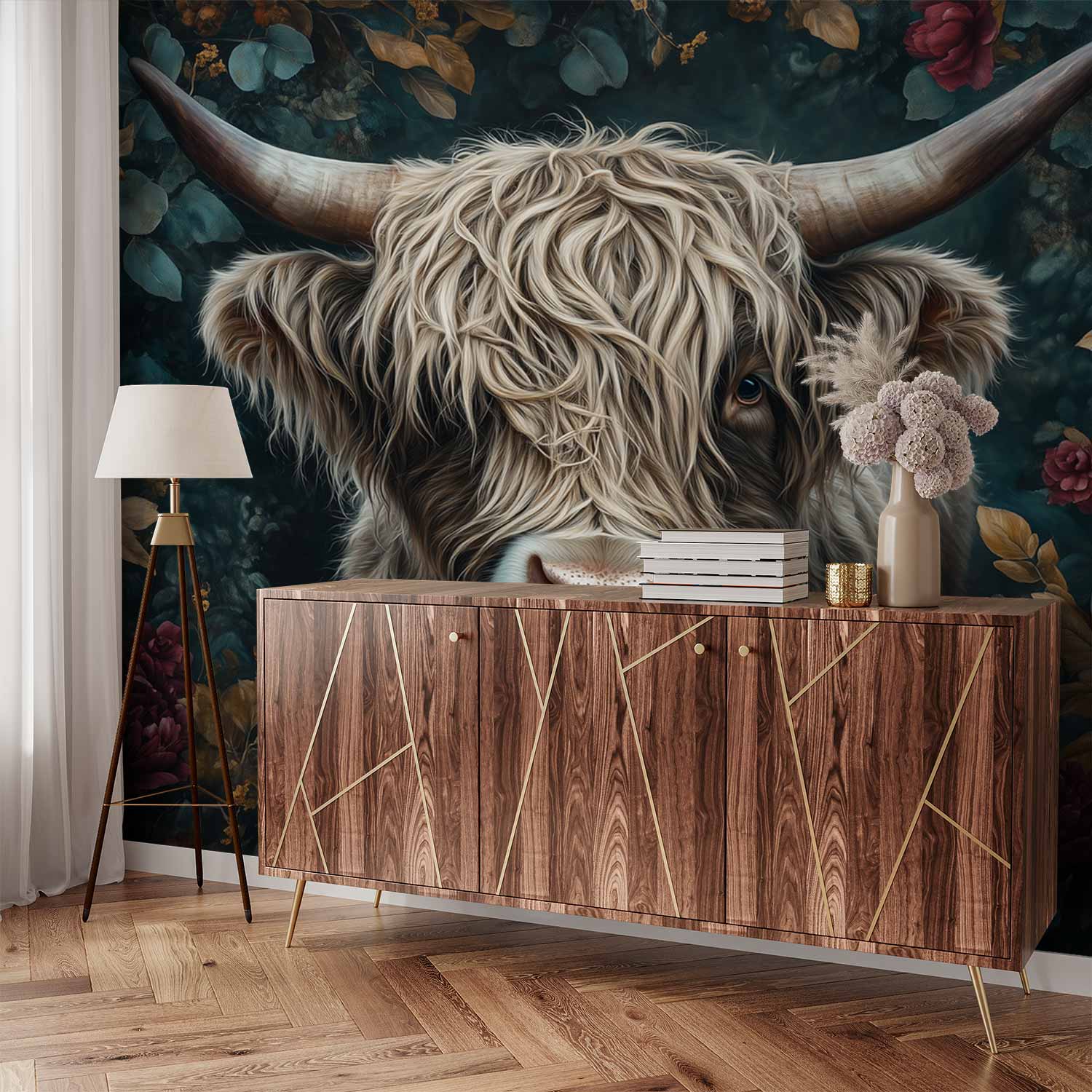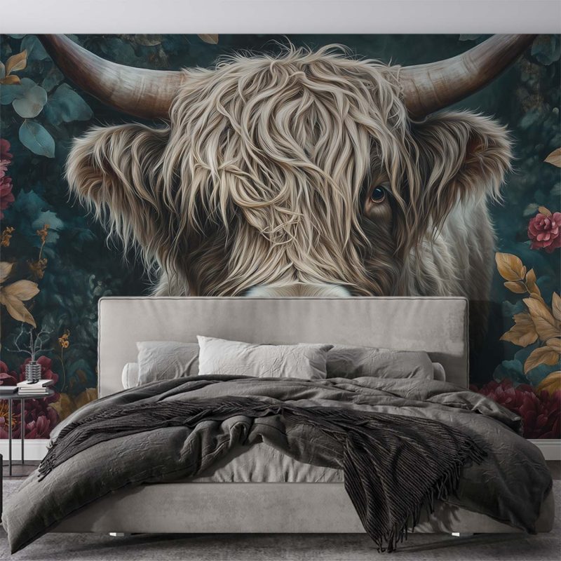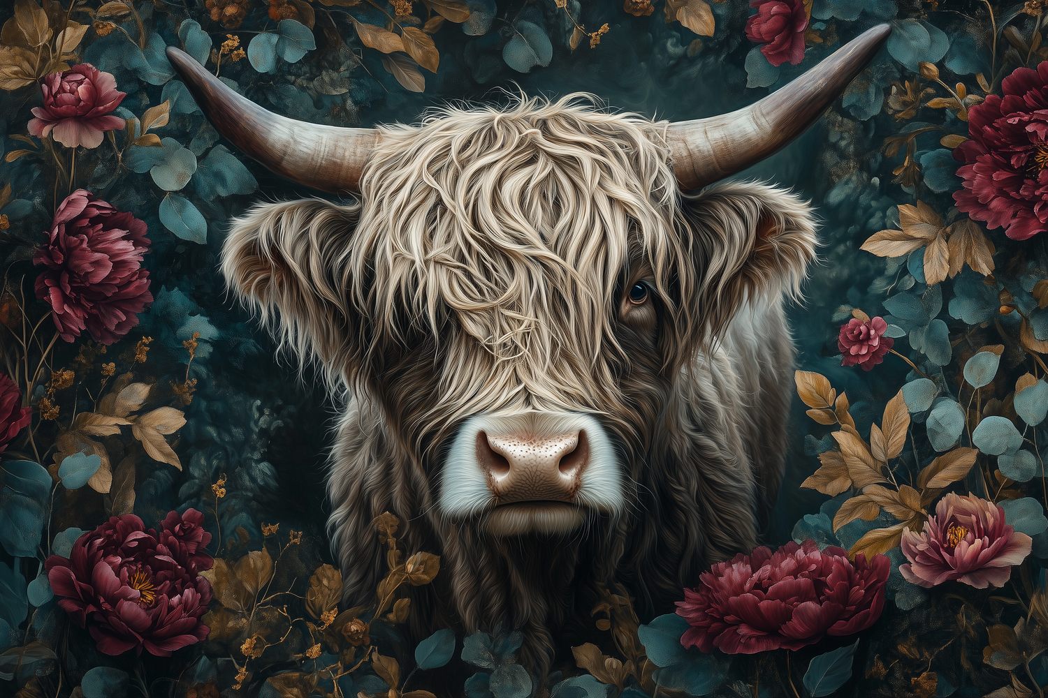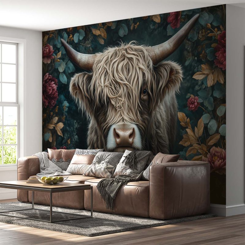 Verfijnde roze bloemen dansen tussen sappig groen gebladerte, terwijl een harige koe met tedere ogen je rustig aankijkt. Dit levendige tafereel brengt de magie van een bloemrijk bos direct je huis in. De harmonieuze mix van natuur en dier creëert een instant gevoel van sereniteit, perfect voor een ruimte waar je wilt ontsnappen aan de dagelijkse drukte.