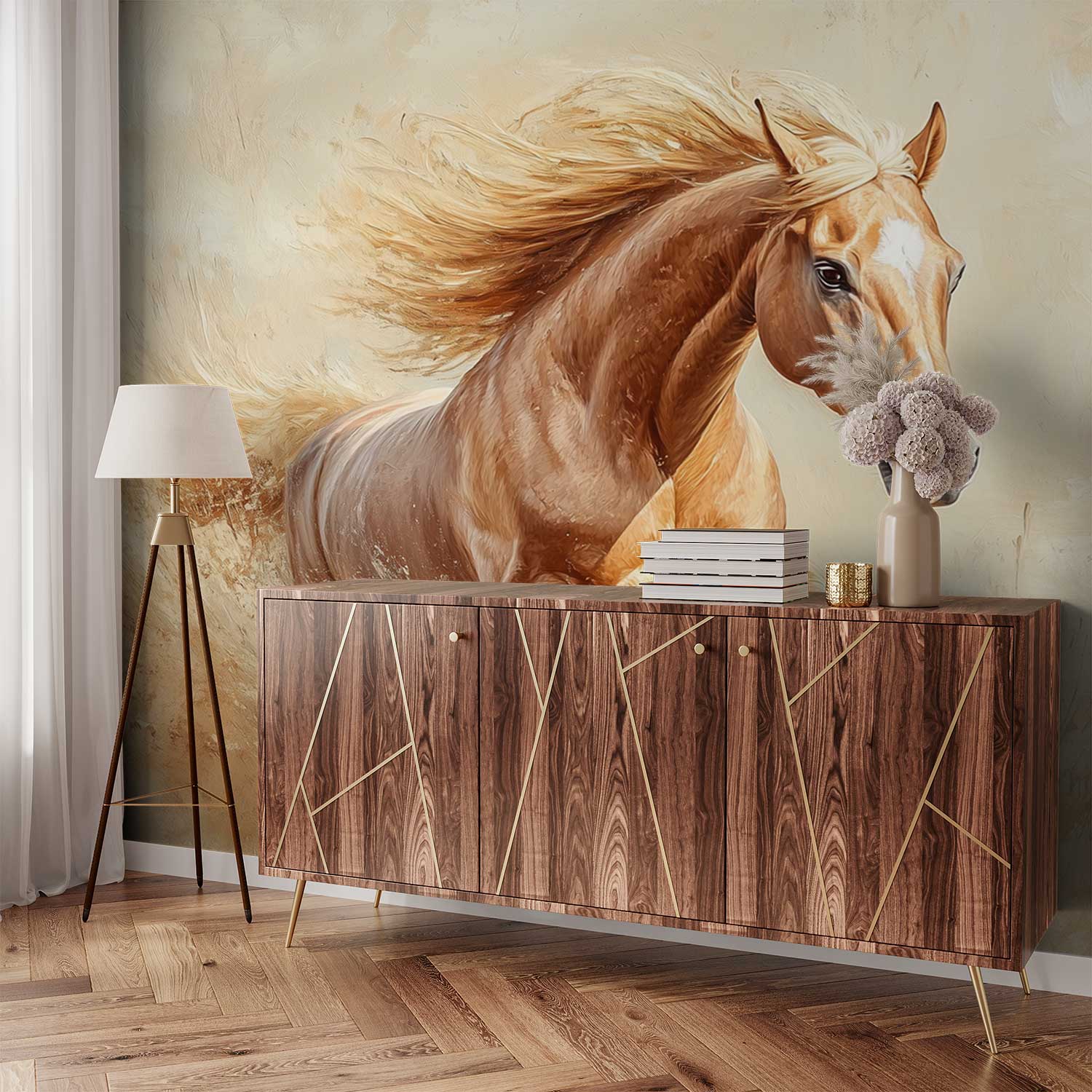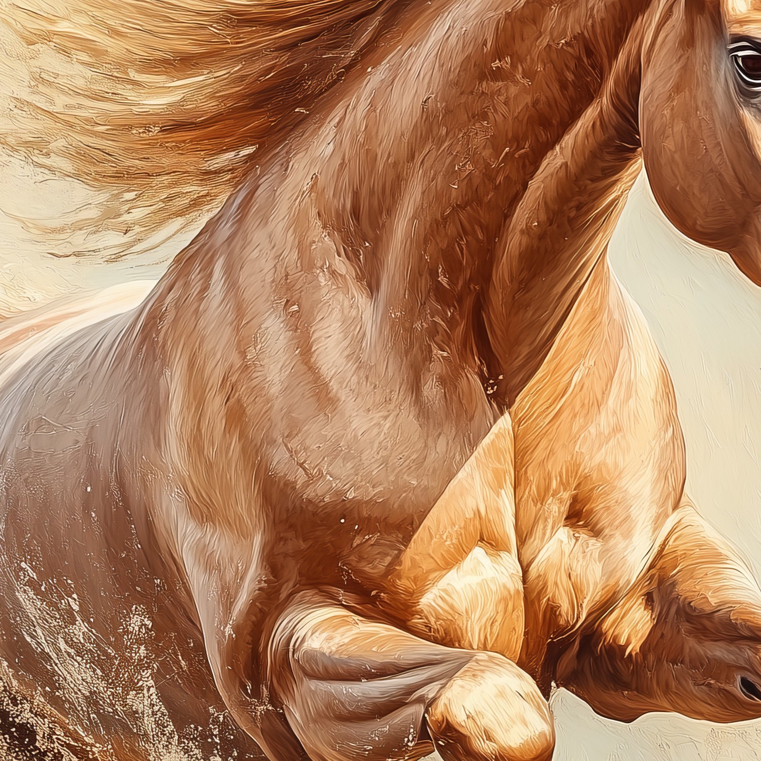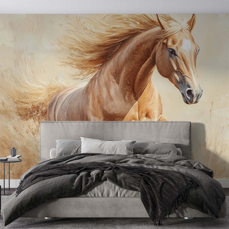 Vlugge galop, bruine manen wapperend in de wind. Dit krachtige paard brengt pure energie en dynamiek je ruimte in. De warme bruine en beige tinten creëren een harmonieus geheel vol diepte en textuur. Perfect voor wie verlangt naar de vrijheid en opwinding van de natuur in huis. Ademt leven en beweging uit, ideaal voor een statementmuur vol passie en karakter.