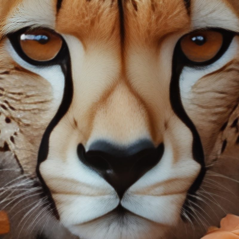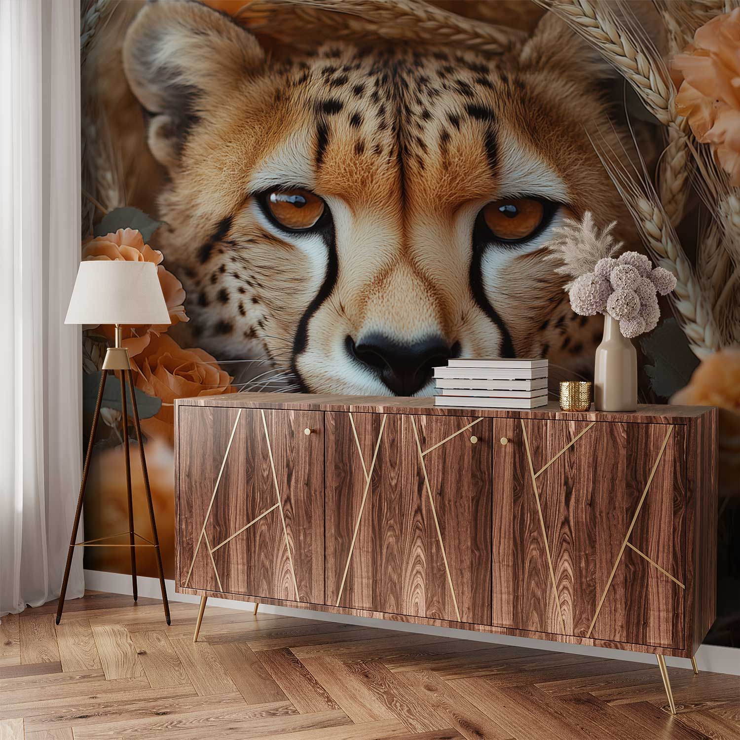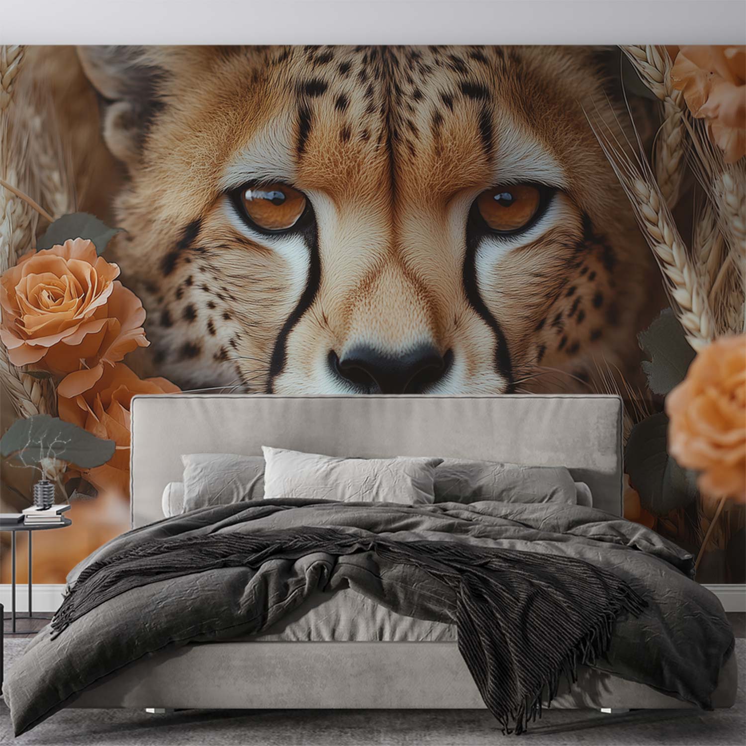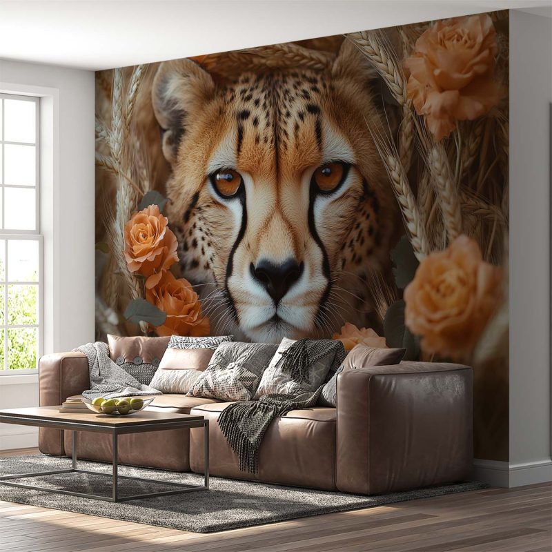 In een serene dans van oranje en bruin ontvouwt zich een cheetah tussen bloeiende rozen. Zijn doordringende blik weerspiegelt rust, omringd door bloemen die diepte en textuur toevoegen. Dit harmonieuze tafereel brengt een kalmerende, exotische sfeer in elk interieur, waar wild elegance ontmoet in een tijdloze compositie.