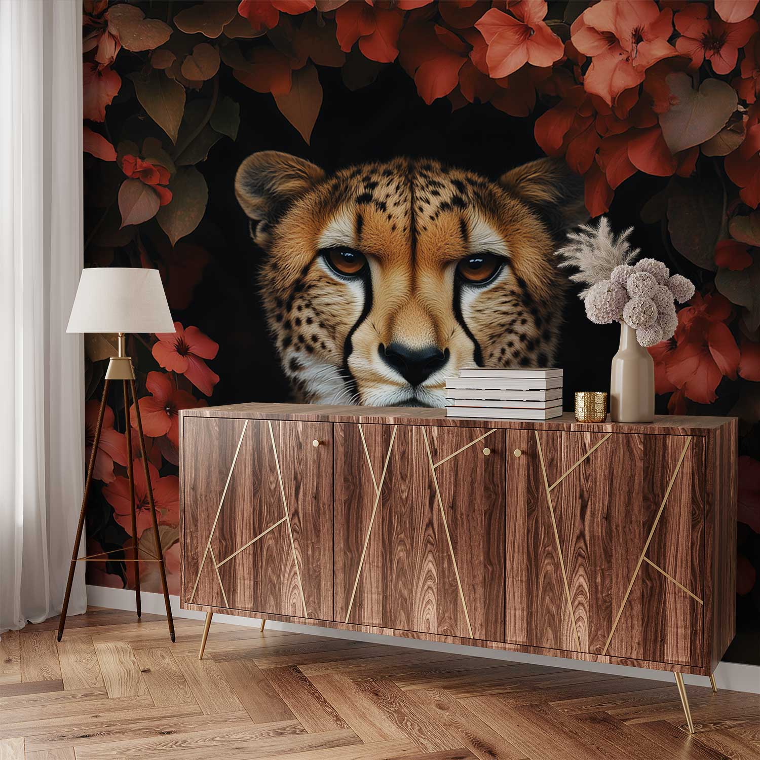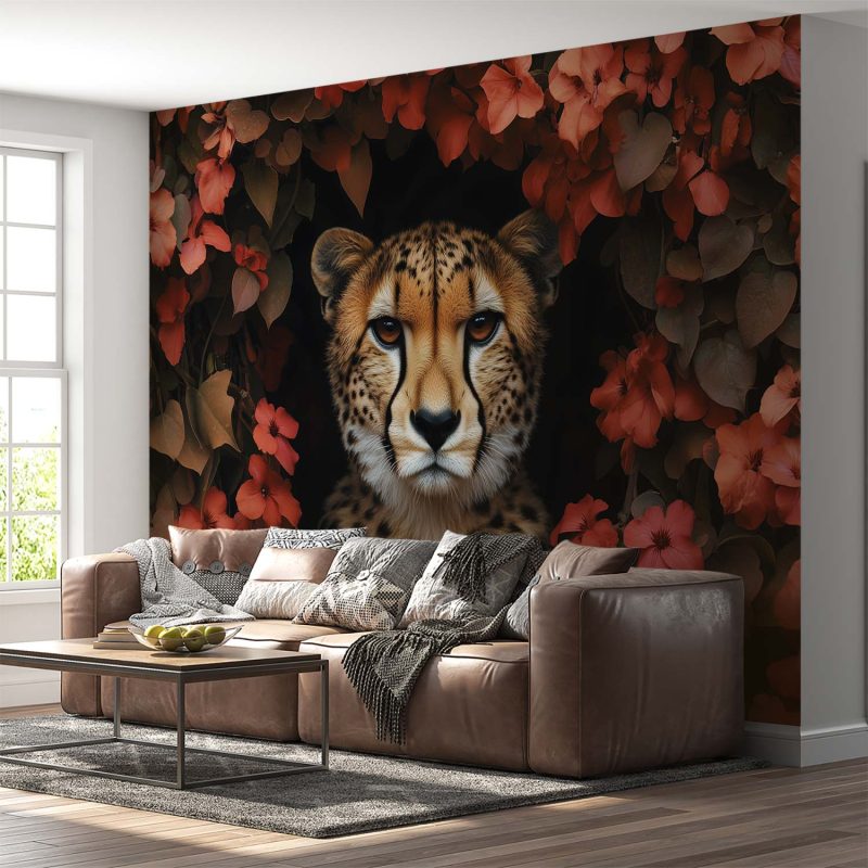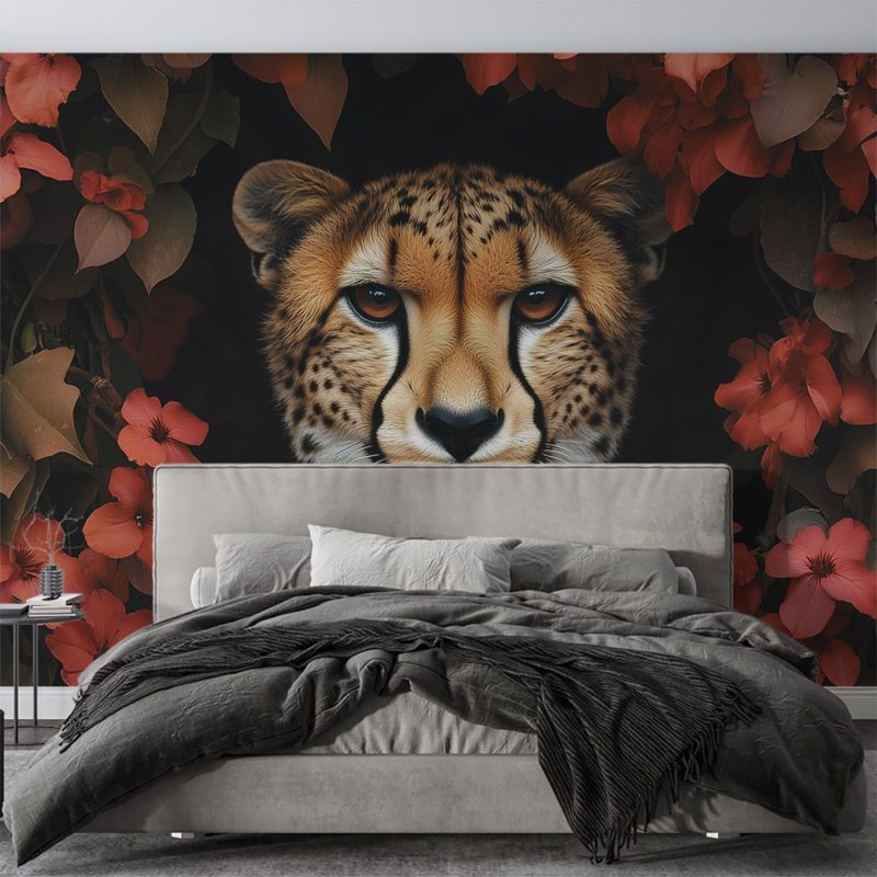 Verborgen tussen karmozijnrode bloesems gluren gouden ogen je nieuwsgierig aan. Dit levendige tafereel brengt de magie van de savanne in huis. De cheetah verschijnt als een stille bewaker temidden van een zee van rode bloemen, waarbij zijn gevlekte vacht perfect contrasteert met de weelderige achtergrond. Een statement vol rust en elegantie dat elke muur transformeert tot een natuurlijk kunstwerk vol diepte en karakter.