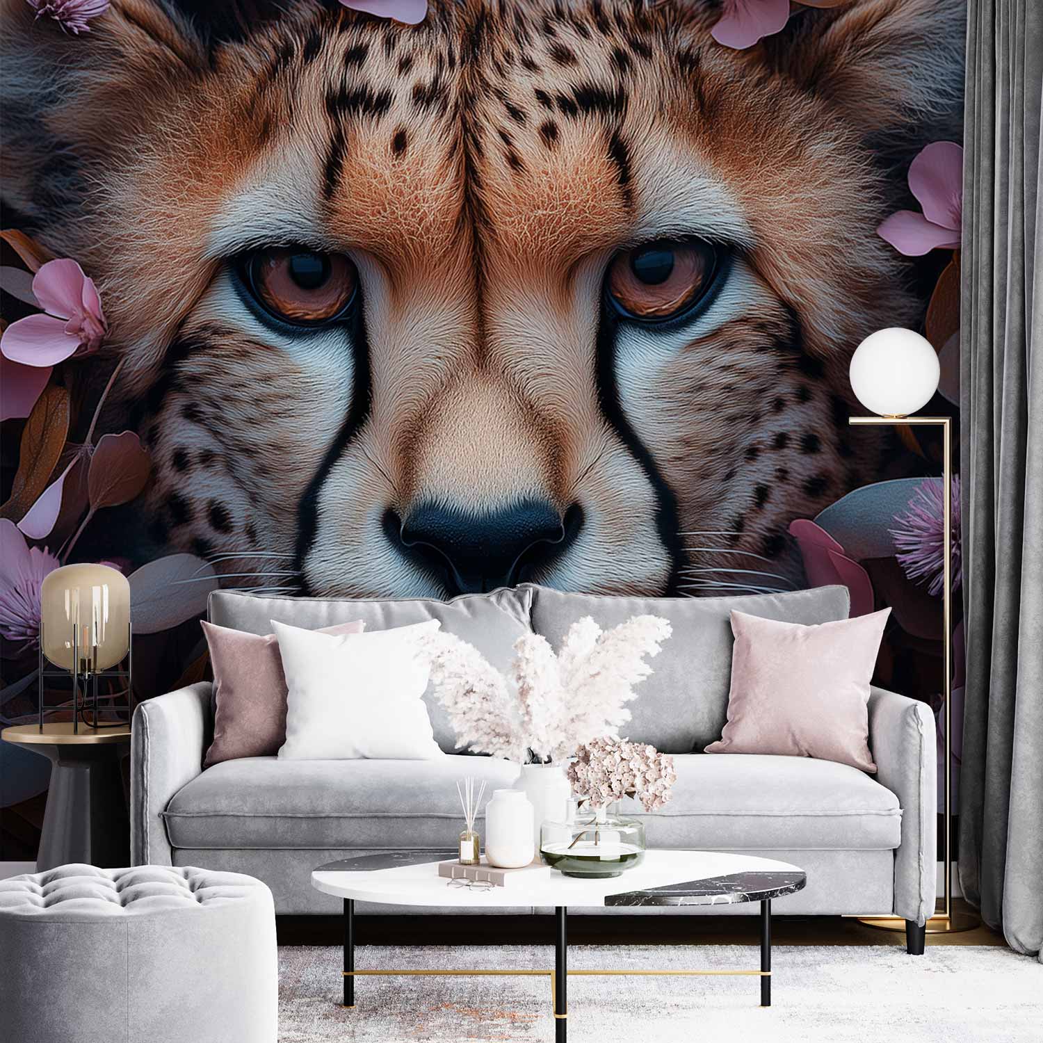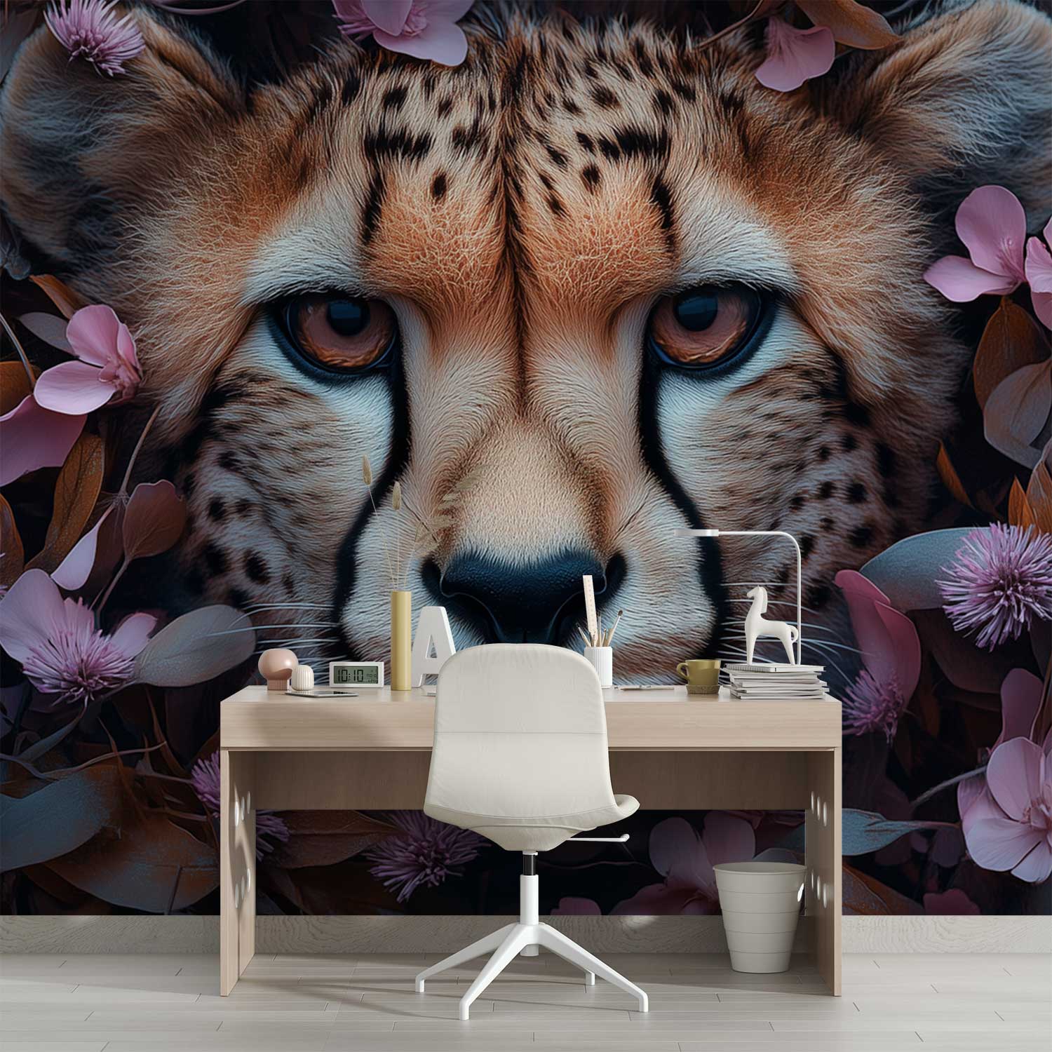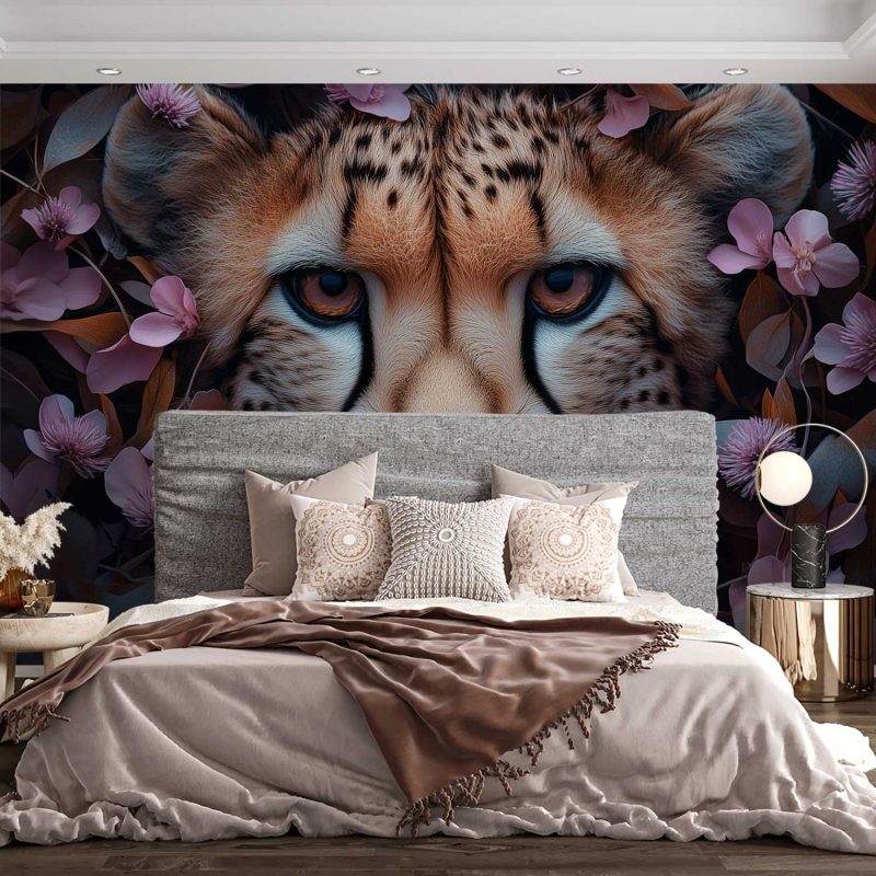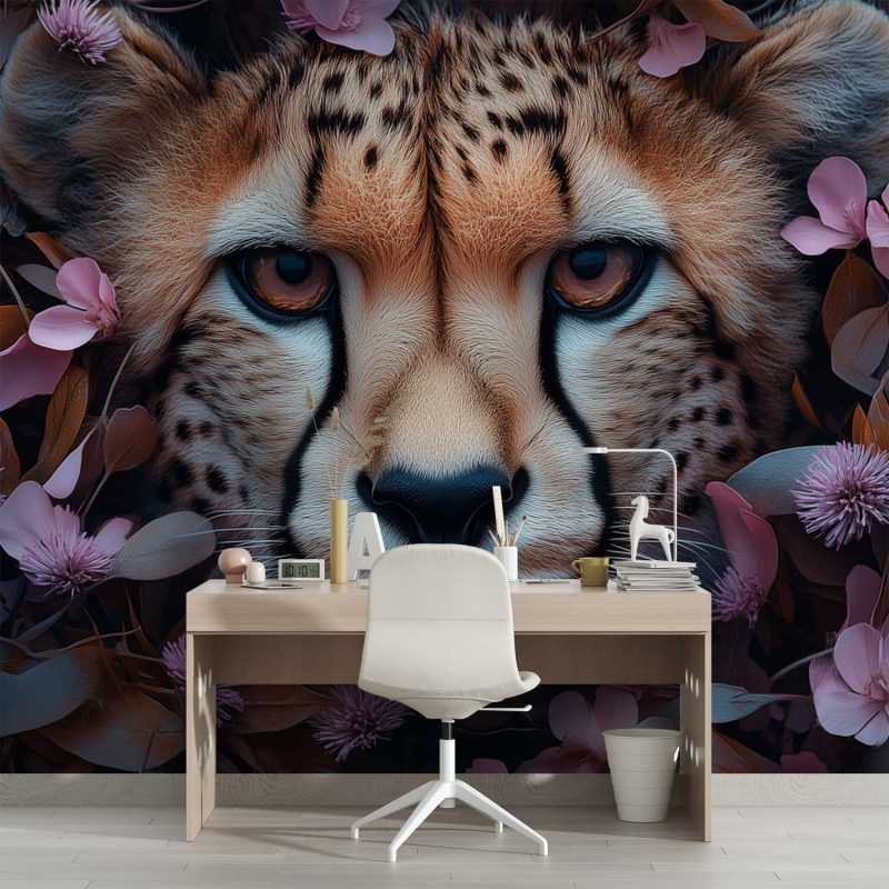 Zachte roze bloemen omarmen het krachtige gezicht van een jachtluipaard. Zijn gouden ogen stralen wilde elegantie uit terwijl de bloemenzee een serene sfeer creëert. Dit behang brengt harmonie en natuurlijke gratie in je interieur, waarbij de warme bruintinten perfect contrasteren met levendige roze accenten. Een betoverend tafereel dat elke muur transformeert tot een kunstzinnige ontdekkingsreis.