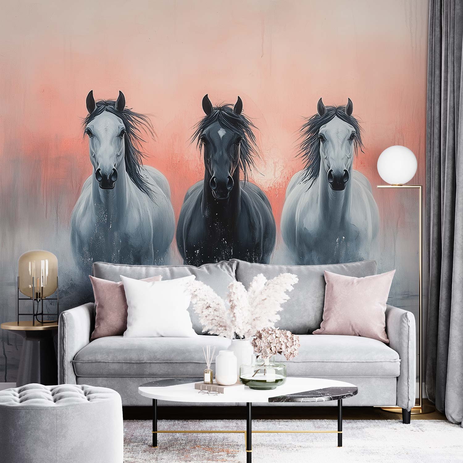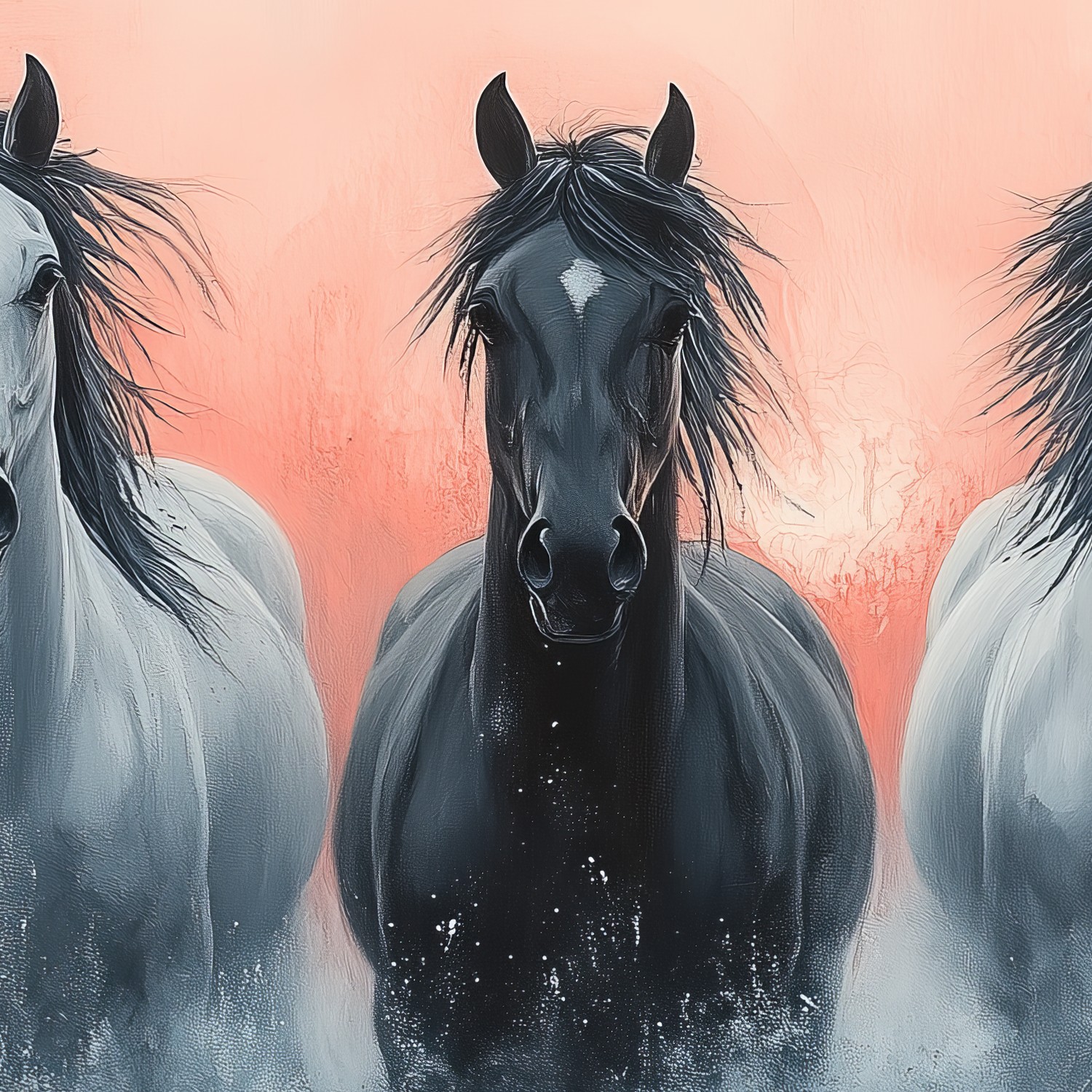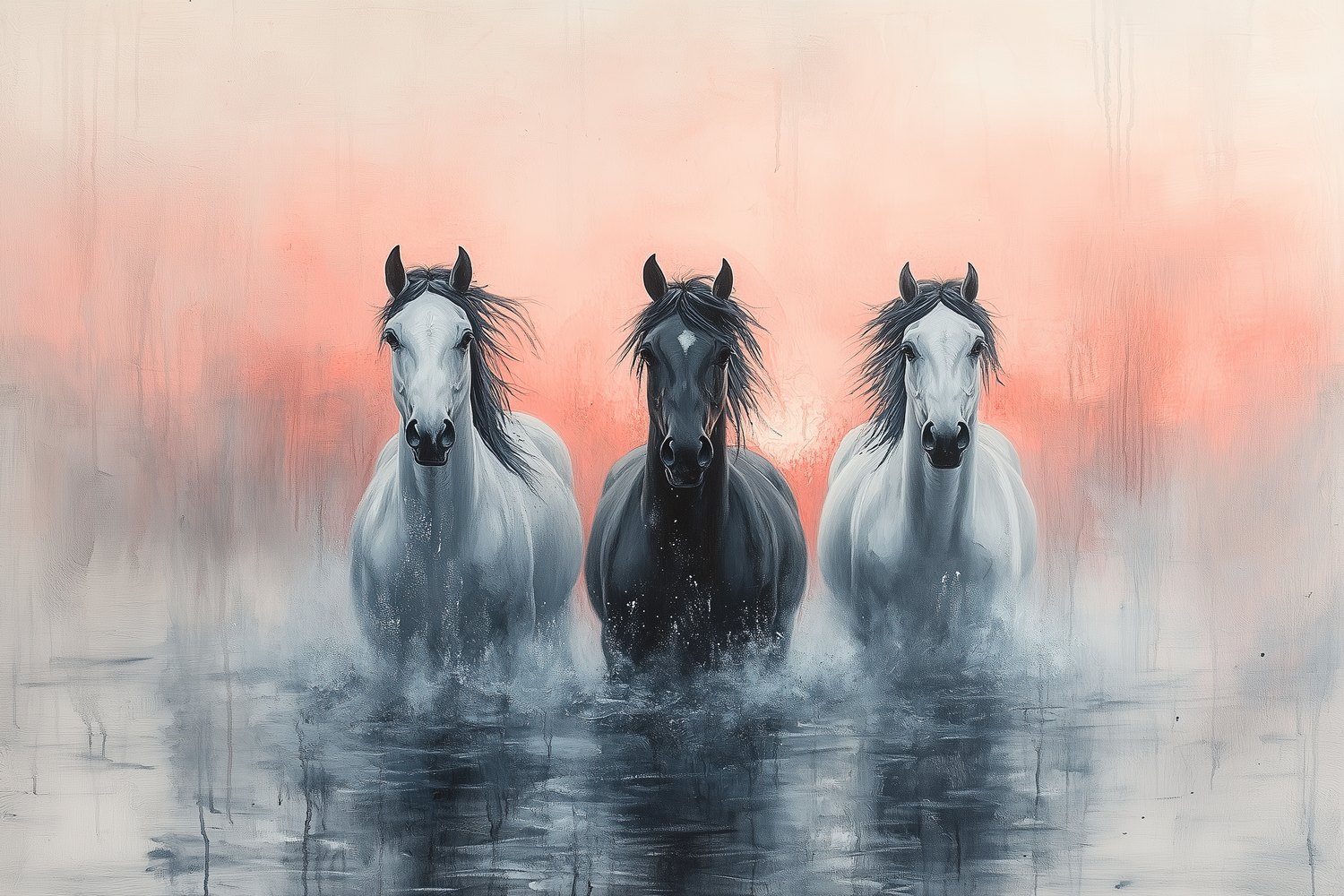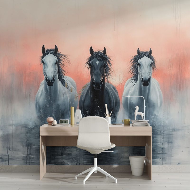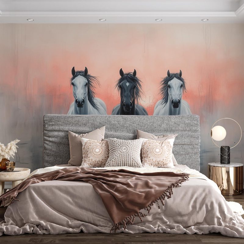 Vrijheid galoppeert in zwart en wit tegen een zachtroze achtergrond. Drie paarden stormen voorwaarts, hun krachtige lichamen vol gratie in beweging. Hun blikken grijpen je, brengen pure energie en dynamiek rechtstreeks je ruimte in. Dit levendige tafereel voegt een gevoel van openheid en natuurlijke schoonheid toe, perfect voor een interieur dat snakt naar leven en beweging.