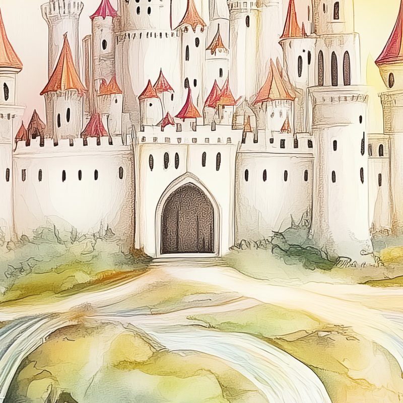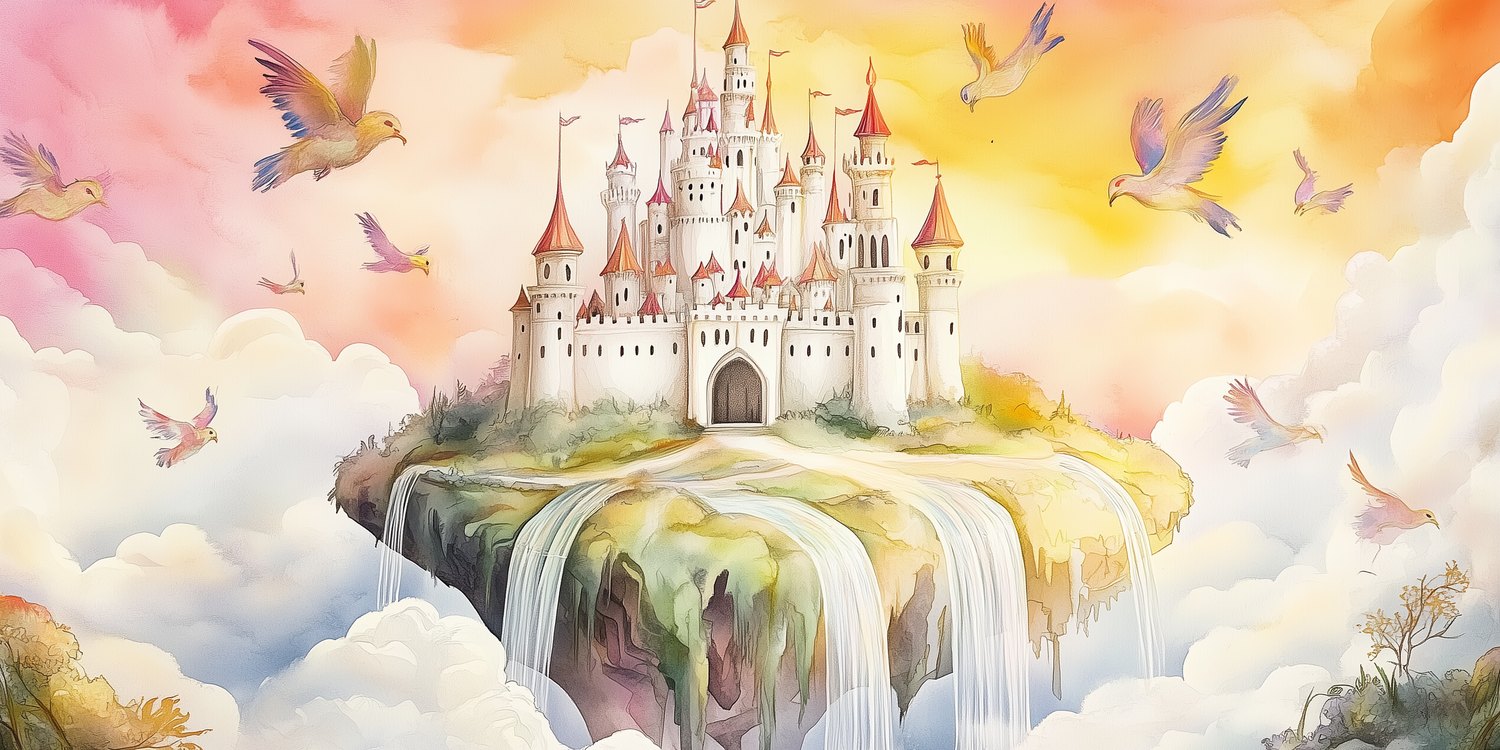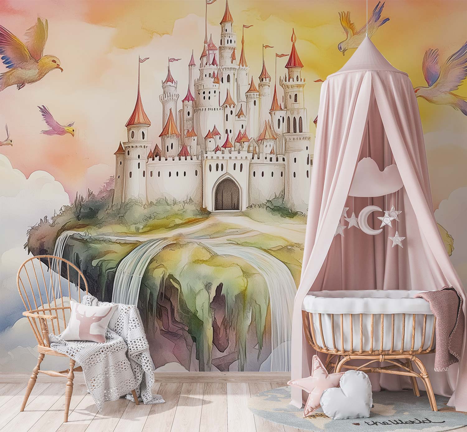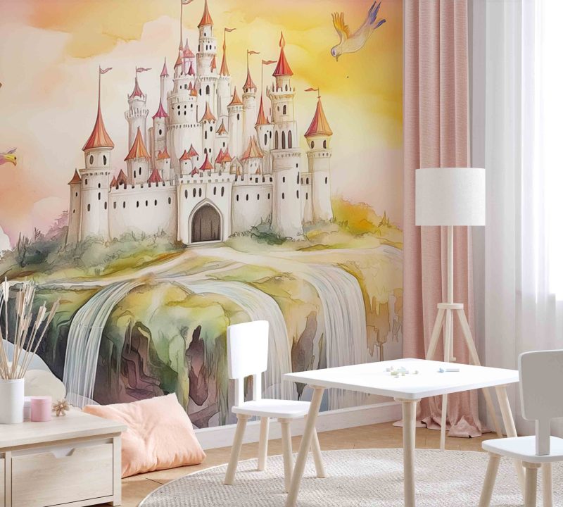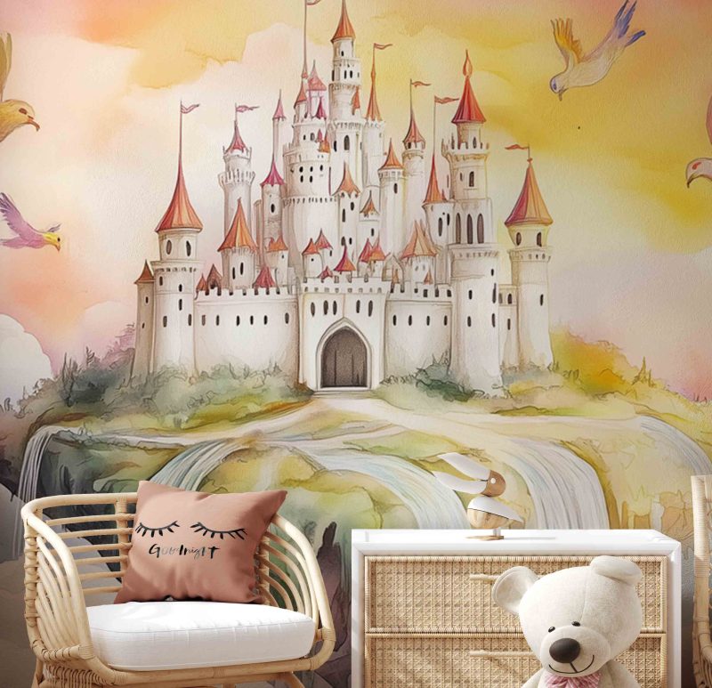 Vrolijke vogels dansen rond een zwevend sprookjeskasteel in tinten roze, geel en blauw. Dit levendige tafereel vol beweging en fantasie wekt pure verwondering, perfect om kinderdromen te stimuleren en de kamer te transformeren tot een magische speelruimte.