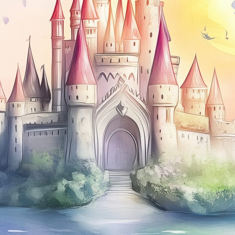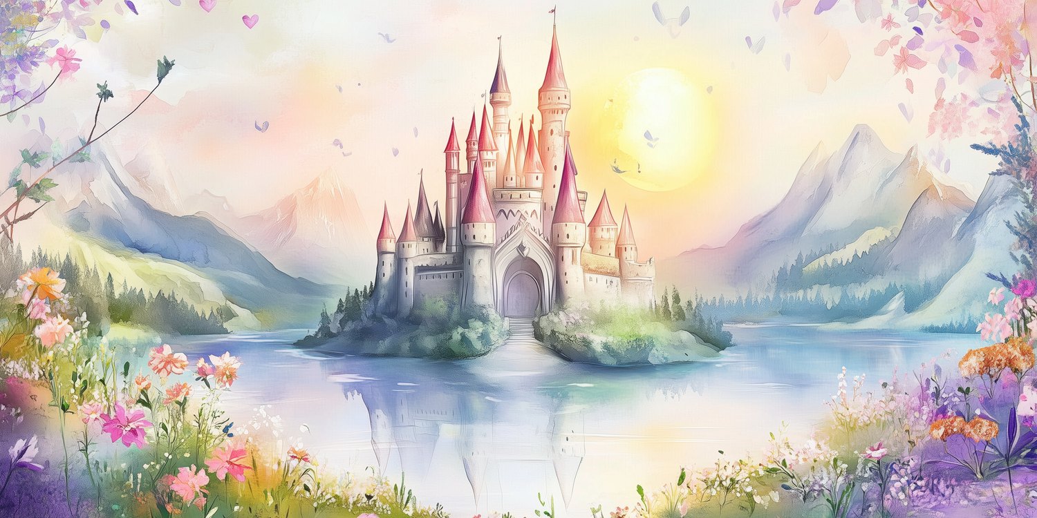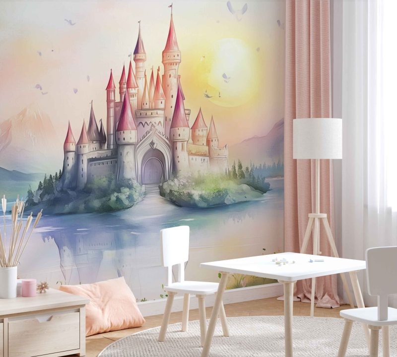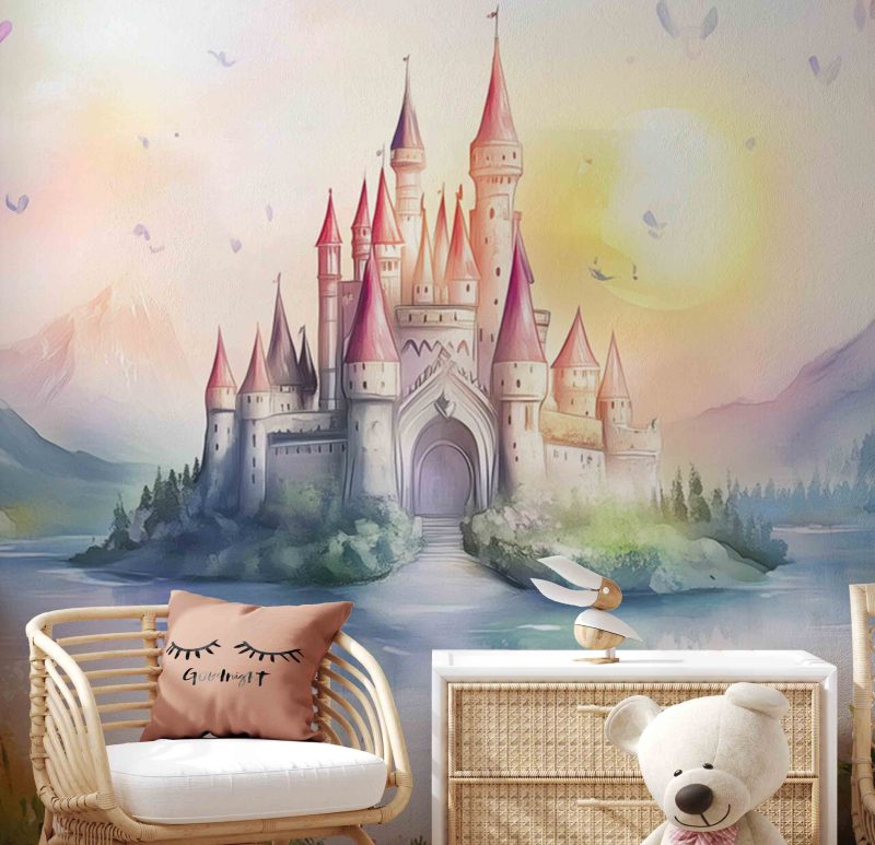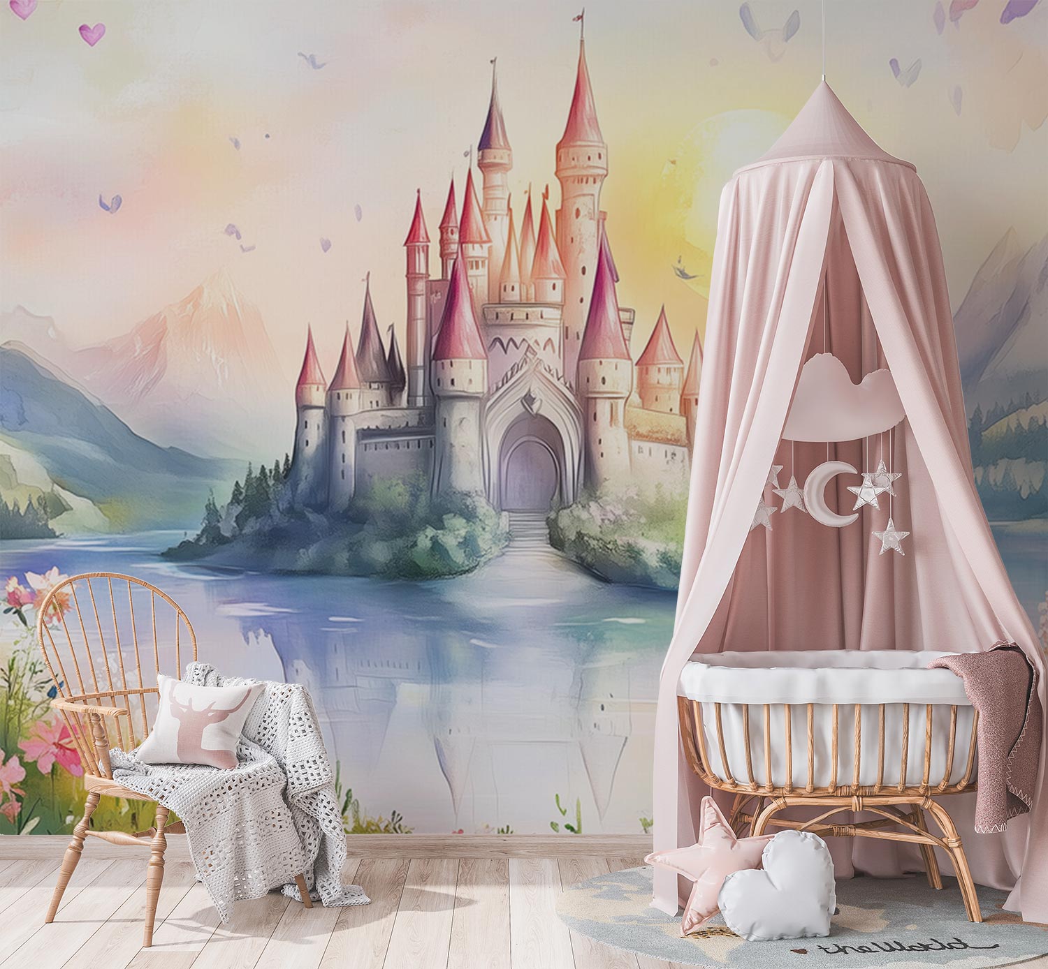 Zachte waterverfkleuren dansen over de muur en toveren een sprookjeskasteel op een bloemeneiland. Roze torens steken af tegen een zonnige blauwe lucht, omringd door groene tuinen vol leven. Deze droomwereld vol fantasie prikkelt de verbeelding en creëert een magische, rustgevende sfeer – perfect voor urenlang speelplezier en zoete dromen in de kinderkamer.