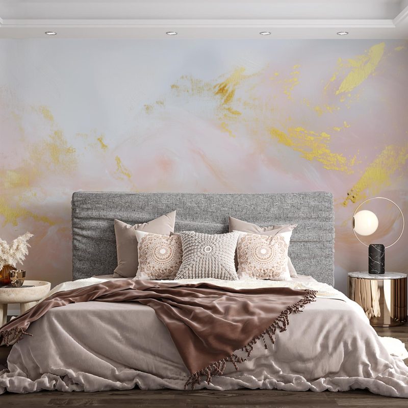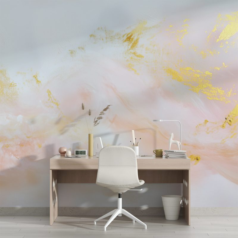 Zachte roze en gouden penseelstreken dansen elegant over een witte achtergrond, als een dromerige beweging die rust uitstraalt. Dit behang brengt een gevoel van serene luxe in je interieur, waar de vloeiende vormen en harmonieuze kleuren een kalmerende en stijlvolle sfeer creëren. Perfect voor een ruimte die verfijnde rust en visuele diepte verdient.