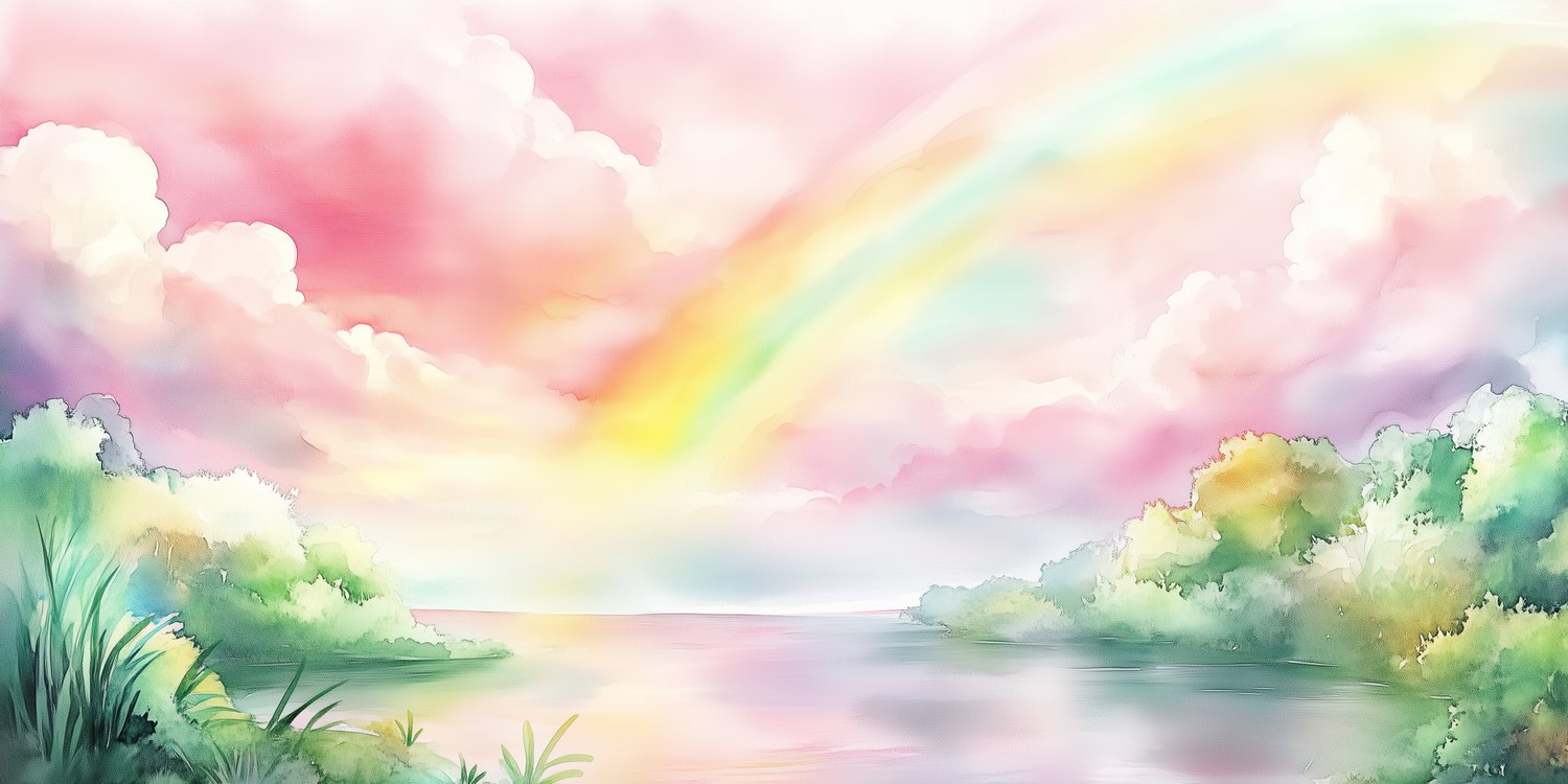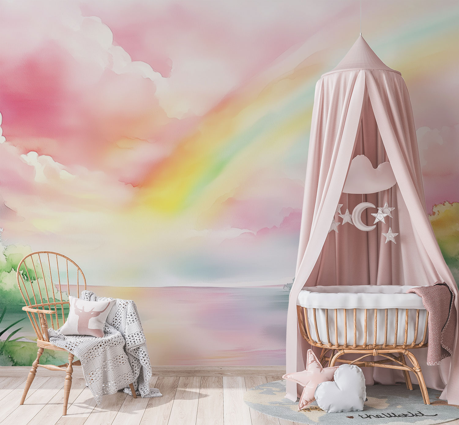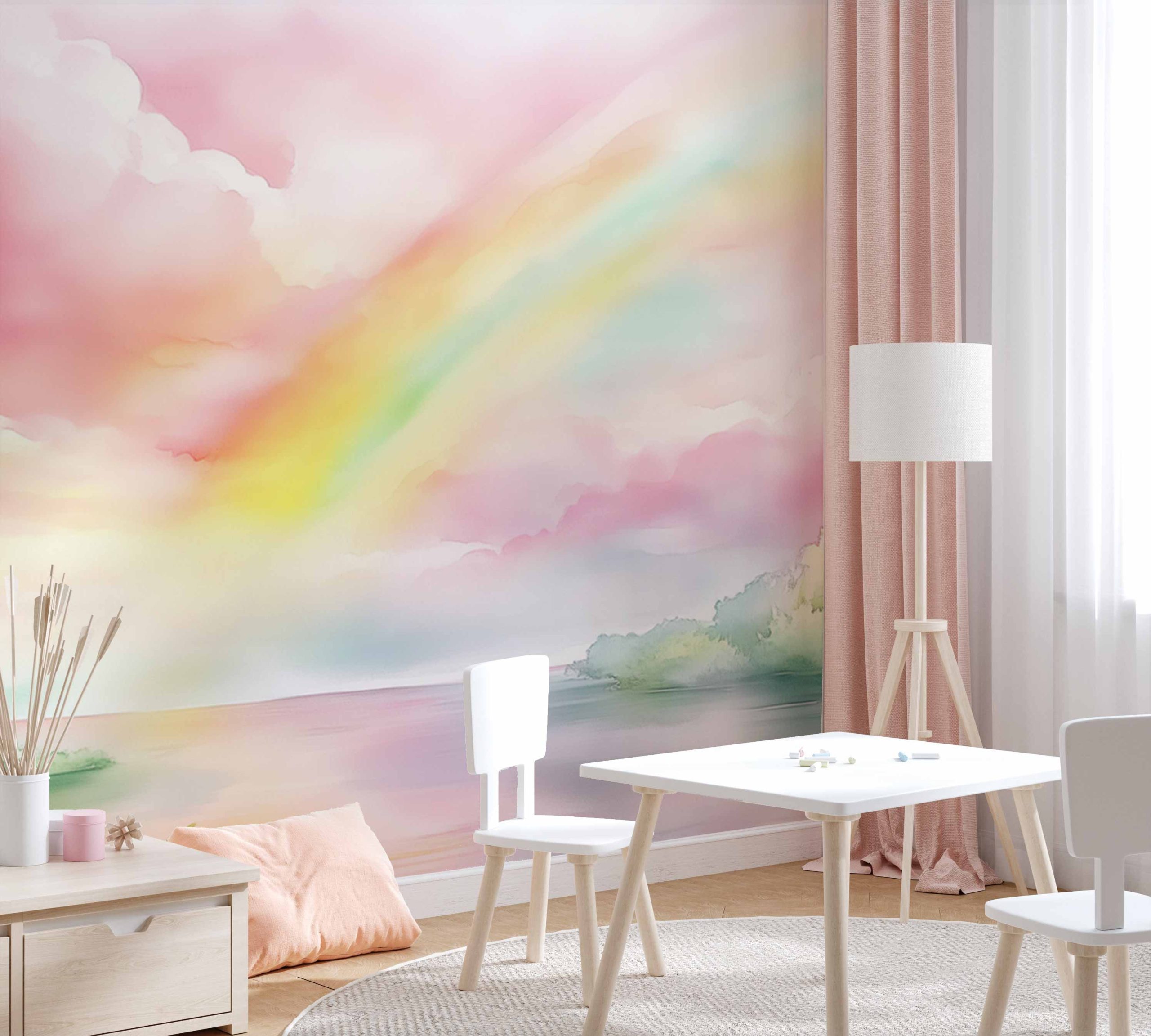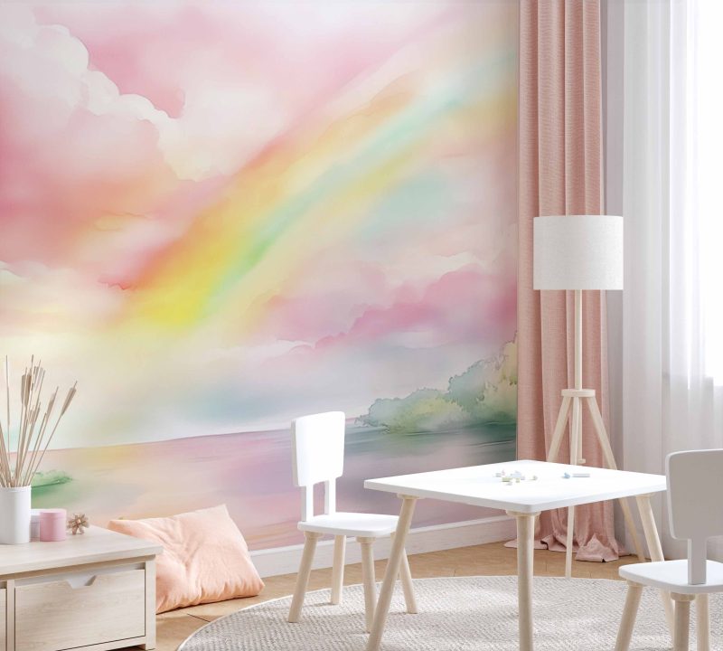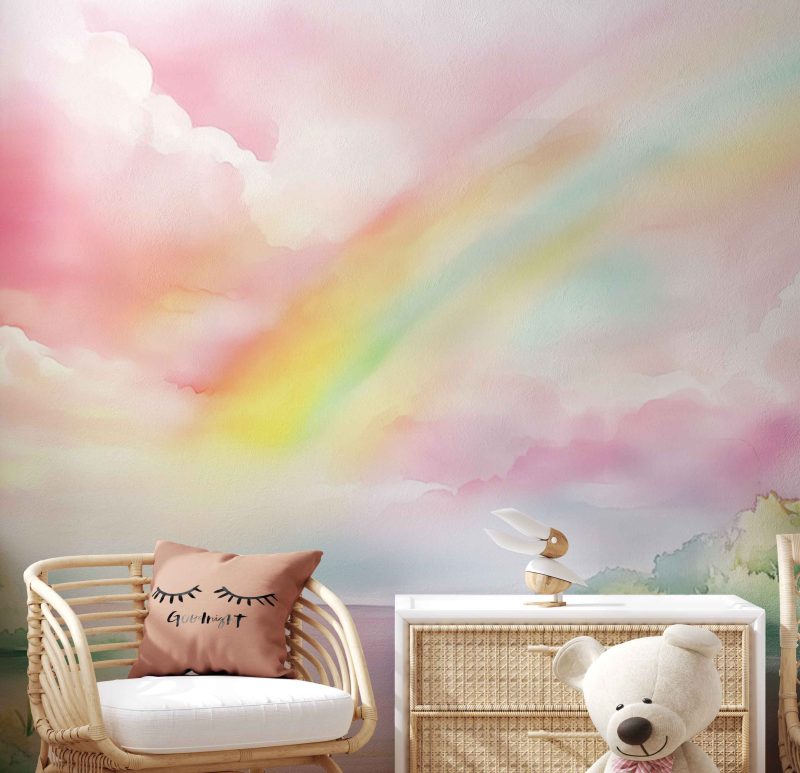 Dromerige waterverfkleuren dansen over de muur: een betoverende regenboog wervelt tussen roze wolken en groene bomen. Alsof je door een sprookjeslandschap loopt waar de lucht zacht zingt en de natuur tot leven komt. Perfect voor een kinderkamer vol verwondering – deze magische wereld stimuleert de fantasie en brengt rustige, vrolijke energie.