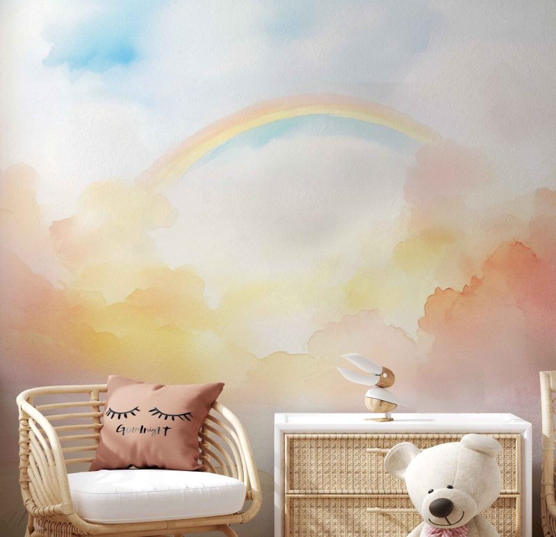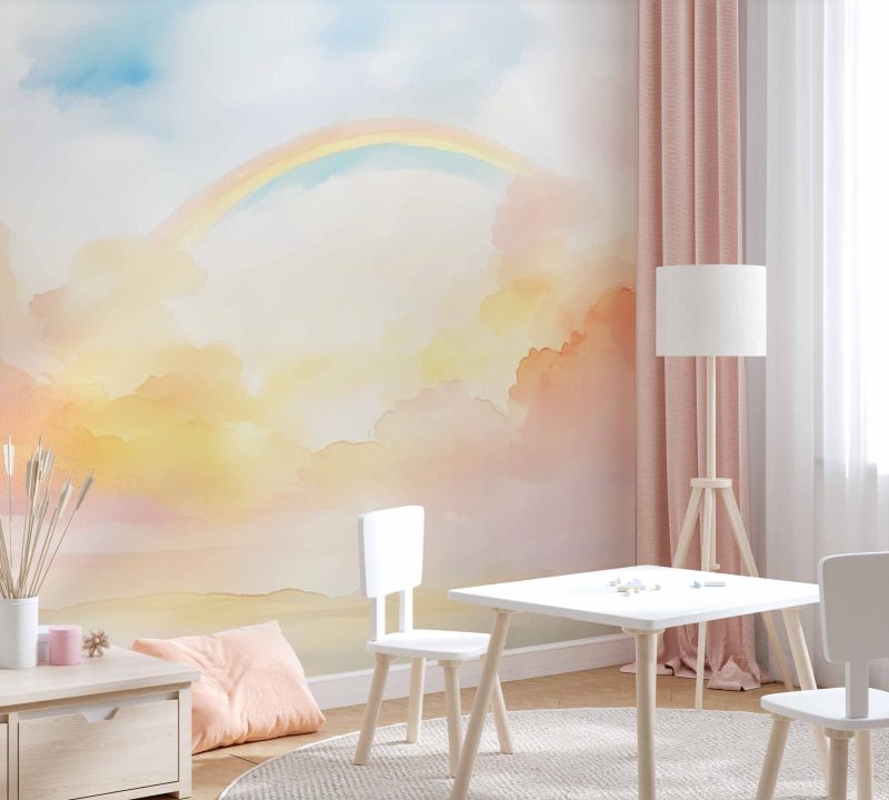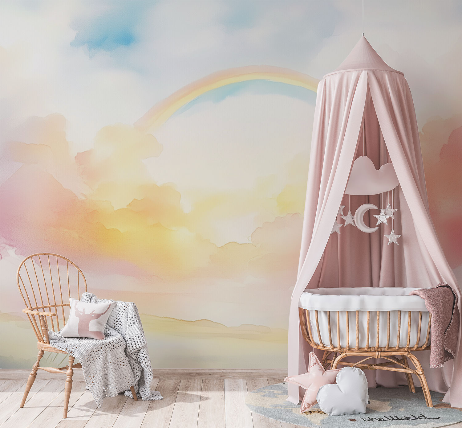 Zachte pastelwolken dansen door de lucht en omarmen een betoverende regenboog die kleur sprankelt over de muren. Dit dromerige waterlandschap brengt rust en verwondering in de kinderkamer, waar kleine dromers urenlang wegdwalen in dit vredige tafereel vol fantasie. Perfect voor een kalme en magische speelomgeving die de verbeelding prikkelt.