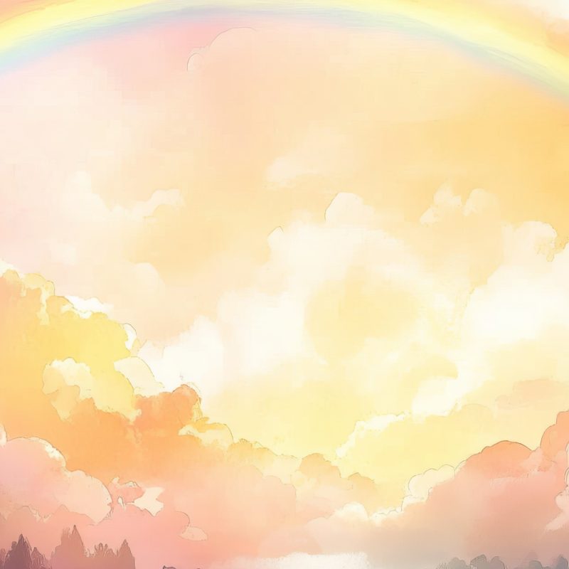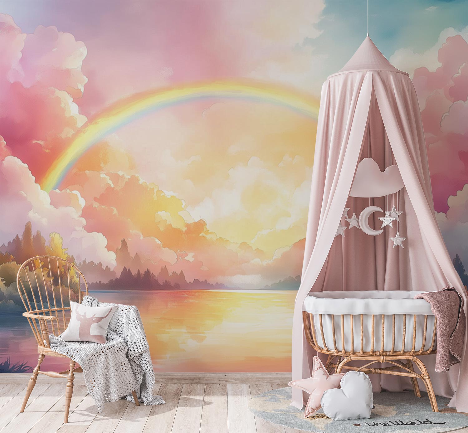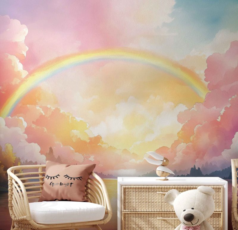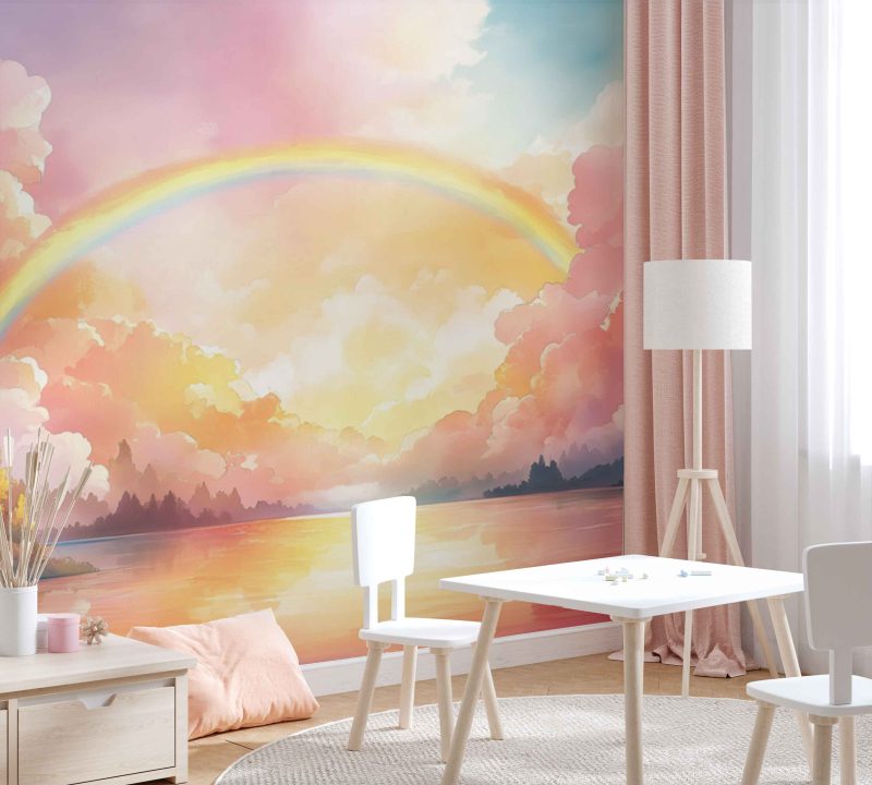 Zachte roze, blauwe en gele tinten dansen over het water, waar een levendige regenboog zich weerspiegelt in het kalme meer. Omringd door groene heuvels en bomen, wekt dit dromerige tafereel een gevoel van harmonie en verwondering op. Perfect voor een kinderkamer, het stimuleert de verbeelding en brengt een vredige, vrolijke sfeer waarin avonturen tot leven komen.