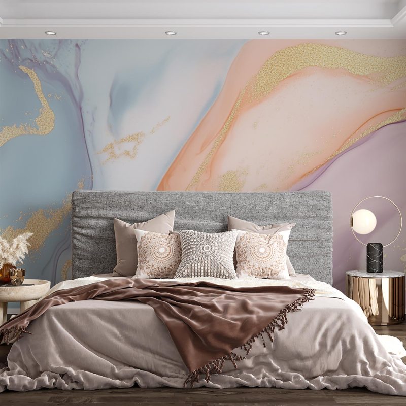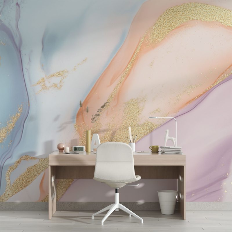 Dansen in een zee van vloeibaar blauw en roze, waar gouden vonken als feeërieke lichtjes dansen. Dit levendige abstracte behang brengt magische beweging en glamour in je ruimte. De weelderige kleurenmengeling creëert een dromerige sfeer vol elegantie, perfect om elke muur te transformeren tot een kunstwerk dat verwondering wekt en sophistication uitstraalt.
