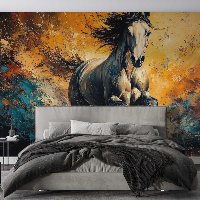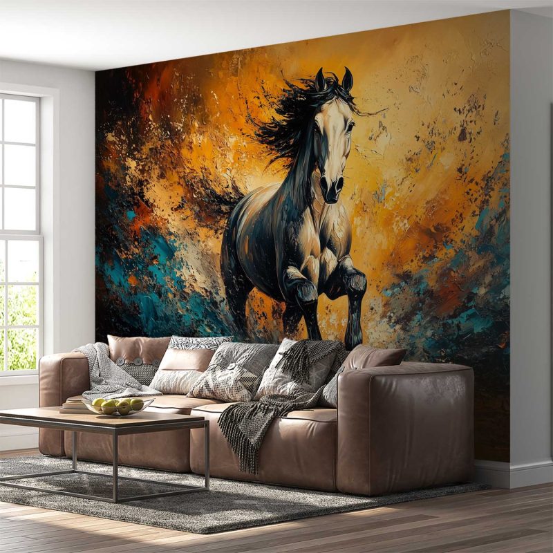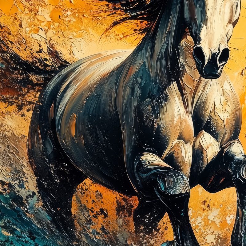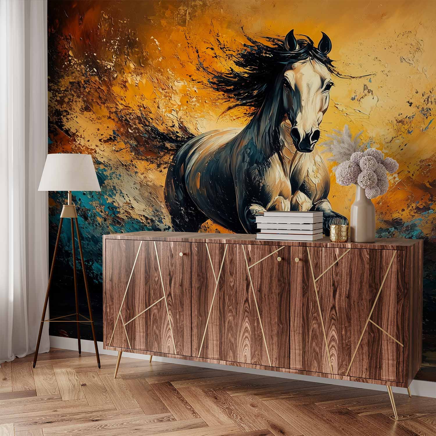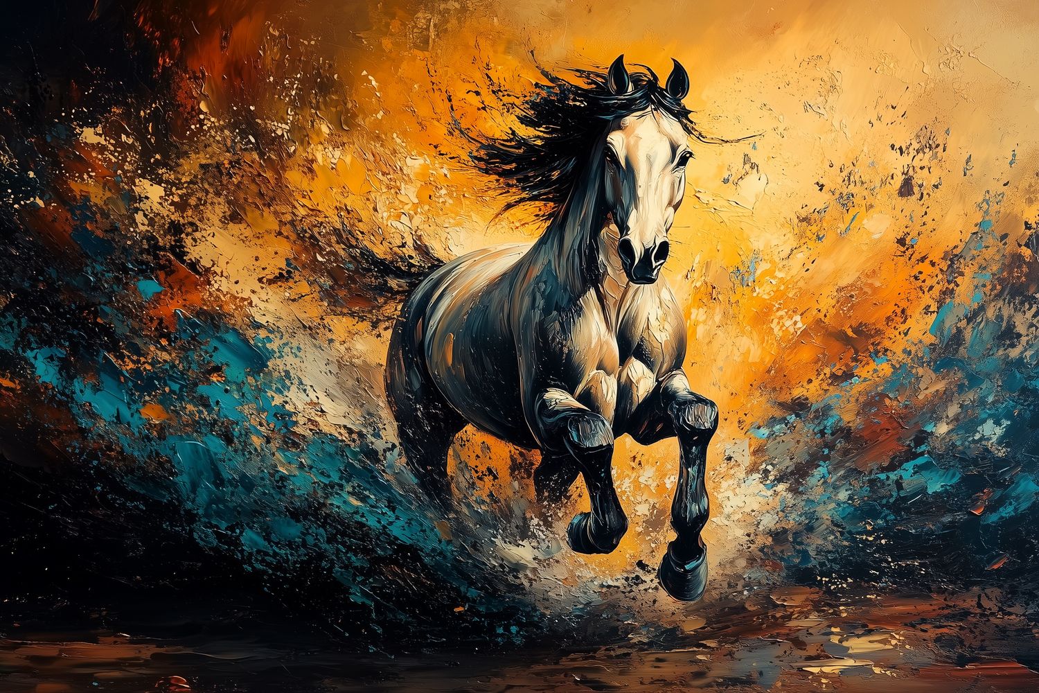 Vurige oranje en blauwe tinten wervelen rond dit krachtige paard in volle galop. Levendige penseelstreken vangen de pure energie en dynamiek van beweging. Zijn gespierde lijf baant zich een weg door het kleurenspectrum, een statement van vrijheid en kracht. Brengt passie en drama in je interieur, perfect voor een accentmuur die durft te spreken.