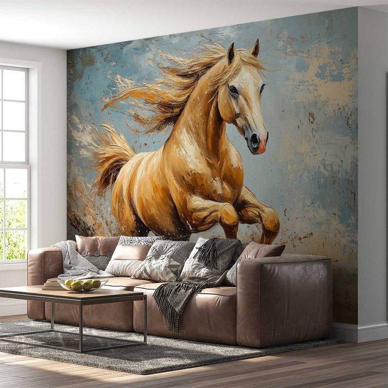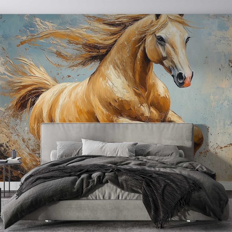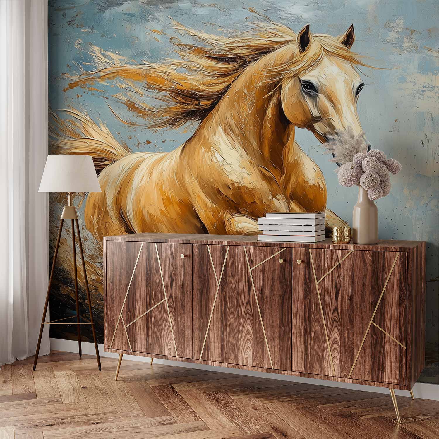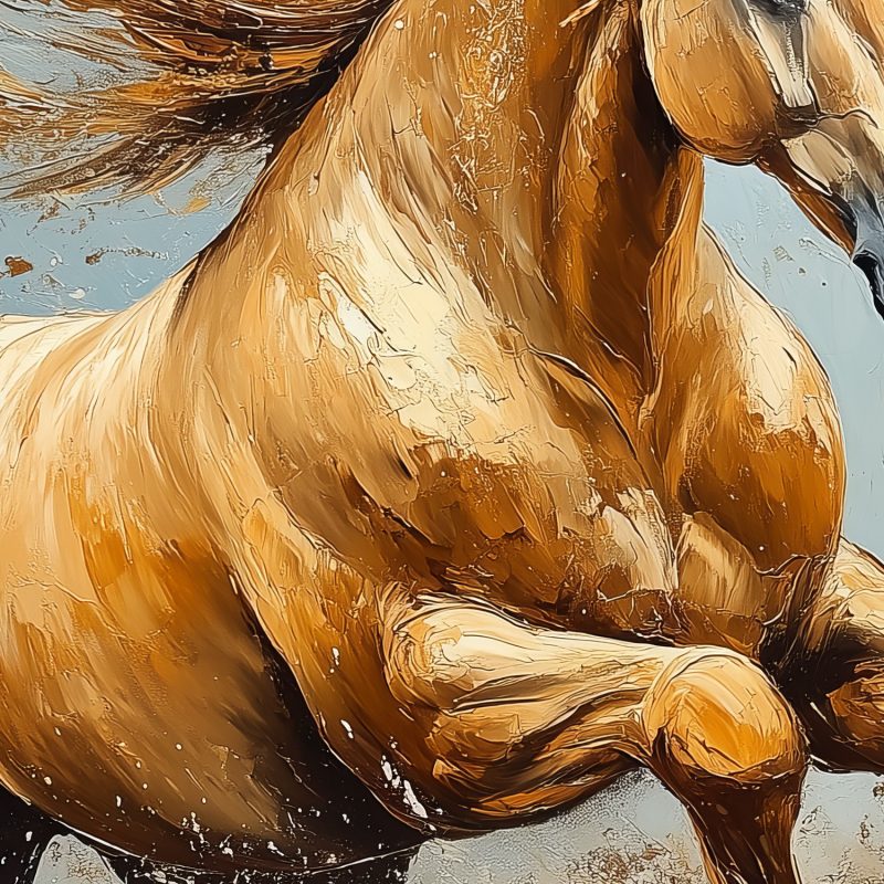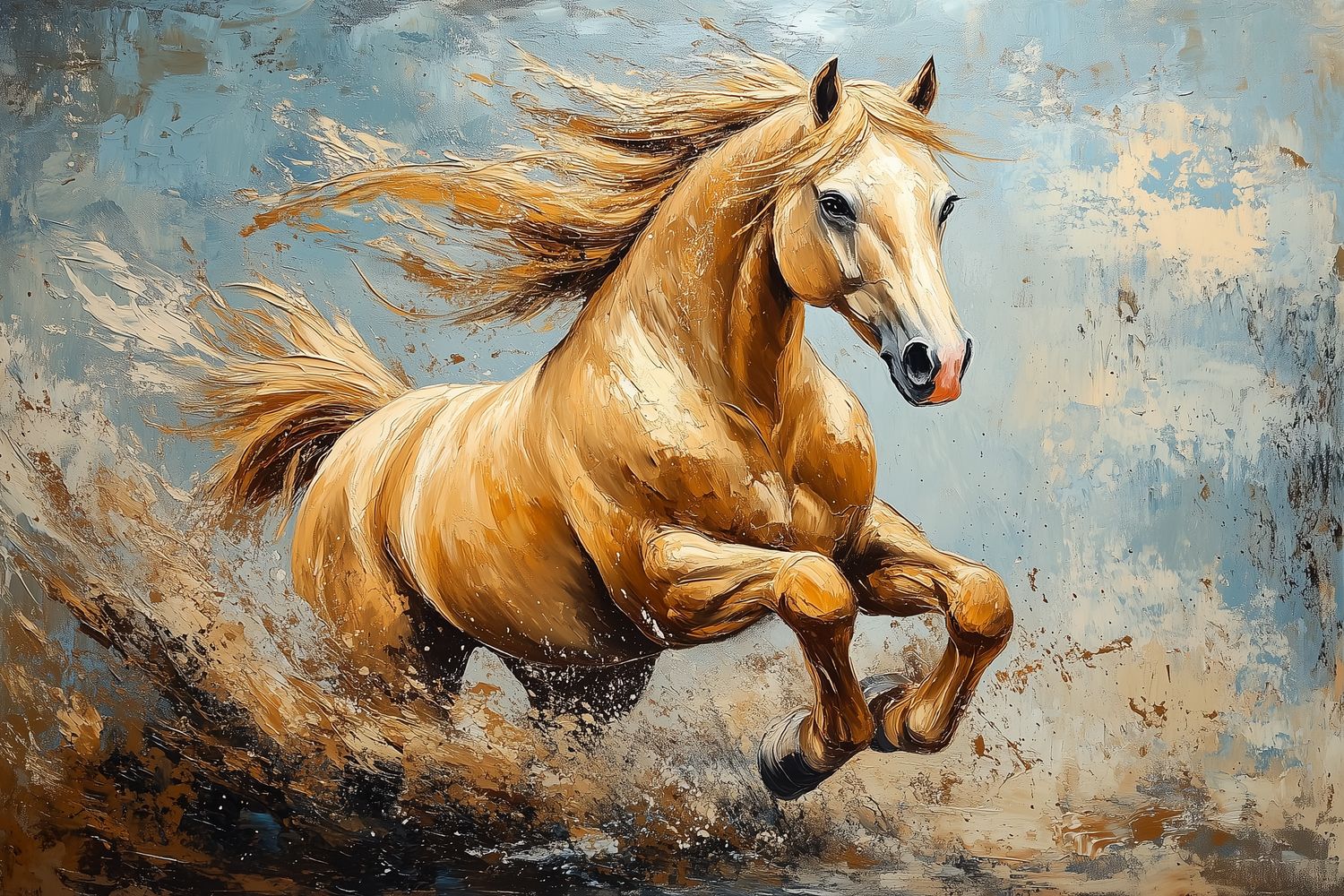 Vlugge penseelstreken vangen een krachtig paard in volle galop. Zijn bruine vacht glanst terwijl manen en staart wuiven in de wind. Tegen een zacht blauwe achtergrond komt dit levendige tafereel tot leven. De dynamische energie brengt beweging in je ruimte, terwijl de serene kleuren balans bieden. Perfect voor wie verfijnde actie en rust zoekt in het interieur.