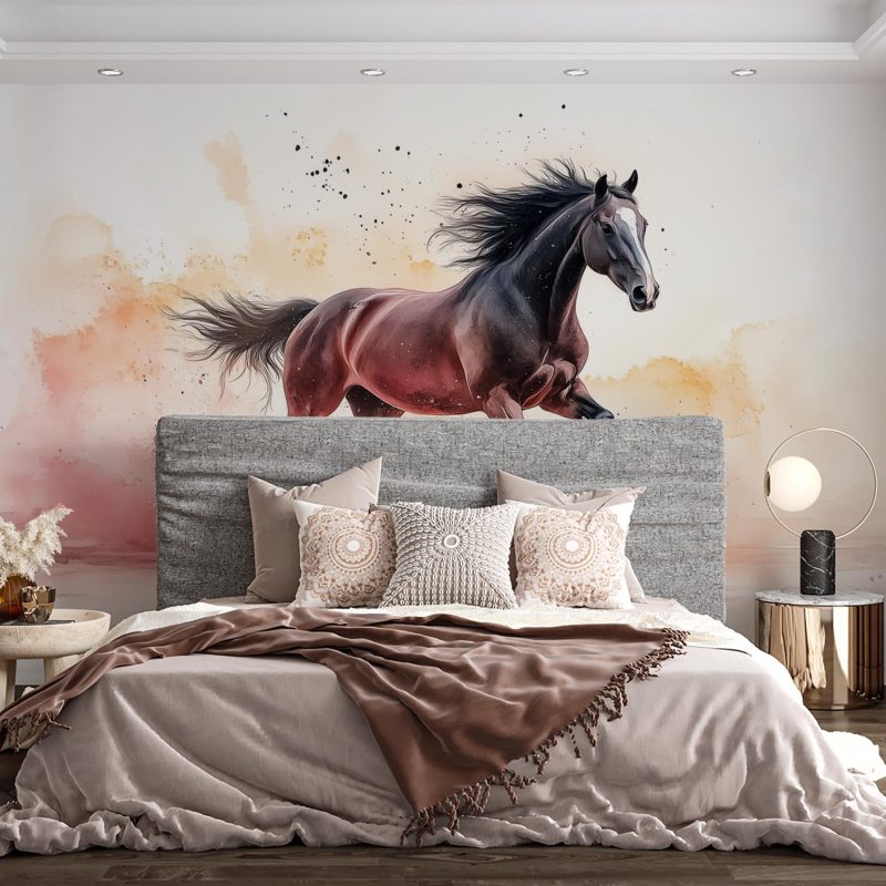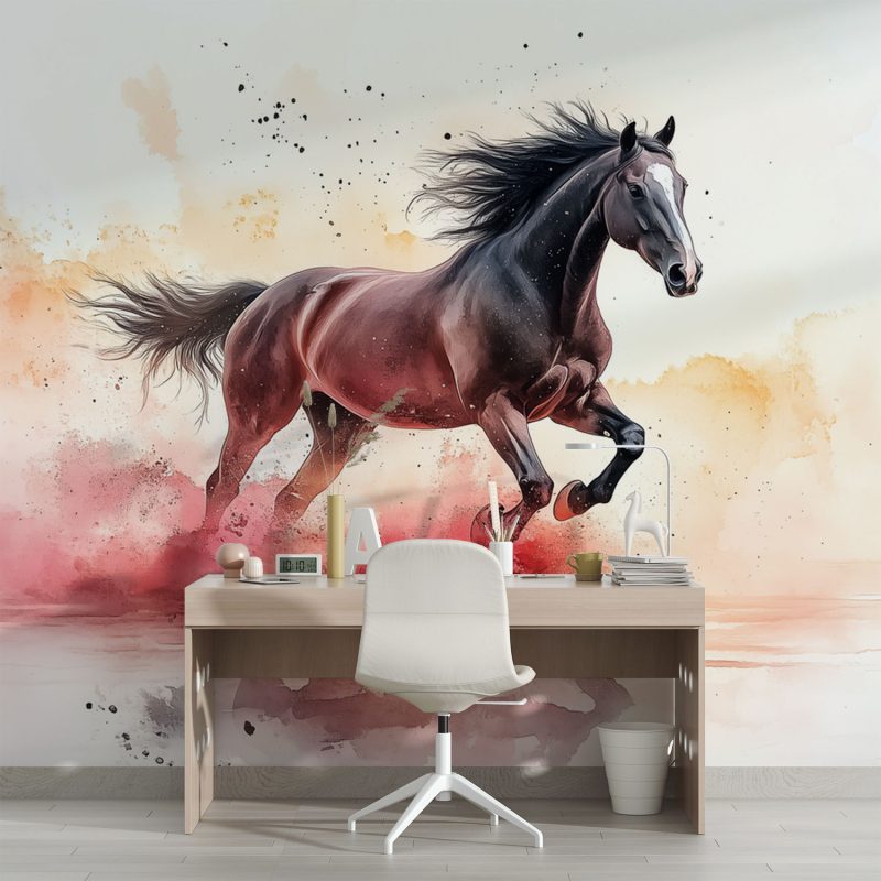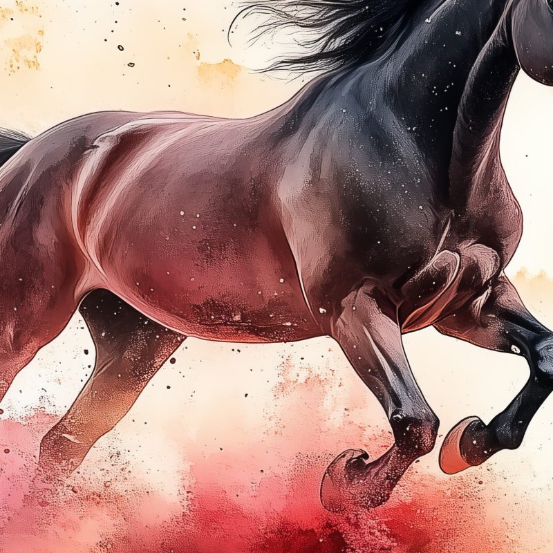 Vurige tinten bruin en rood dansen over het doek, waar een krachtig paard vol overgave door het water galoppeert. Zijn manen wapperen wild in de beweging, terwijl waterverftechnieken een gevoel van vrijheid en energie uitstralen. Dit levendige kunstwerk brengt dynamiek en passie in elke ruimte, perfect voor wie verlangt naar een statement vol leven en emotie in het interieur.