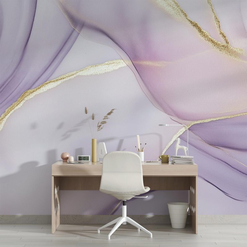 Zachte paarse tinten dansen elegant met gouden accenten, als een fluwelen schemering die subtiel oplicht. Dit abstracte patroon ademt rust en verfijning, waarbij het goud zorgt voor een speelse lichtval die de ruimte verdiept. Perfect voor wie verfijning zoekt: het transformeert elke muur tot een kunstwerk dat zowel luxe uitstraalt als een harmonieuze sfeer creëert.