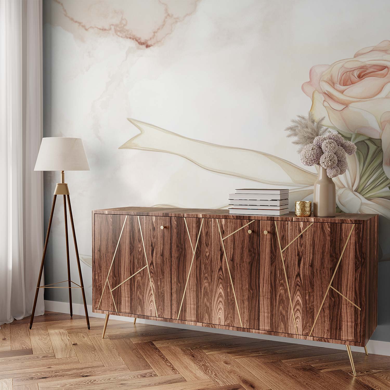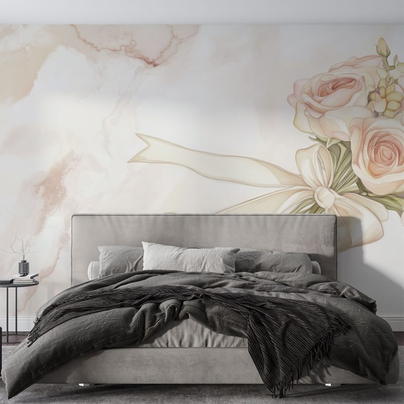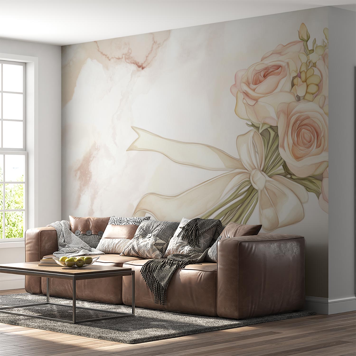 Roze rozen dansen in een elegante bundel, samengebonden door een zijdezacht lint. Hun fluwelen blaadjes werpen subtiele schaduwen op een marmeren achtergrond die luxe uitstraalt. Dit behang ademt romantische sereniteit en brengt een viering van liefde in elke ruimte. Perfect voor interieurs die verfijning zoeken zonder overdadigheid, het creëert harmonie en blijft visueel boeiend.