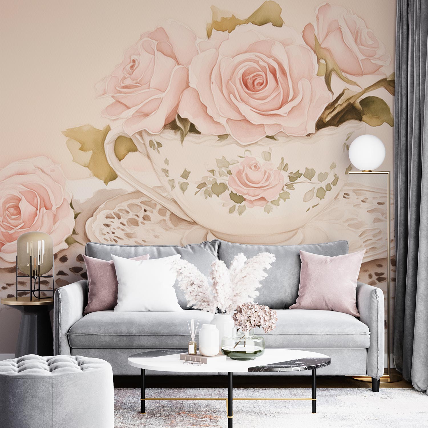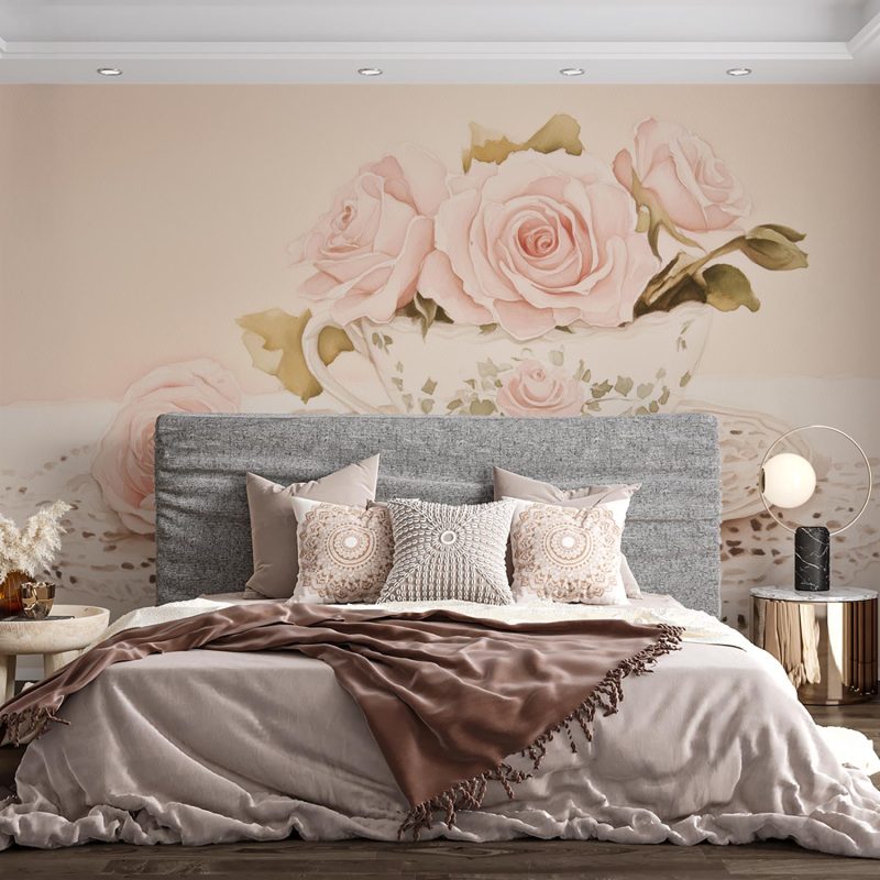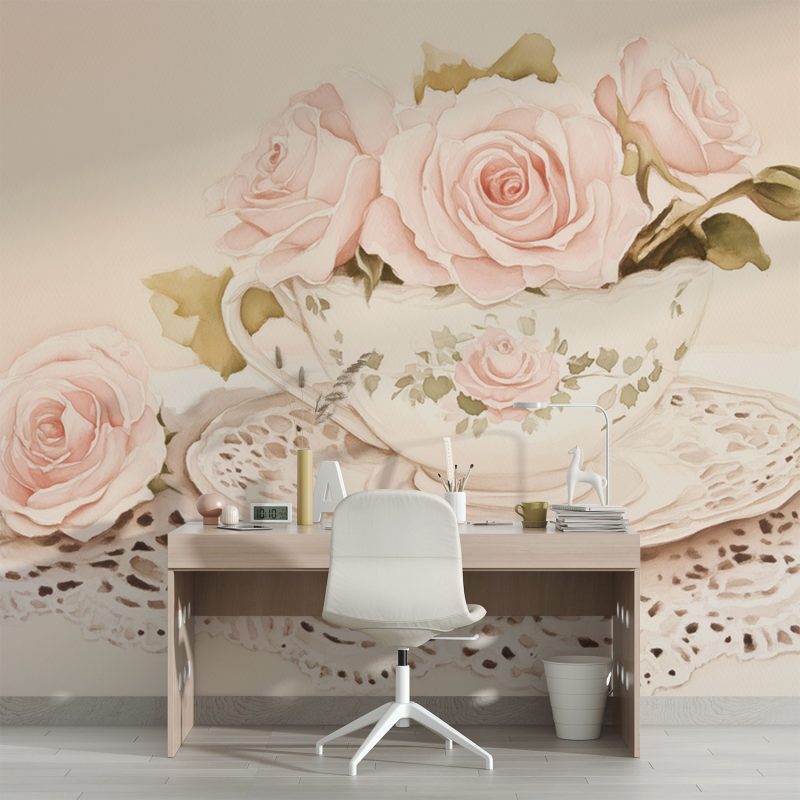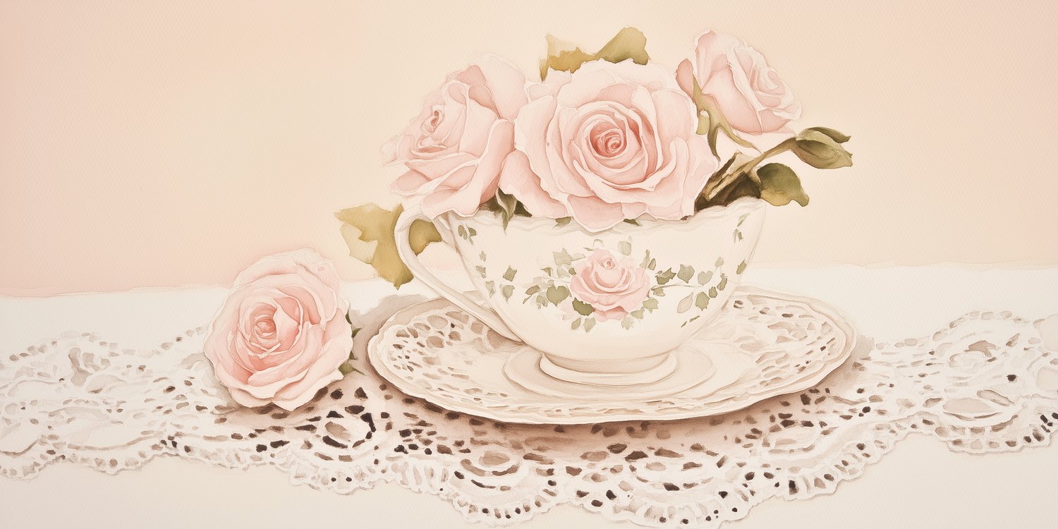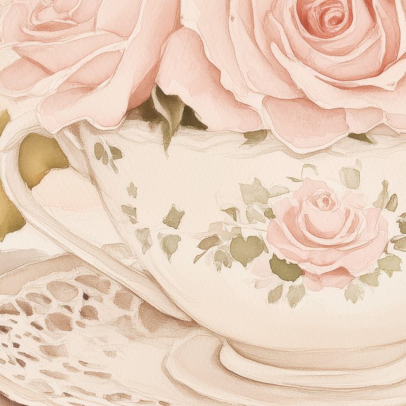 Zachte roze rozen ontvouwen zich in een porseleinen kopje, gedrapeerd over kantwerk dat dansende schaduwen werpt. Dit behang brengt de tijdloze charme van een theemoment in huis, waar romantische elegantie en rust samensmelten. Perfect voor een leeshoek of slaapkamer, het wekt een gevoel van vertrouwde warmte en verfijnde eenvoud op zonder overweldigend te zijn.