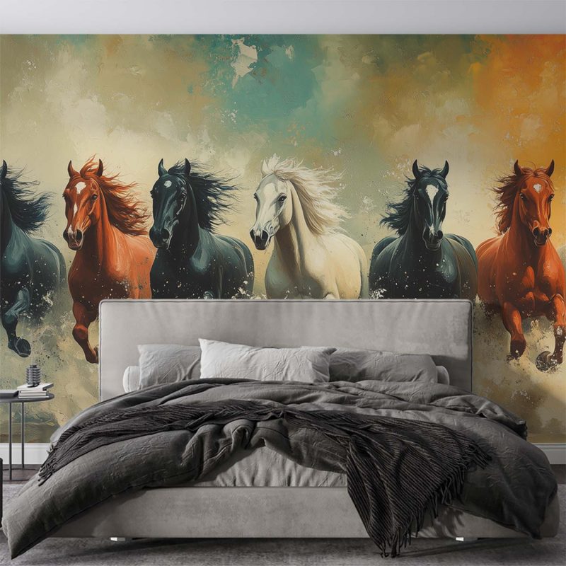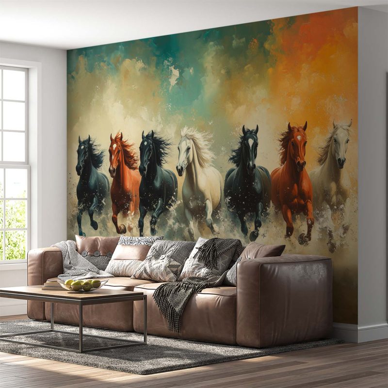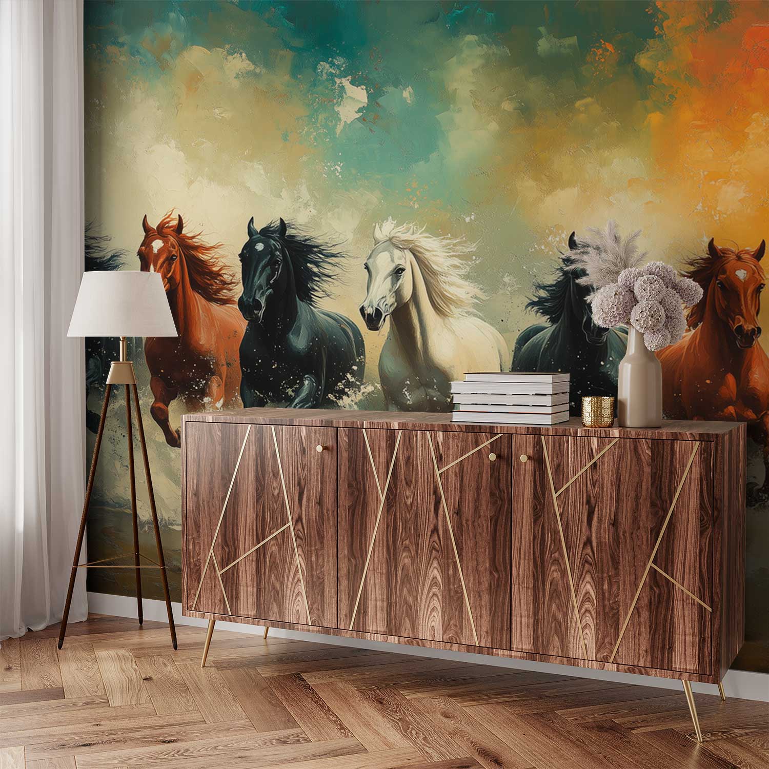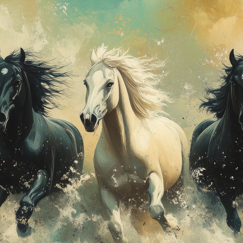 Vurige paarden galopperen door het water, hun kleurrijke kracht vangt de ziel van pure vrijheid. Dit levendige tafereel brengt ongeremde energie en avontuur in elke ruimte, waar impressionistische penseelstreken de muur tot leven wekken. De dynamische compositie voegt een gevoel van beweging en diepte toe, perfect om een statement te maken in moderne of eclectische interieurs.