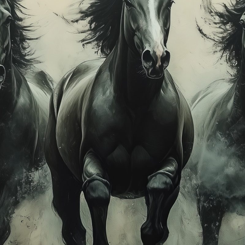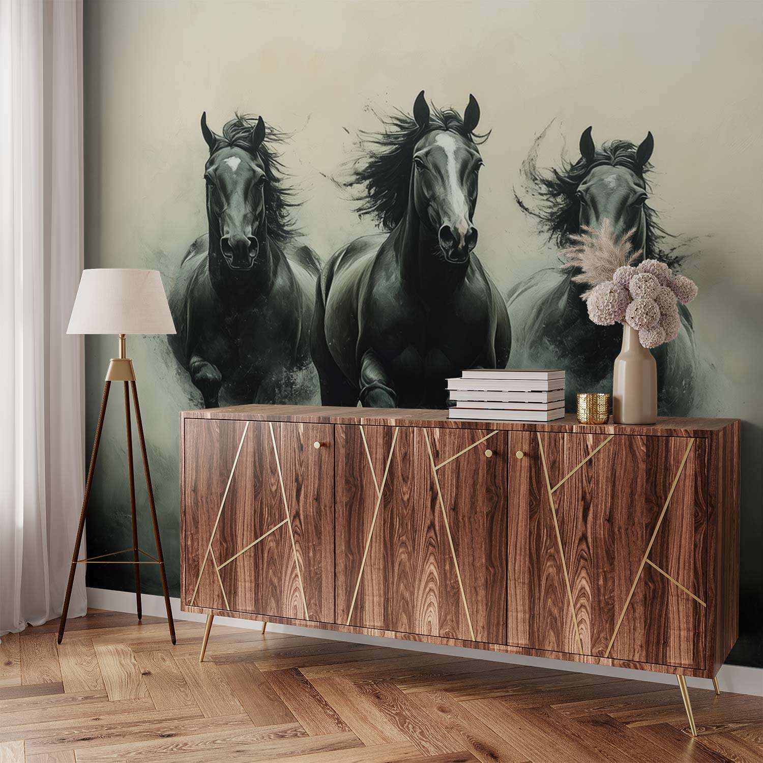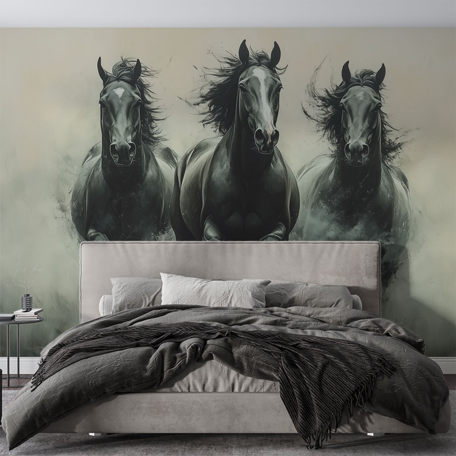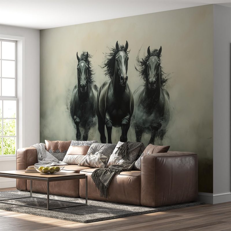 Vurige energie spat van dit zwart-witte behang. Drie paarden stormen in volle galop voorbij, hun krachtige lichamen vastgelegd in dynamische beweging. Stofwolken dansen om hun hoeven terwijl ze door het landschap razen. De krachtige contrasten en levendige compositie brengen pure actie in je ruimte. Dit tijdloze kunstwerk voegt een dramatisch, elegant statement toe aan elk modern interieur.