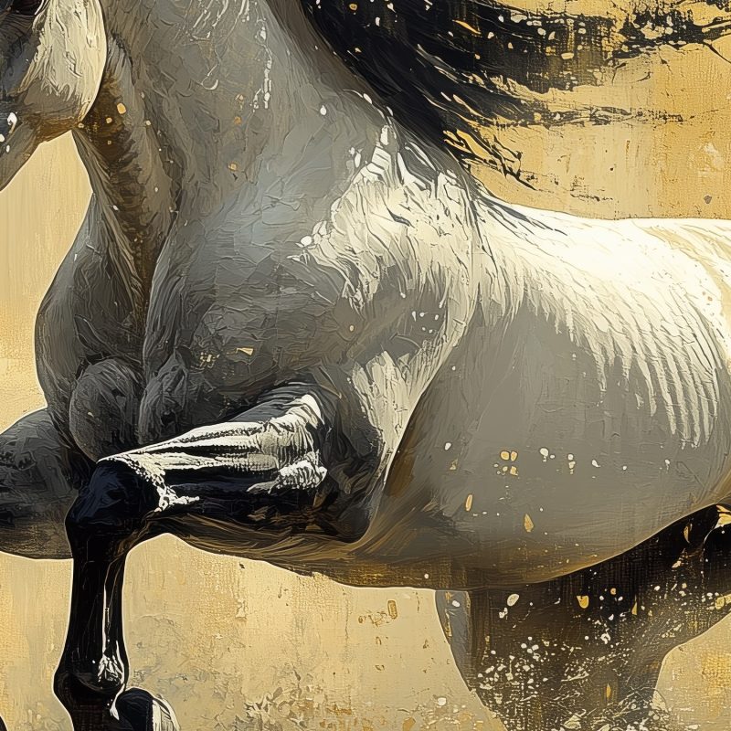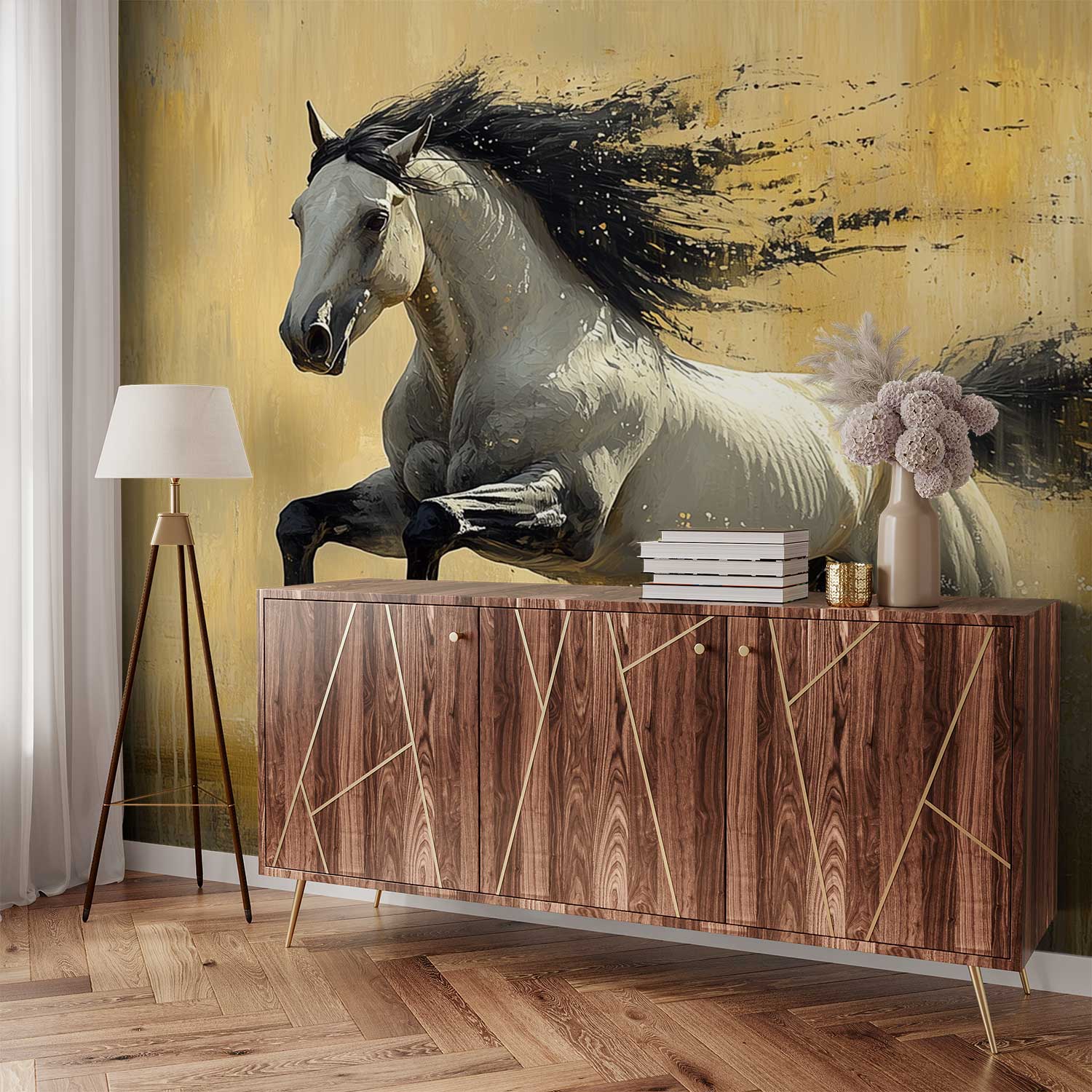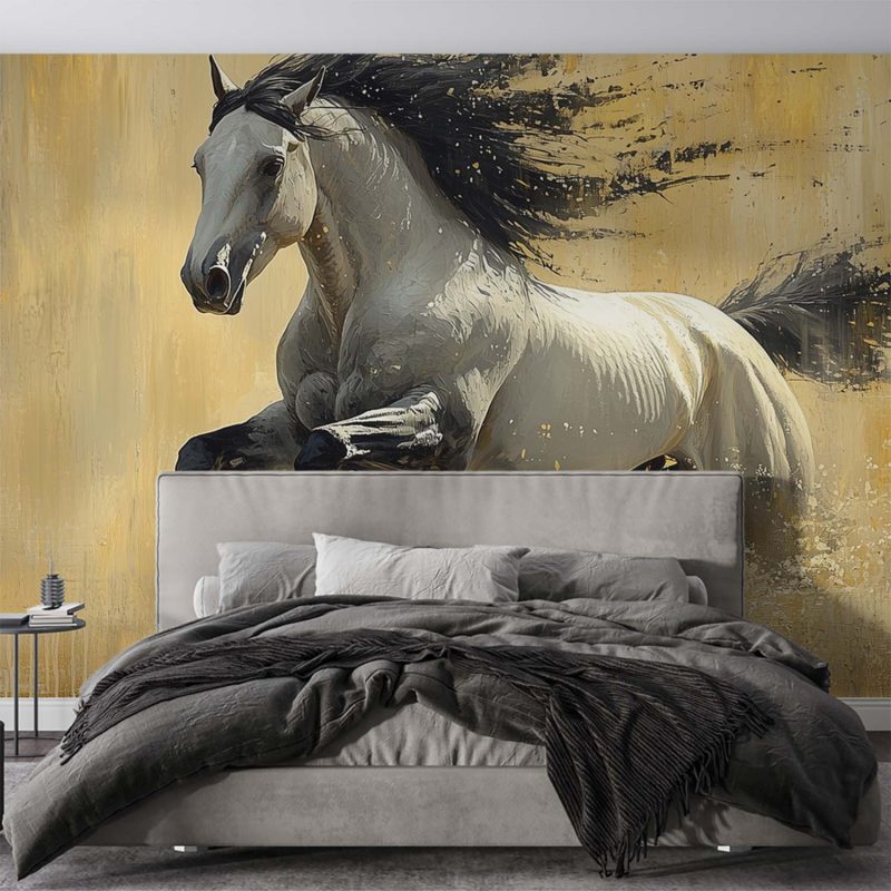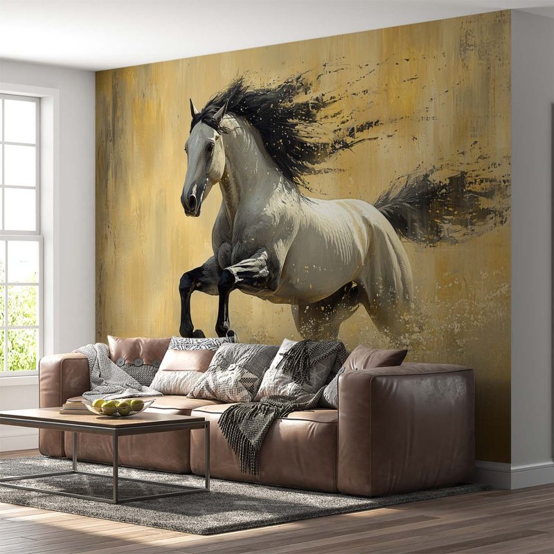 Vloeiend in geel en zwart galoppeert dit paard door de ruimte, zijn manen wapperen wild in de wind. De realistische details en dramatische kleuren brengen pure energie en vrijheid in je interieur. Perfect voor een statement muur die dynamiek en natuurlijke kracht uitstraalt.
