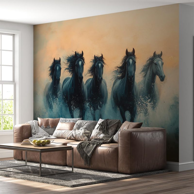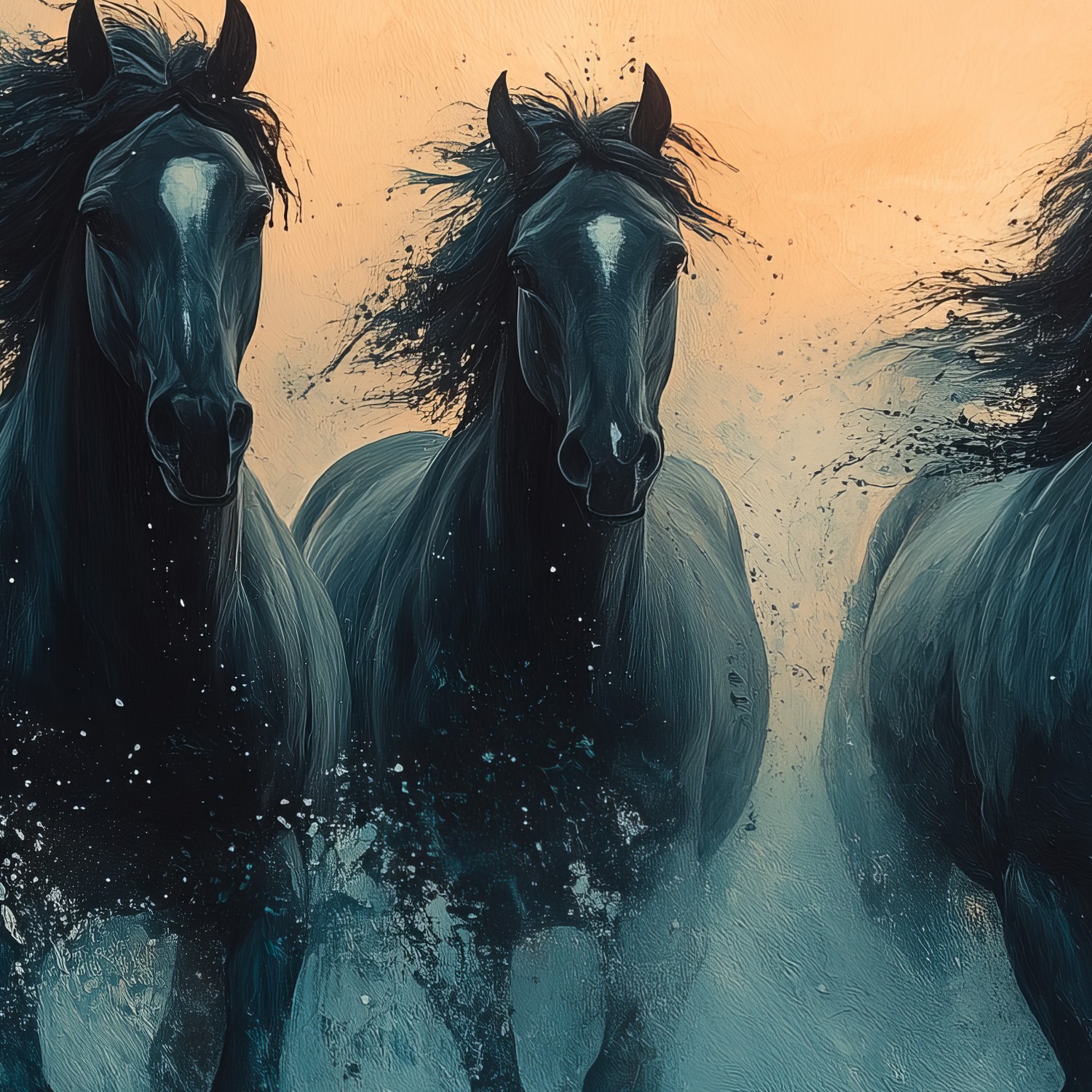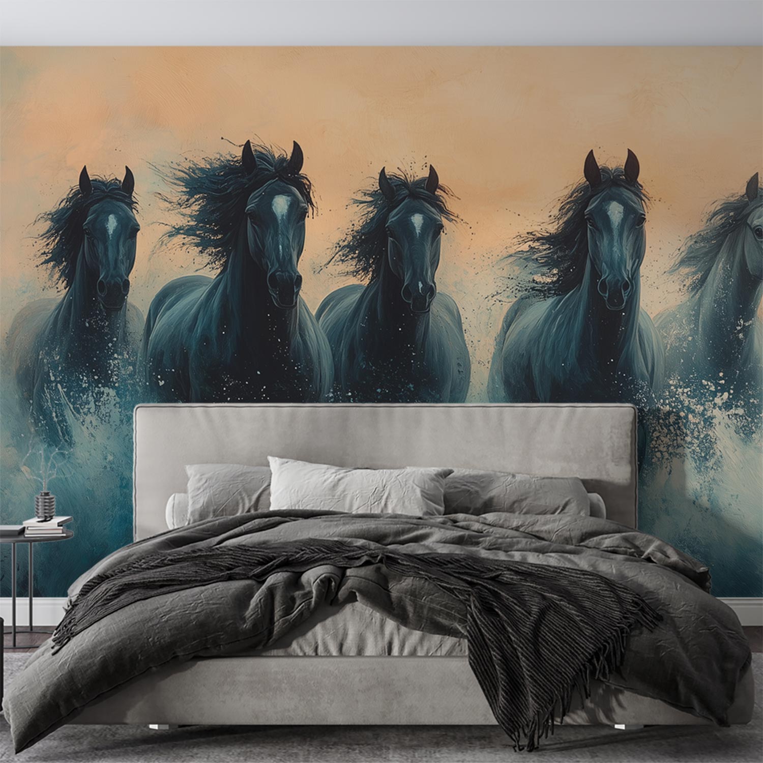 Vijf krachtige paarden stormen door het water, hun zwartwitte vachten contrasterend met het spetterende blauw en oranje van de lucht. Deze bevroren beweging brengt pure energie en vrijheid in je ruimte. Het dynamische tafereel trekt meteen de aandacht en voegt een avontuurlijke, levendige sfeer toe aan elke muur. Perfect voor wie verlangt naar drama en actie in het interieur.