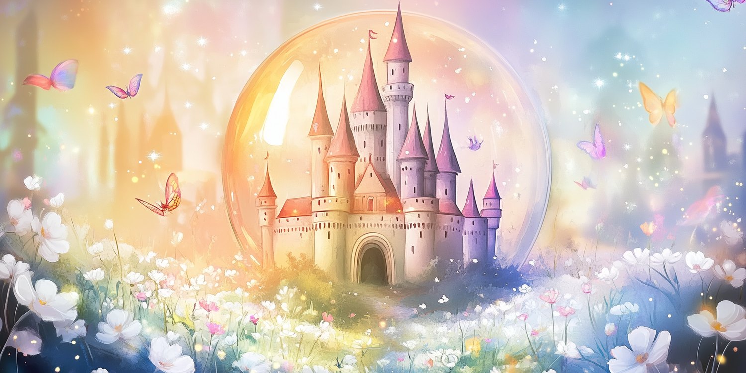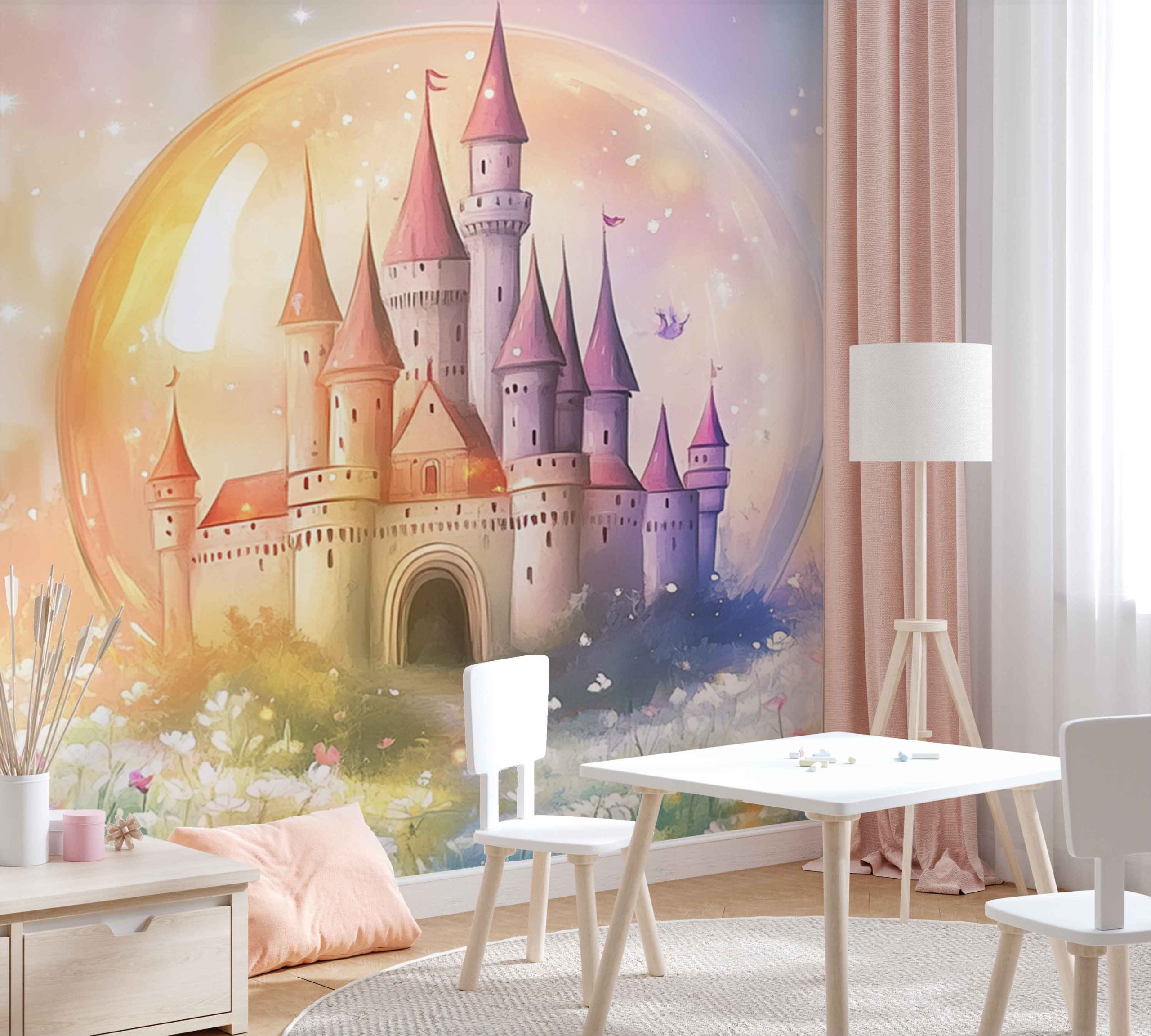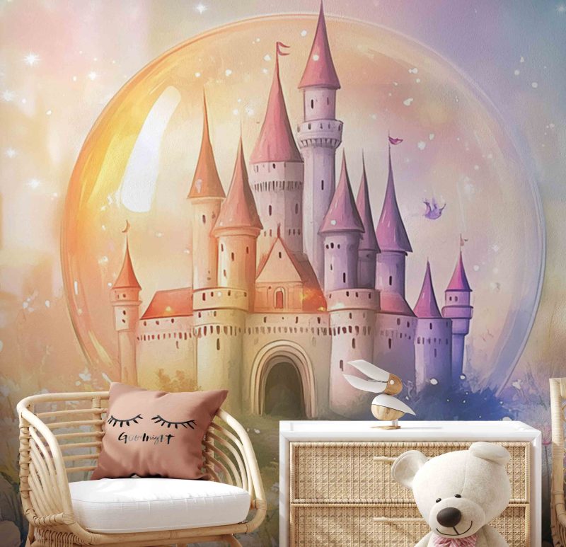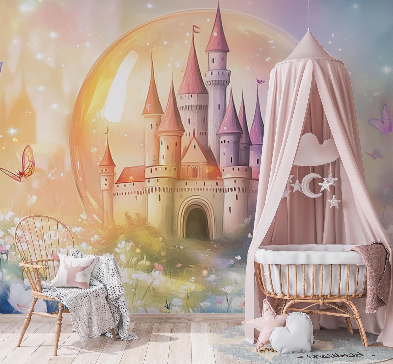 Betoverend roze, blauw en geel dansen over de muren! In een glazen koepel torent een sprookjeskasteel boven een zee van bloemen waar vlinders dartelen. Dit magische tafereel wekt pure verwondering op en voedt de fantasie – alsof de kamer zelf een portaal naar avontuur wordt. Perfect voor dromerige momenten en het creëren van een veilige, vrolijke wereld waar kinderfantasie tot leven komt.