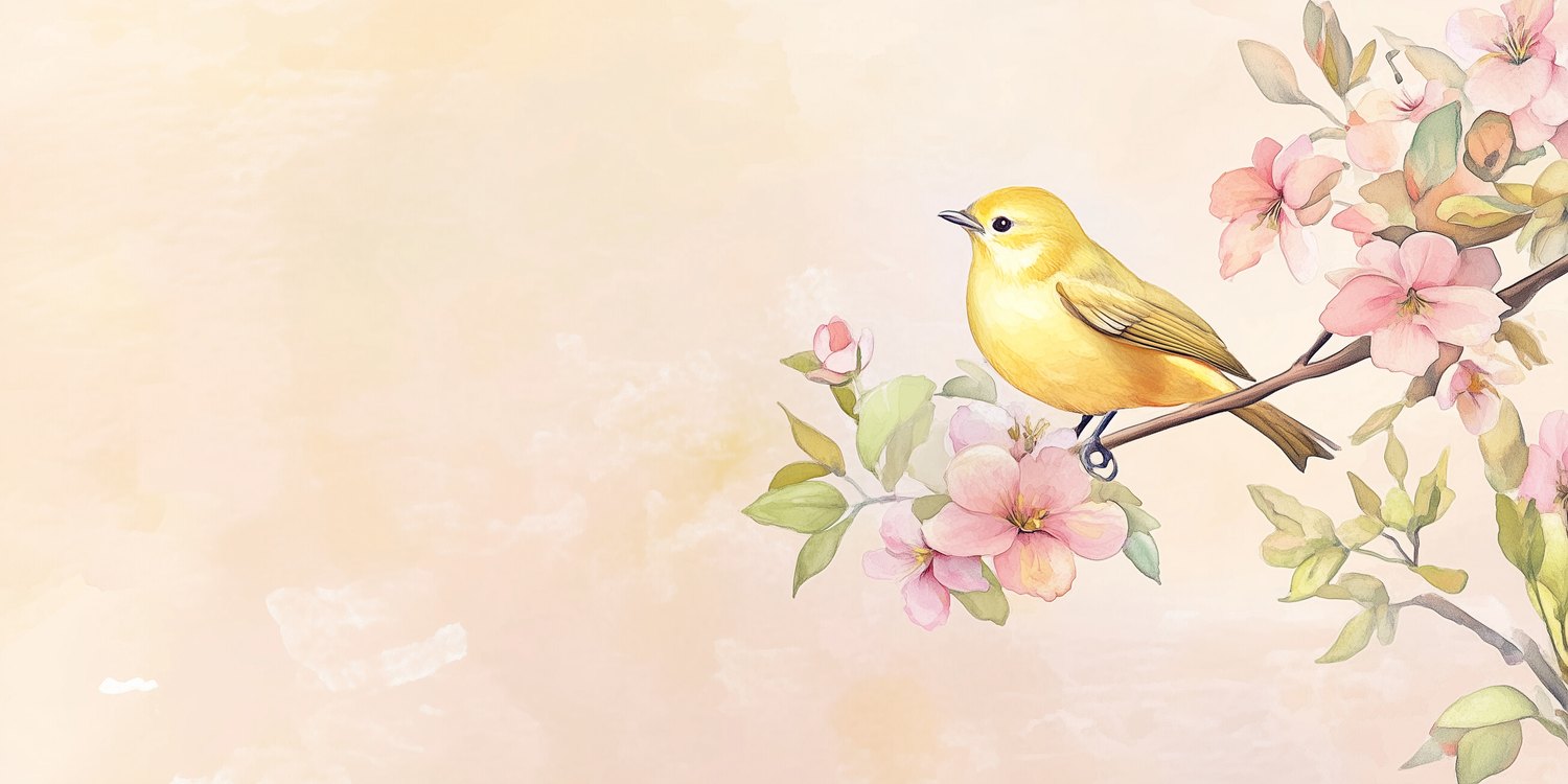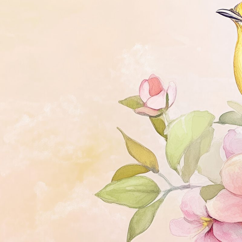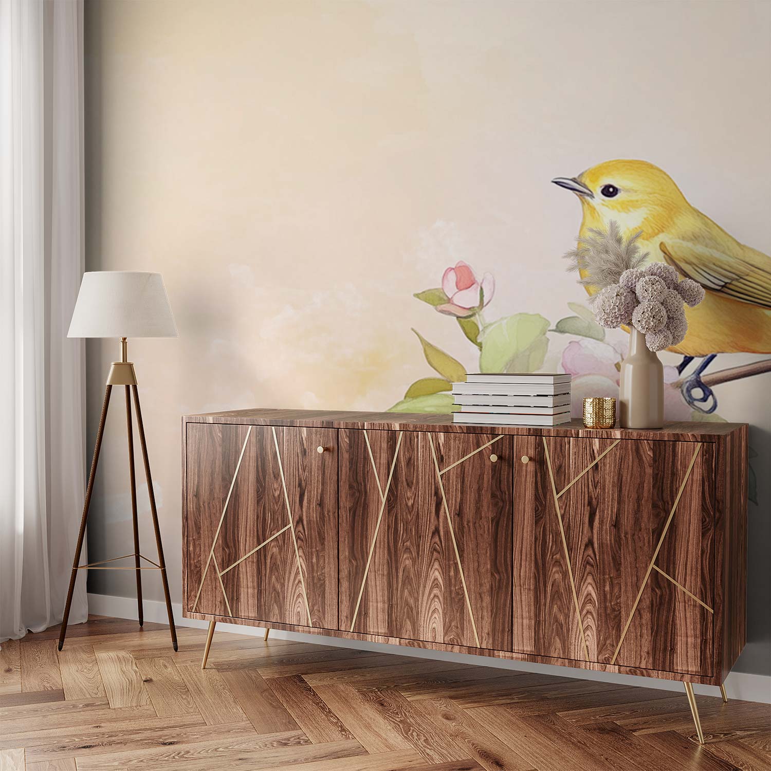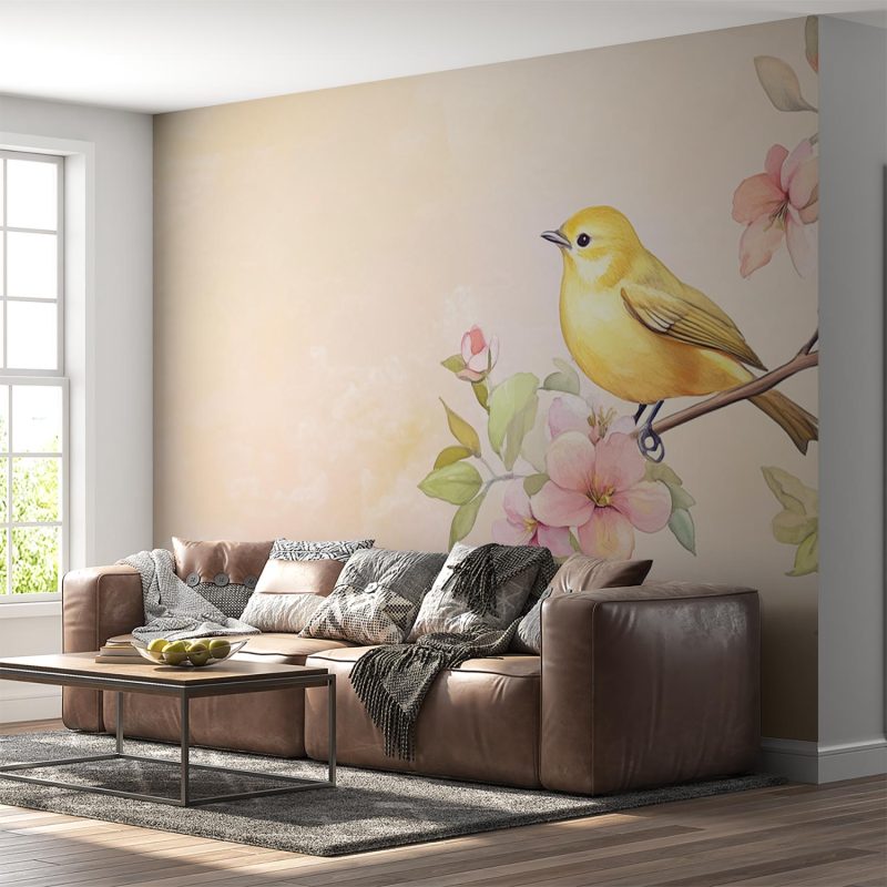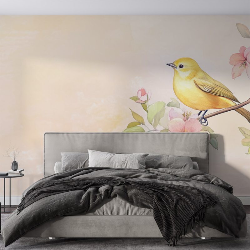 Zacht golvende takken tooien zich met tere roze bloesems, waar een levendige gele vogel zich nestelt. Zijn veren glanzen zacht in het licht, een speels contrast tegen de perzikkleurige achtergrond. Dit behang brengt de serene harmonie van de natuur binnen, perfect voor een rustgevende sfeer in elke leefruimte.