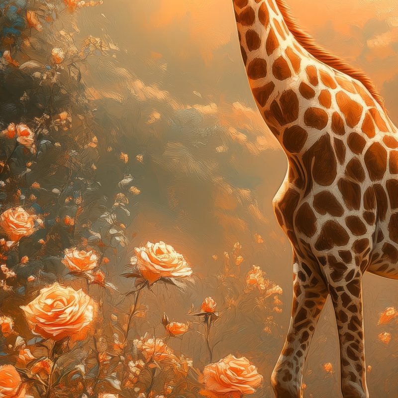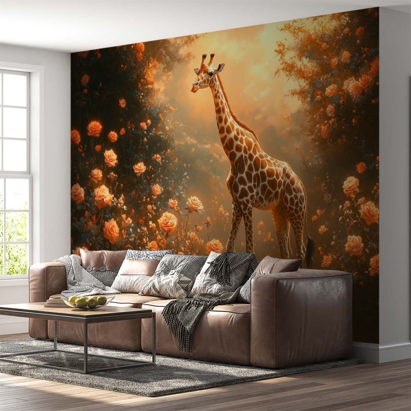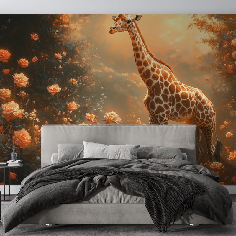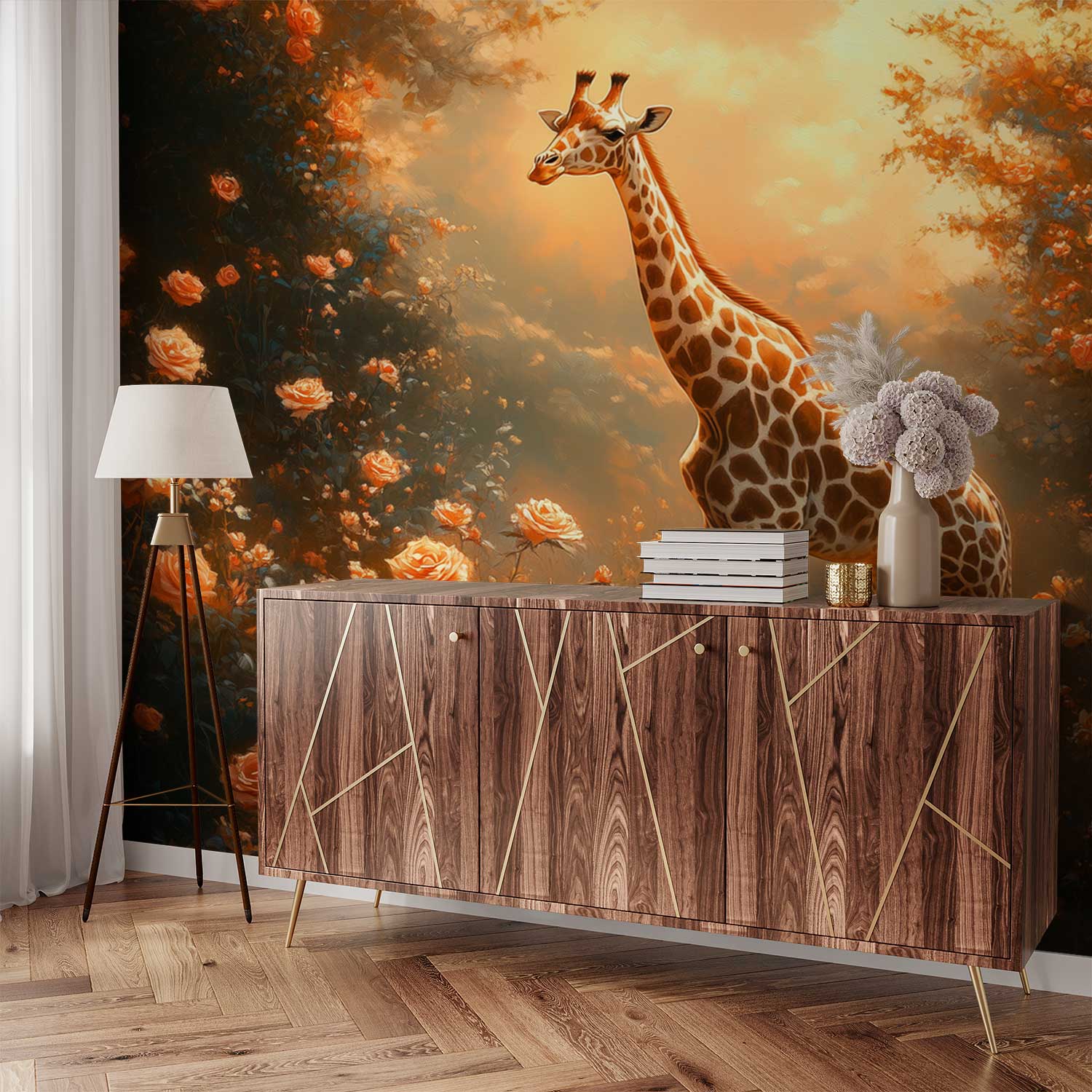 Oranje rozen golven rond een giraffe in een weelderig bloemenveld. De ondergaande zon werpt een gouden gloed over dit serene tafereel, waar warme tinten een harmonieuze sfeer creëren. Dit levendige behang brengt de rustgevende energie van de natuur naar binnen en transformeert elke ruimte in een oase van kleur en harmonie.