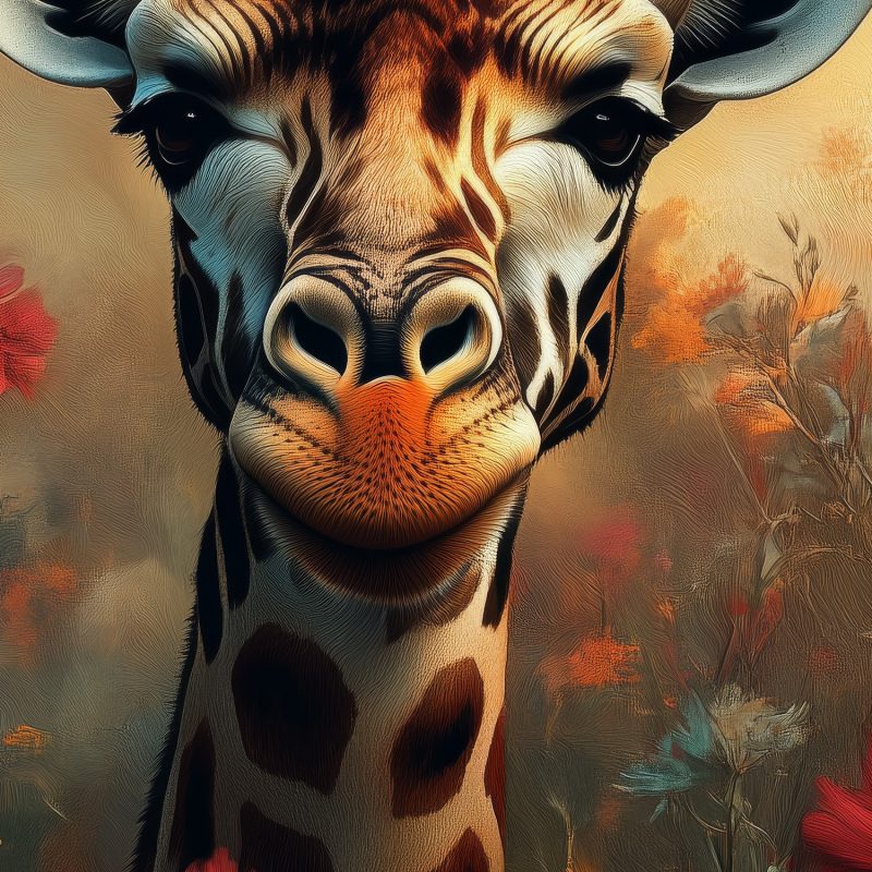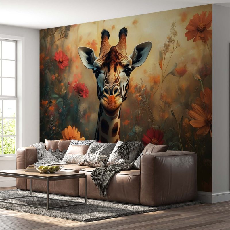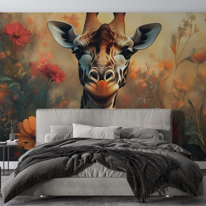 Verrast door een giraf die zich sereen tussen een zee van warme bloemen ontvouwt. Zijn rustgevende blik weerspiegelt de harmonie van de natuur, omringd door levendige rode en oranje tinten. Dit behang brengt een vleugje serene wildernis in huis, perfect voor een rustgevende en stijlvolle accentmuur die elke ruimte transformeert.