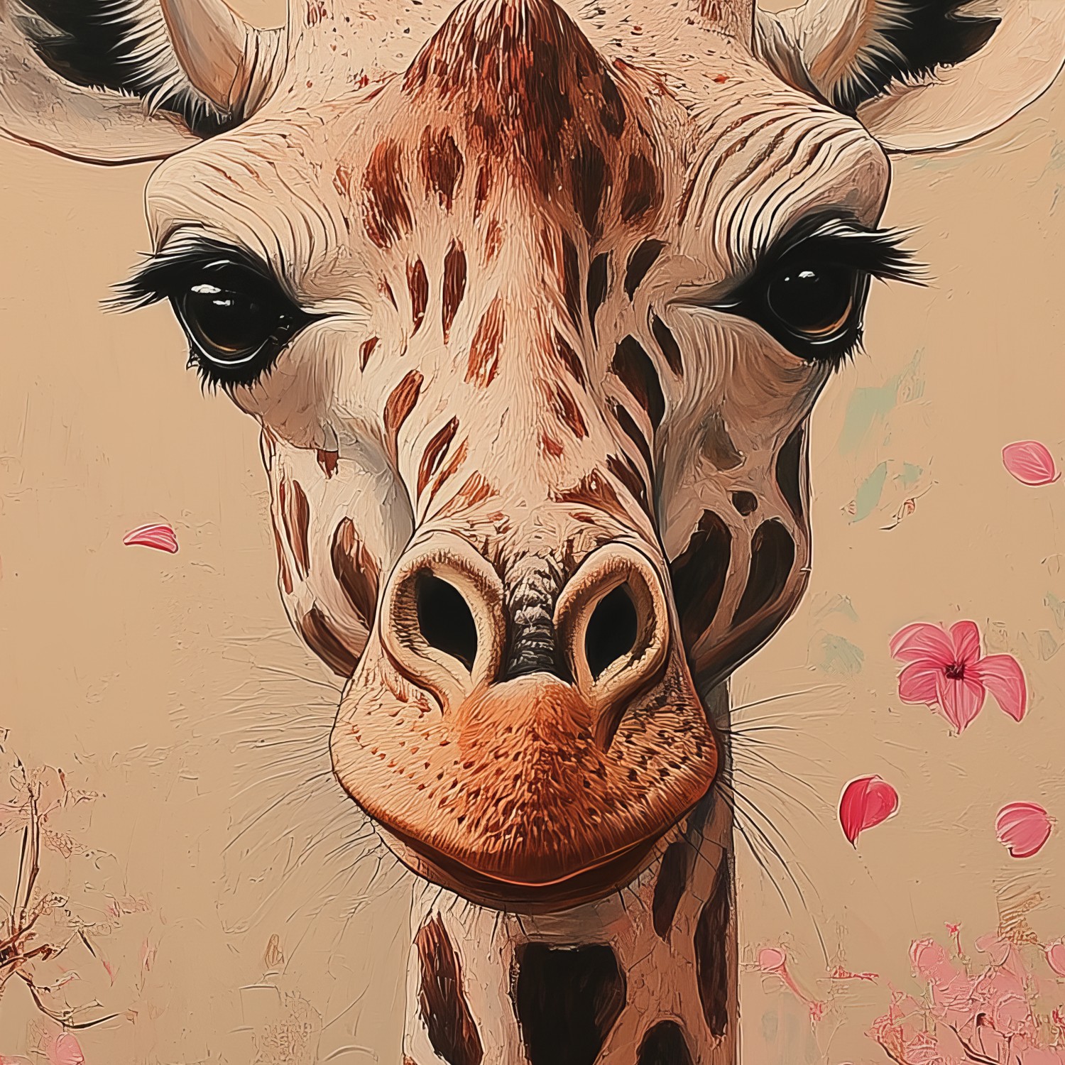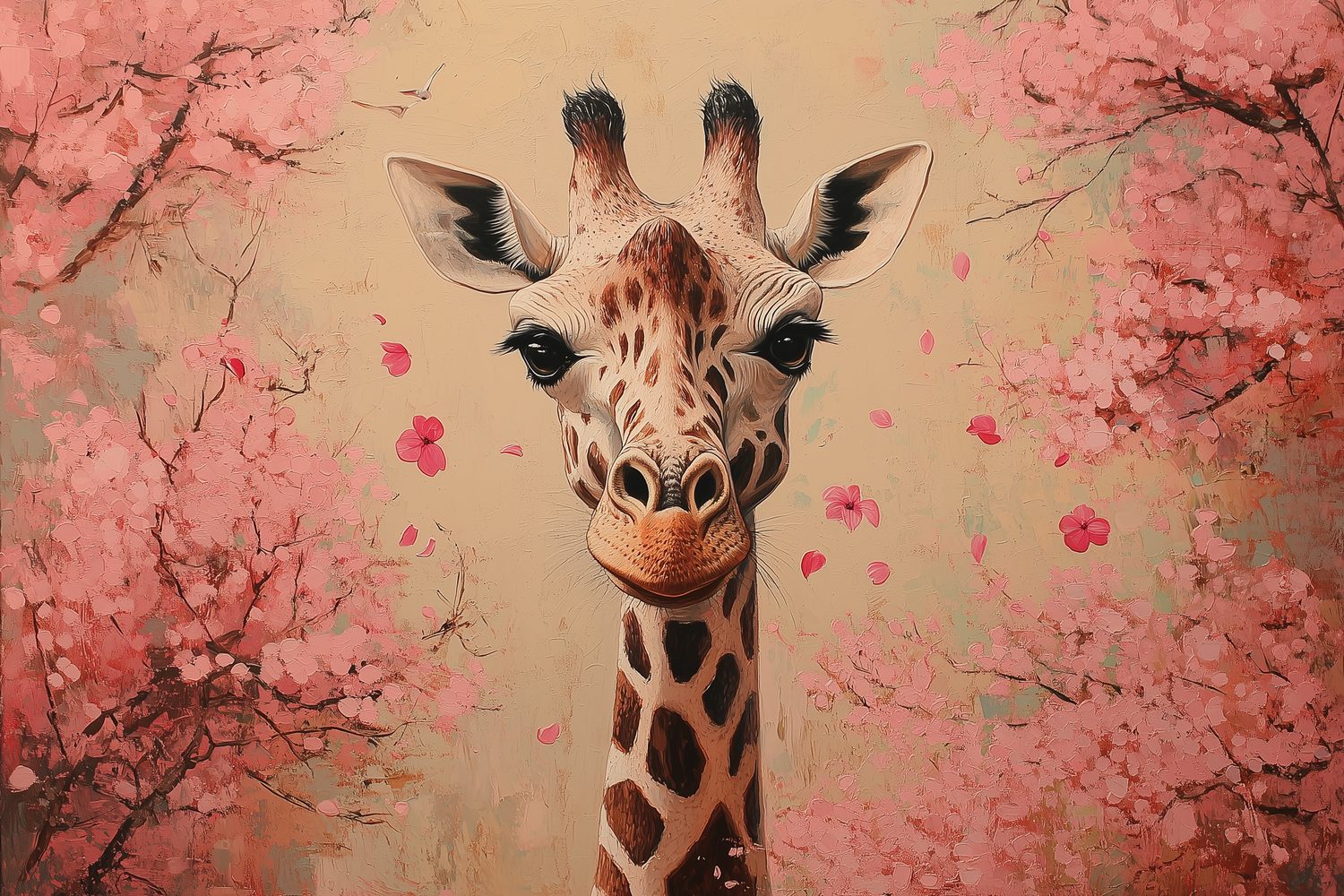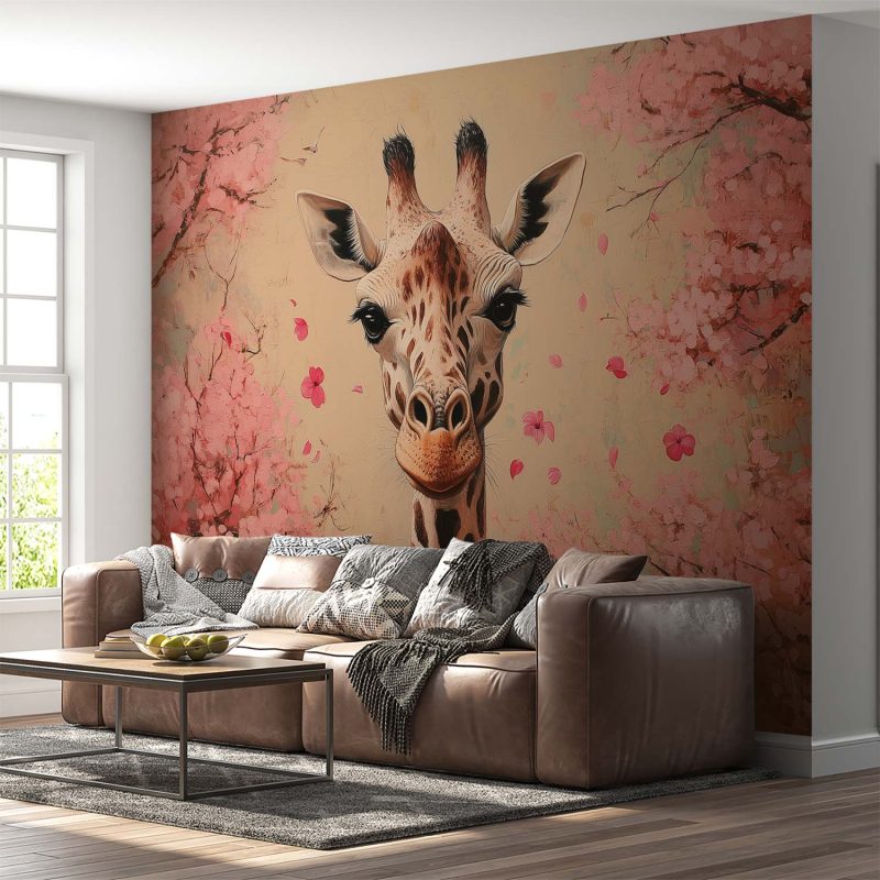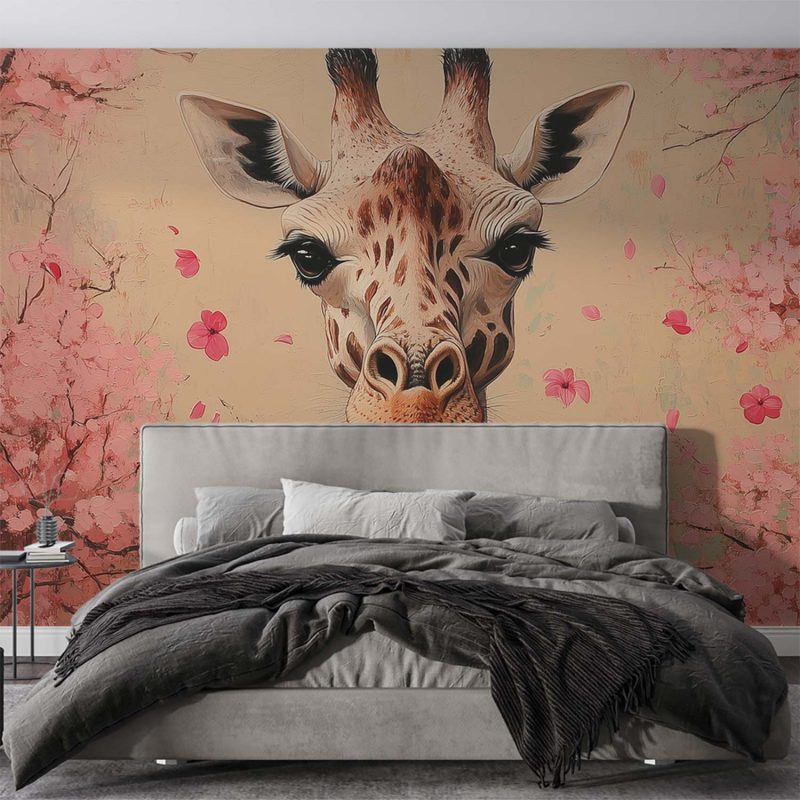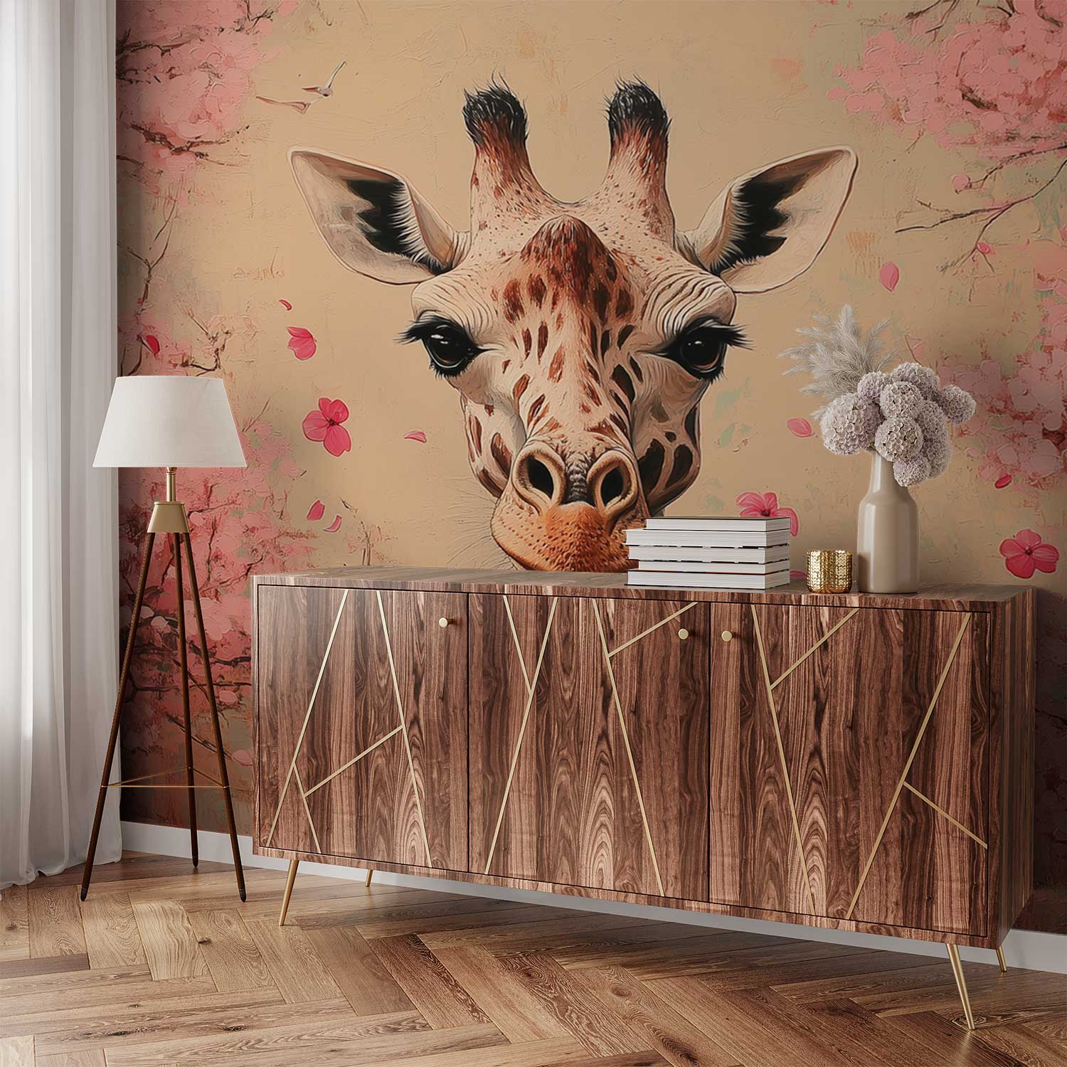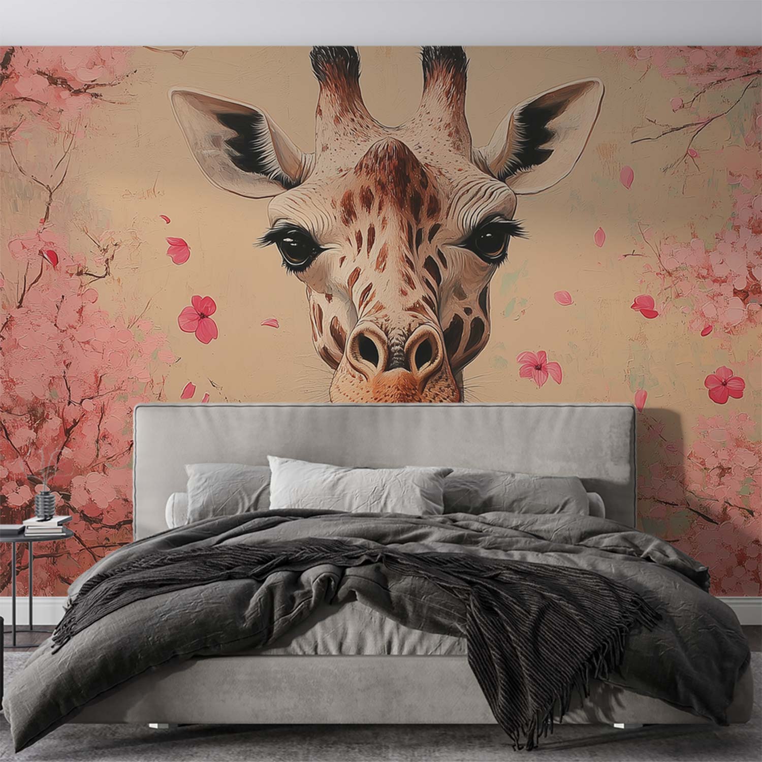 Zachte beige tinten omarmen een sierlijke giraf, wiens gevlekte nek elegant boven een zee van roze bloesems reikt. Dit levendige tafereel brengt de sereniteit van de savanne in huis, waar warme kleuren en organische vormen rust uitstralen. Perfect voor een accentmuur die zowel avontuur als harmonie toevoegt, en elke ruimte transformeert tot een oase van natuurlijke schoonheid.