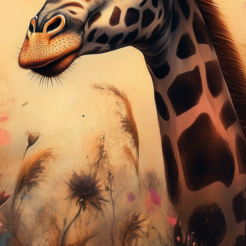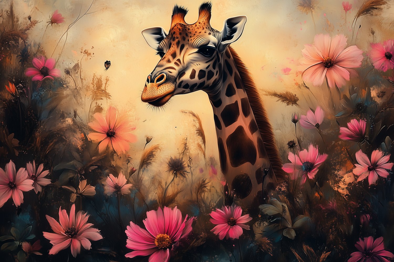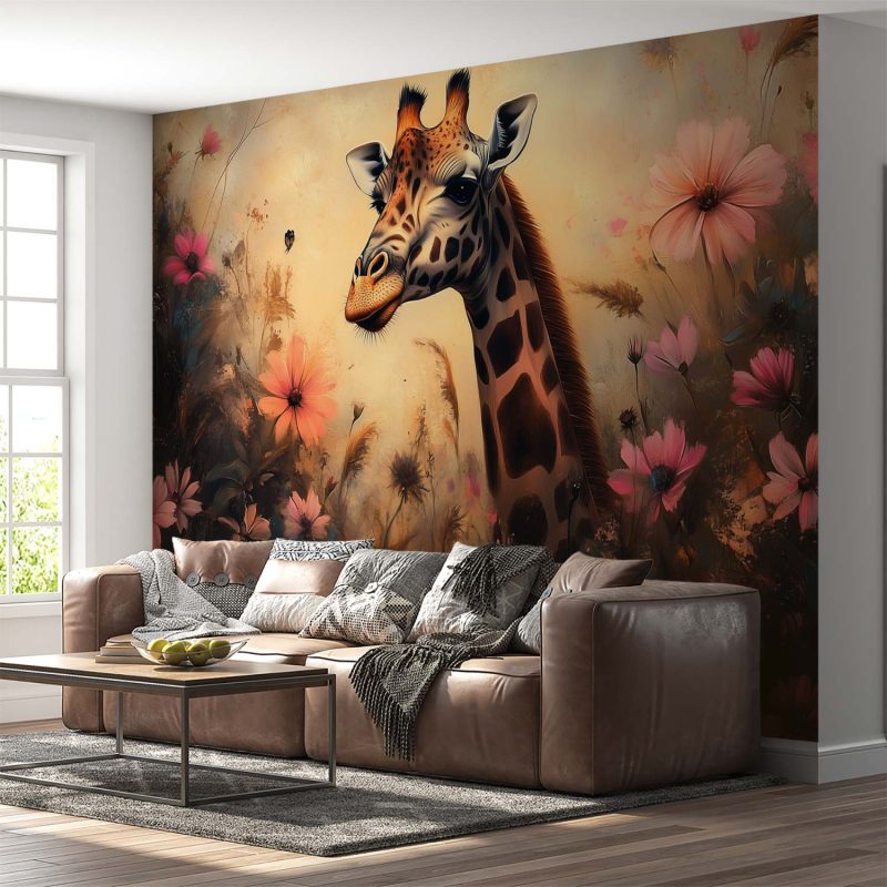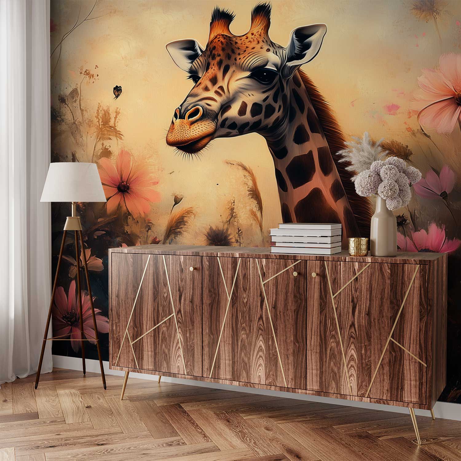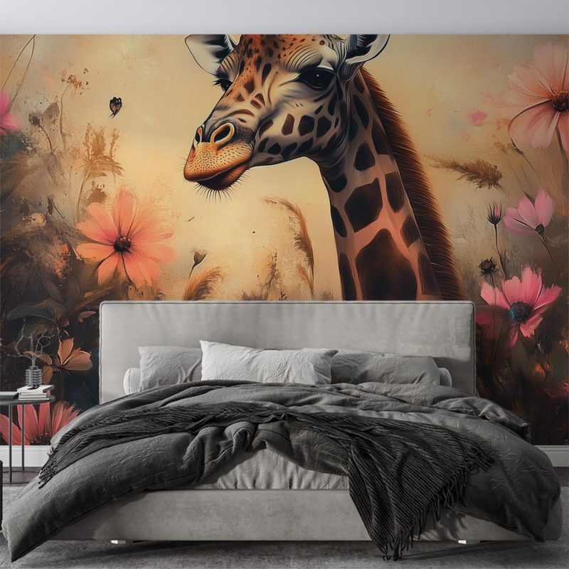 Zachte roze en oranje tinten dansen rond een sierlijke giraf die zich elegant tussen bloeiende madeliefjes en rozen wendt. Dit levendige tafereel straalt pure vreugde uit en brengt meteen een speelse, warme sfeer in elke ruimte. Zijn kunstzinnige charme maakt muren tot een betoverend middelpunt vol positieve energie.