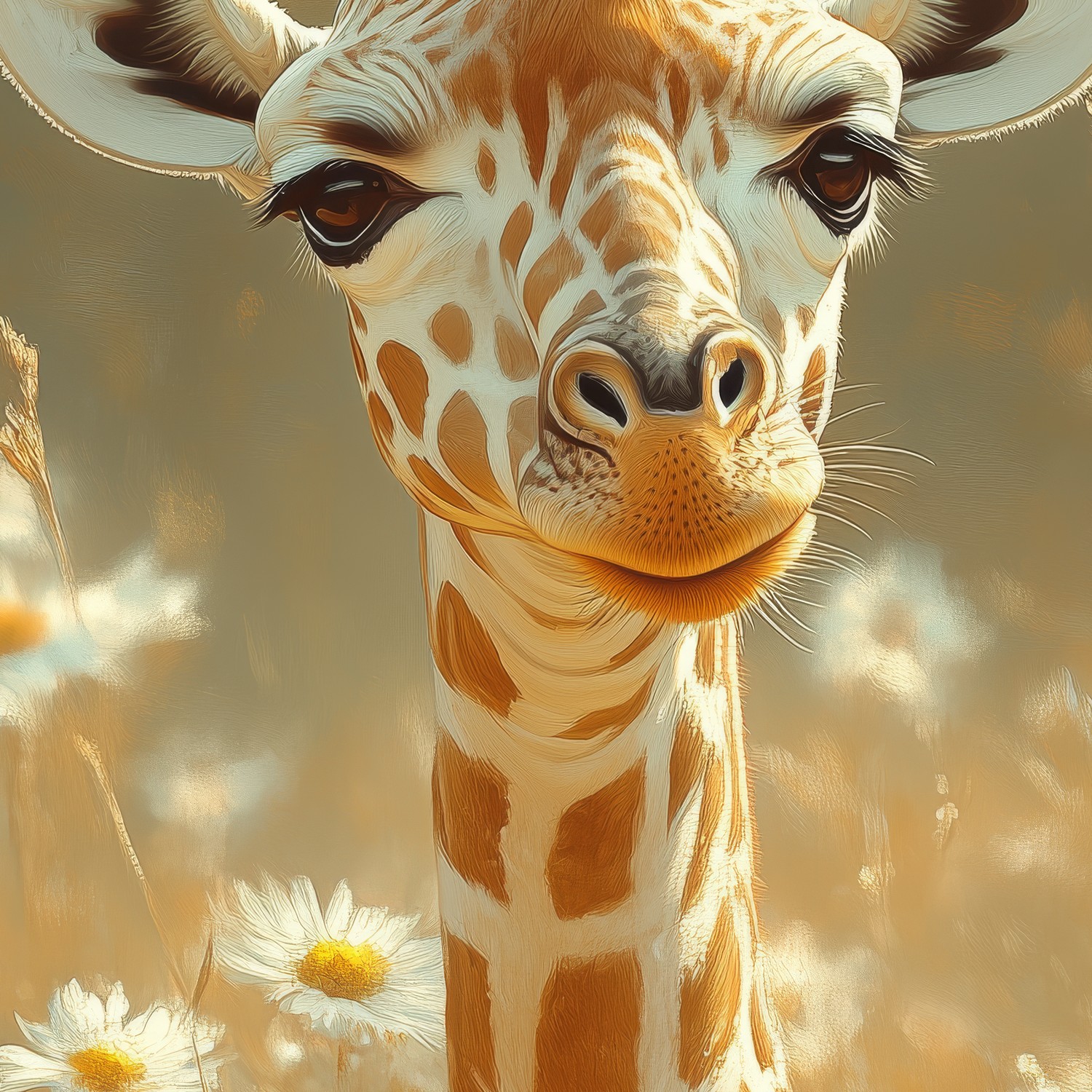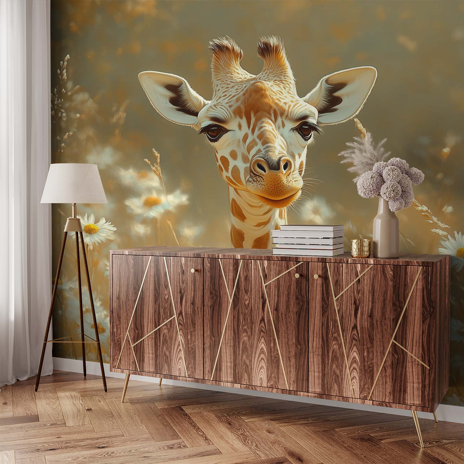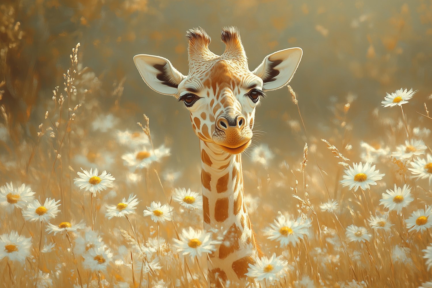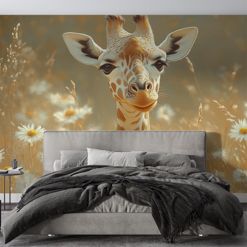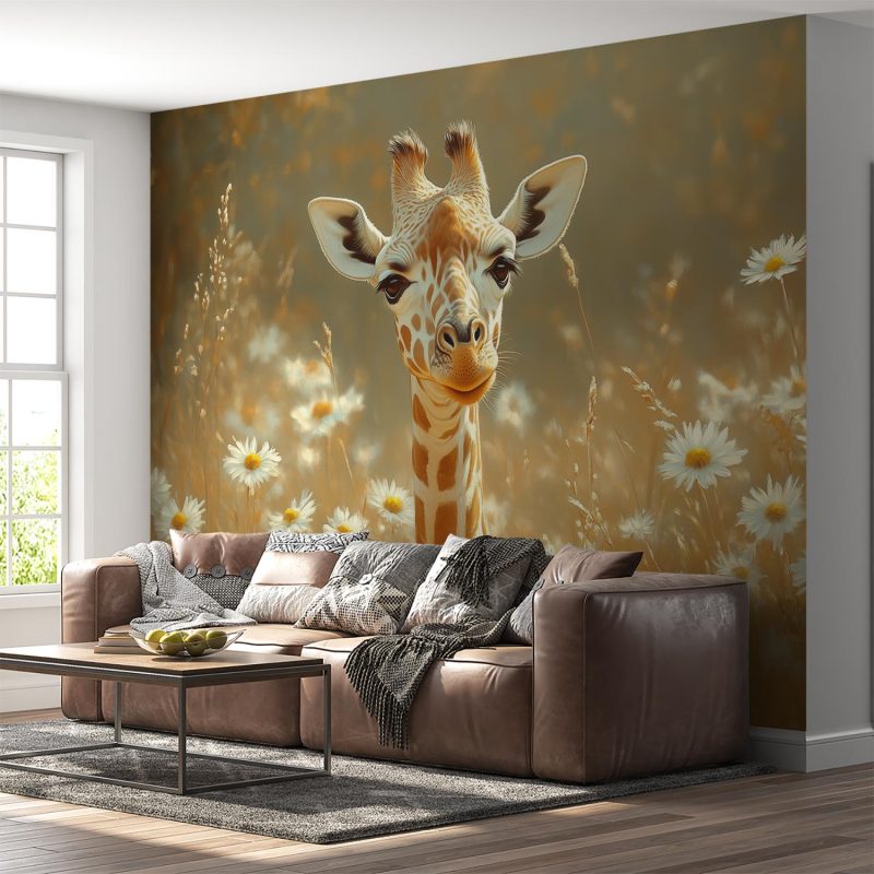 Zonnig geel en wit dansen rond de elegante giraf in een zee van madeliefjes. Zijn speelse blik weerspiegelt de vrolijke sfeer, terwijl de wazige achtergrond alle aandacht naar dit charmante tafereel leidt. Brengt een vleugje speelse sereniteit in je interieur, perfect voor een opgewekte en stijlvolle ruimte die van natuur en lichtheid houdt.